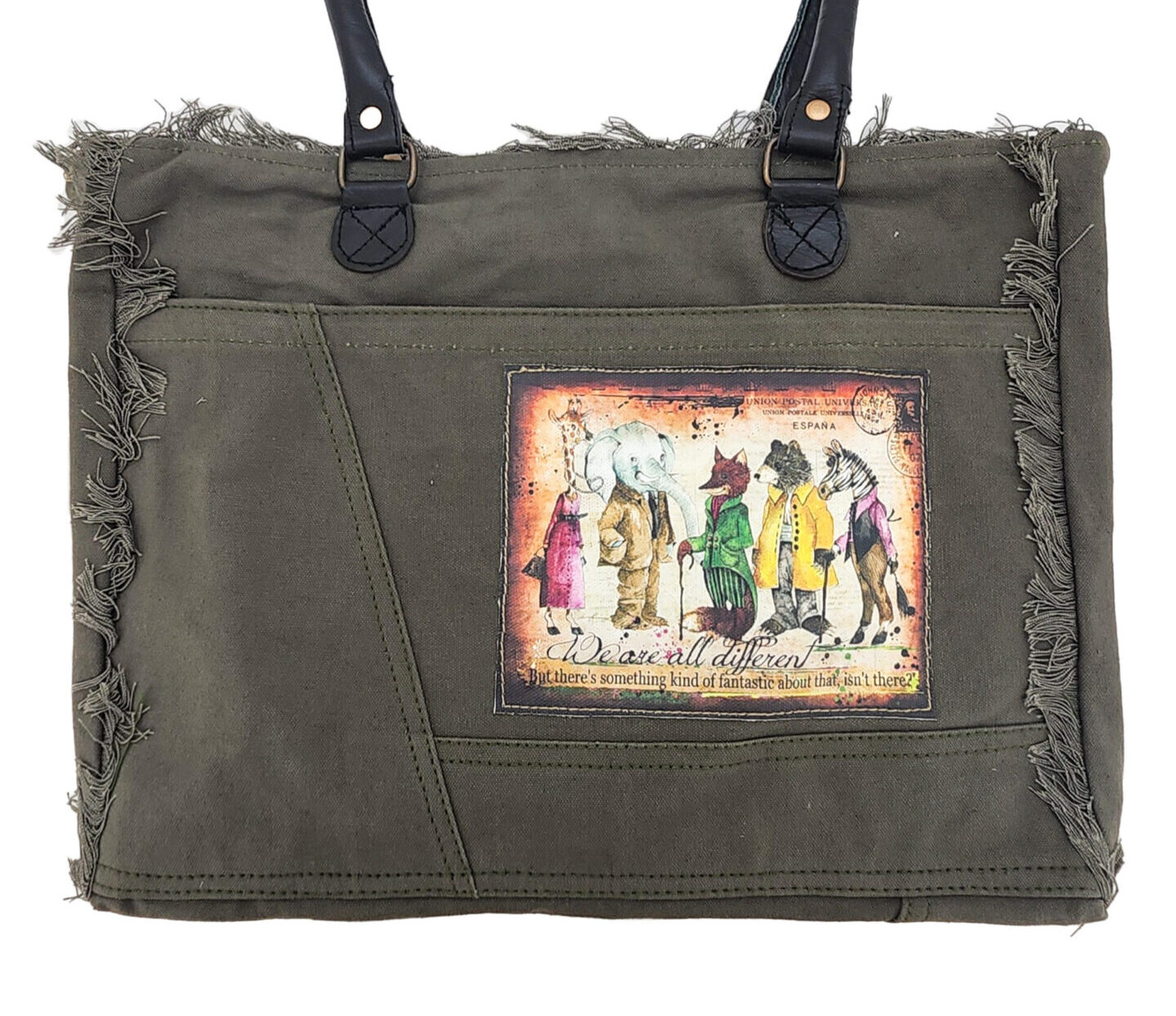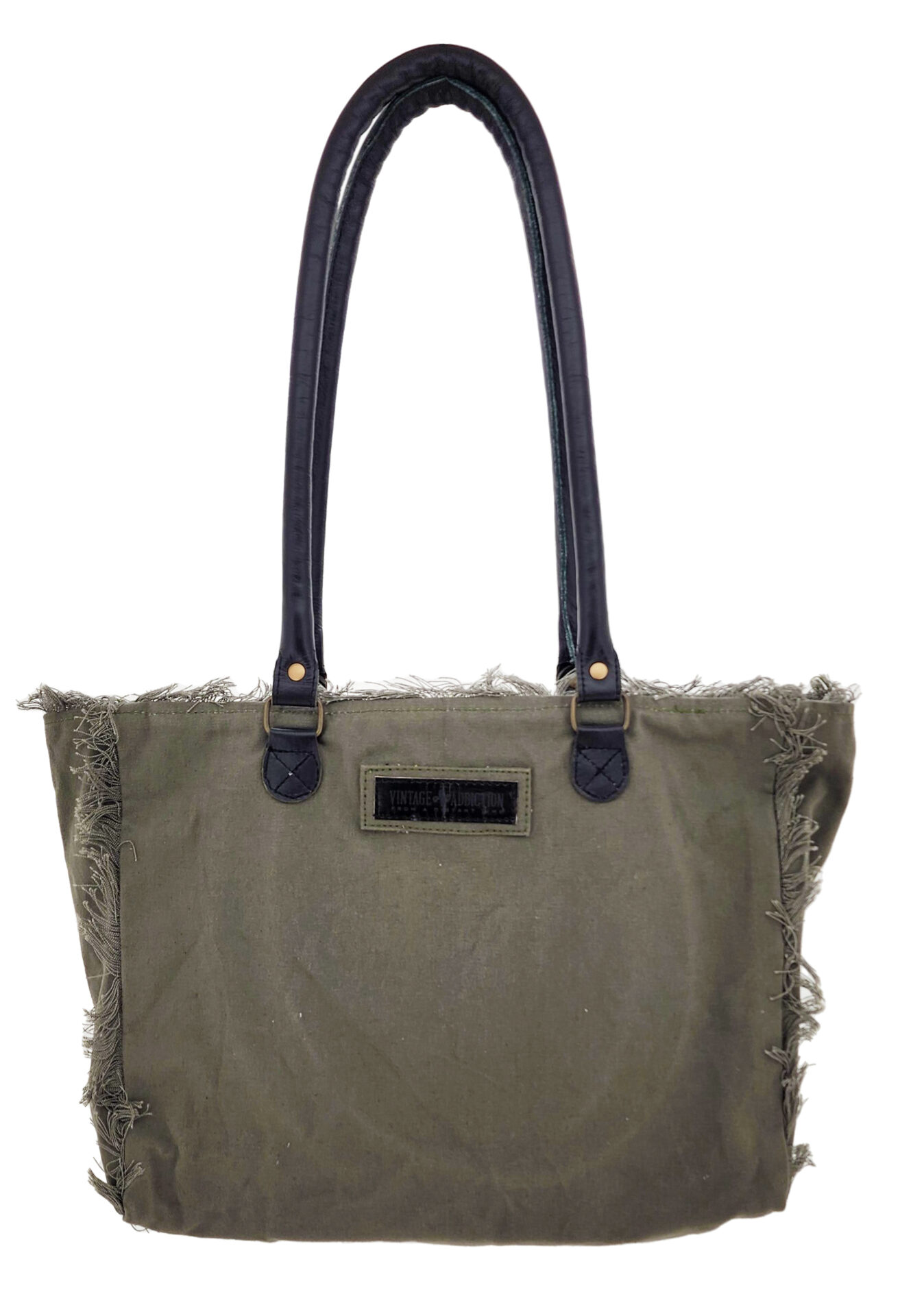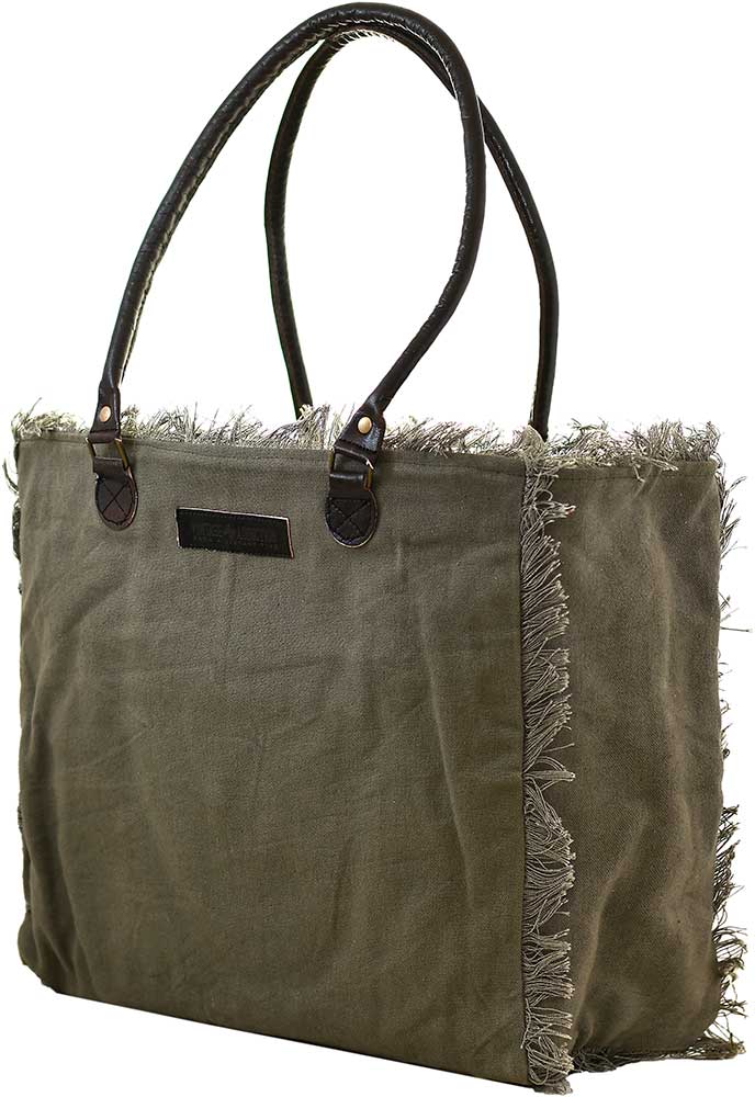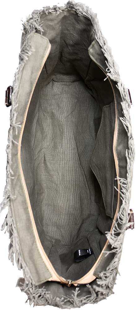 Our gorgeous canvas tote with fringe is handcrafted and features a vintage print patch. It has a zipper top closure, 1 interior pocket,1 large exterior pocket, is fully lined, and has leather handles. NOTE: Due to the treatment applied to the fabric, there will be variations in fabric color.
