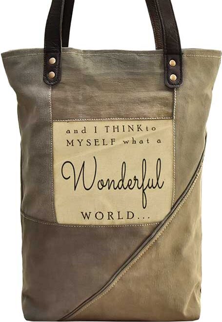 Our recycled military tent tote features an open top with magnetic snap closure, 1 interior pocket, a vintage-style print on the front and is fully lined.