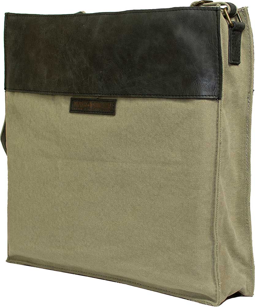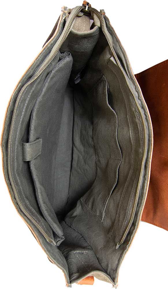 Handcrafted with canvas and extensive leather trim. Features top zipper closure, 1 exterior front zip pocket, 2 interior open pouches, 1 protective cushioned compartment for electronics, and an adjustable shoulder strap. Fully Lined.