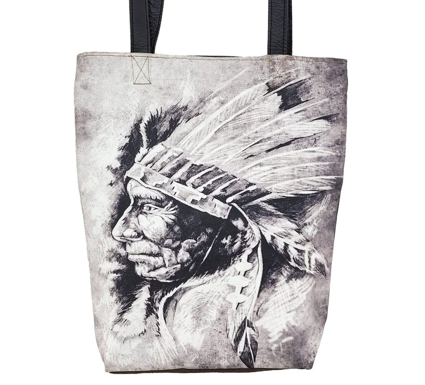 Our recycled military tent tote features leather handles and an open top with magnetic snap closure, 1 interior pocket, a vintage-style print on the front and is fully lined.