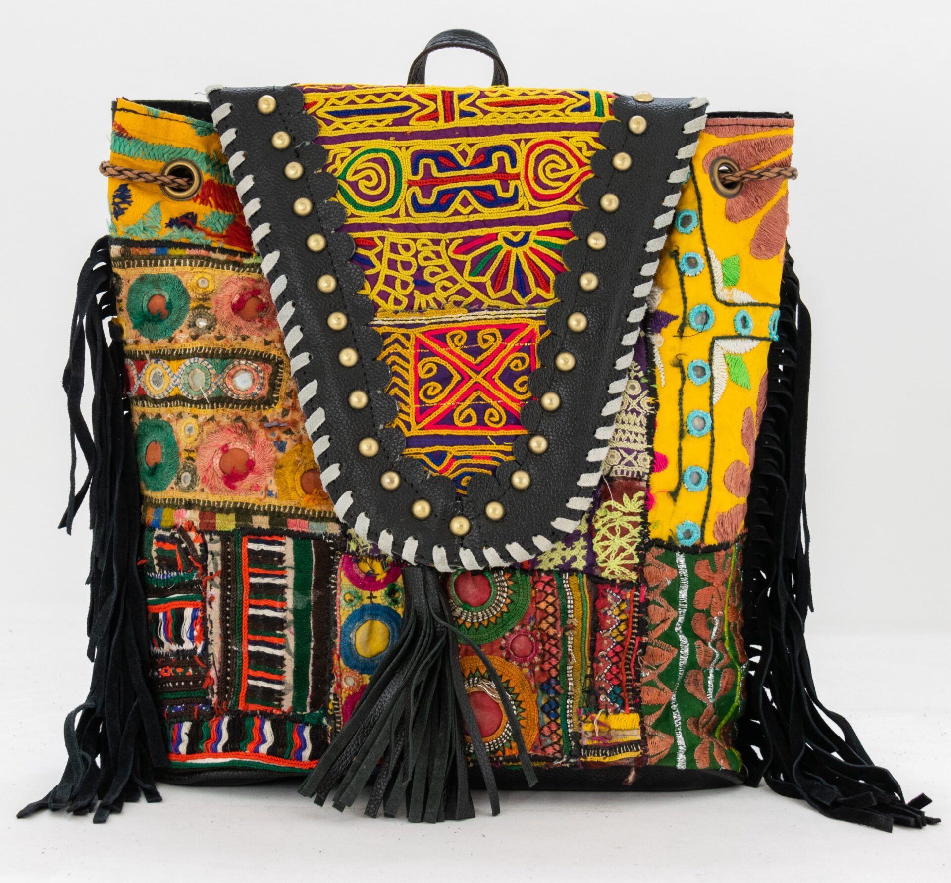Black Leather Vintage Fabric Backpack w Fringe-017