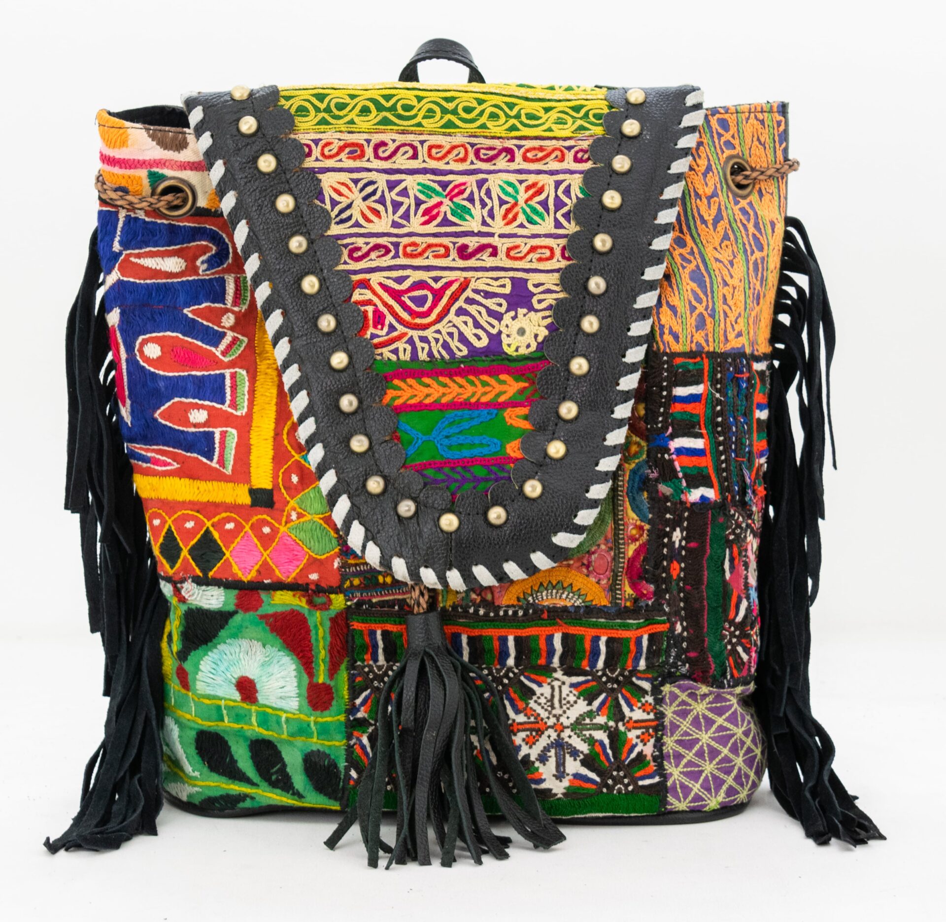 Black Leather Vintage Fabric Backpack w Fringe-024