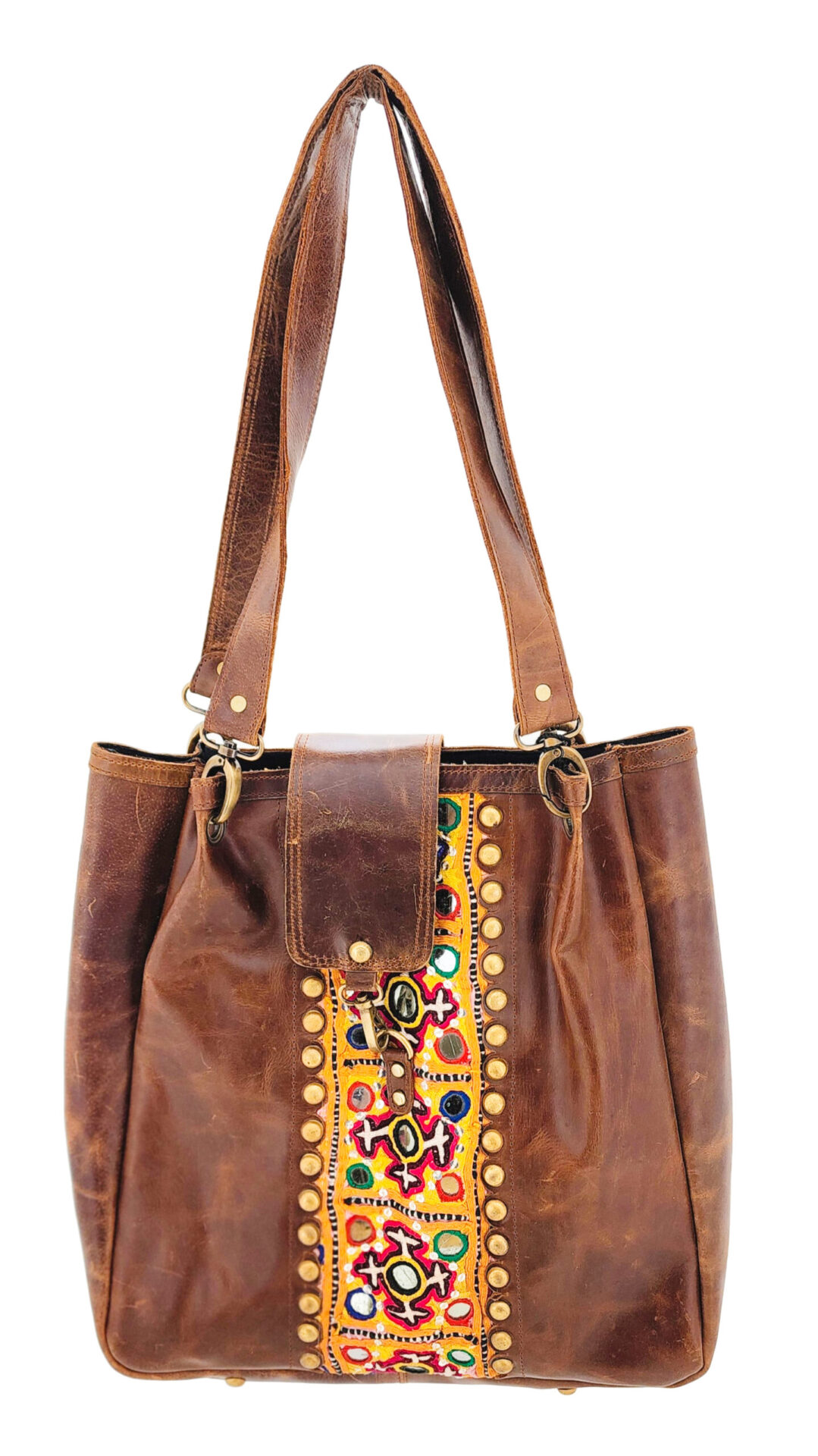 This beautiful leather shoulder bag has so many features that you will fall in love with each and every one. The vintage fabric embellishment adds character and charm to make it one of a kind. There are Round Head Stud Feet on the bottom.