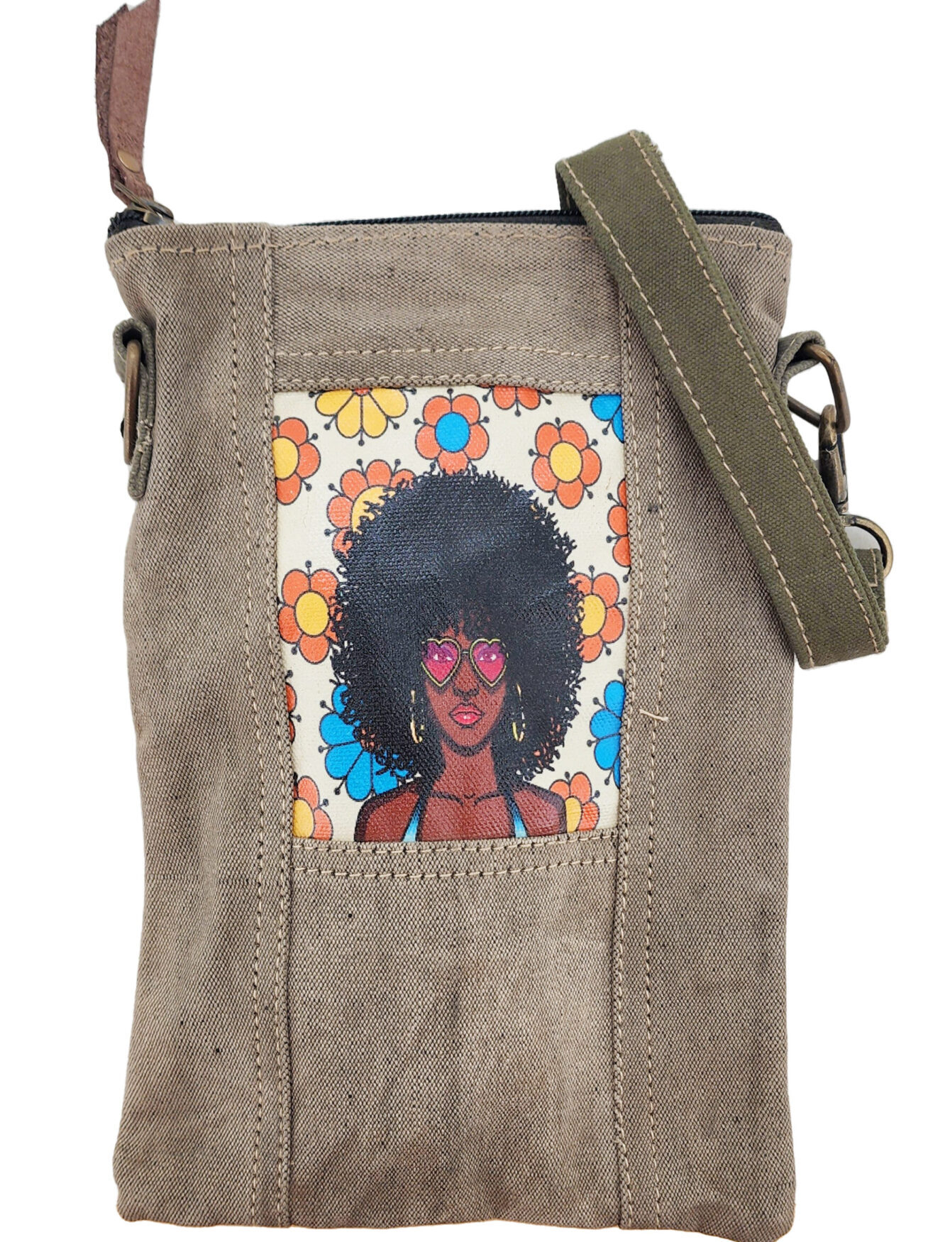 Cute small recycled military tent crossbody adorned with a print patch on the front. Perfect to carry the very basics!