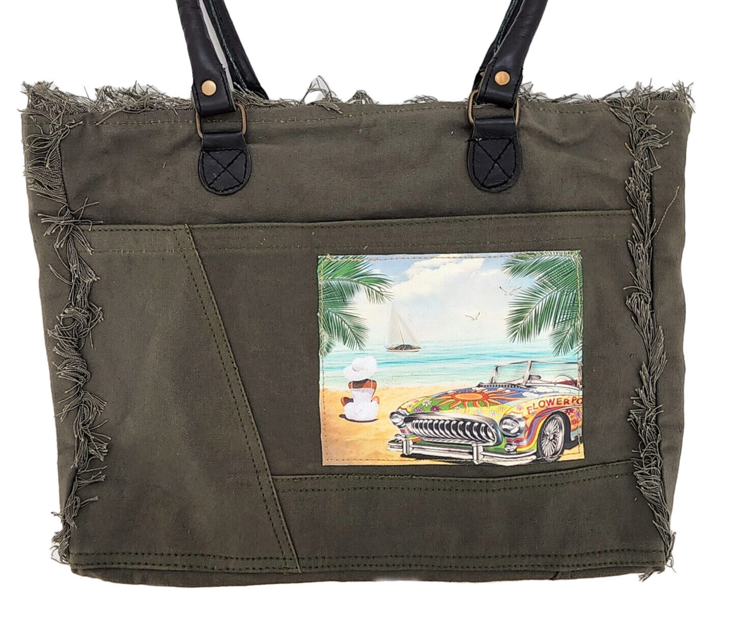Our gorgeous canvas tote with fringe is handcrafted and features a vintage print patch. It has a zipper top closure, 1 interior pocket,1 large exterior pocket, is fully lined, and has leather handles. NOTE: Due to the treatment applied to the fabric, there will be variations in fabric color.