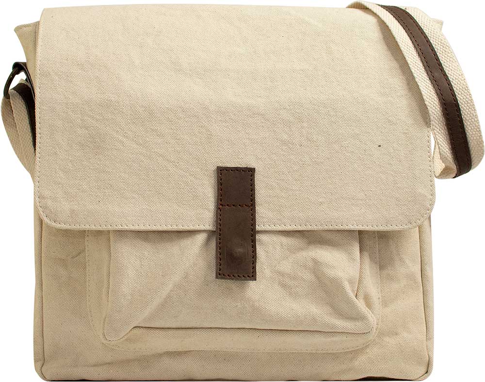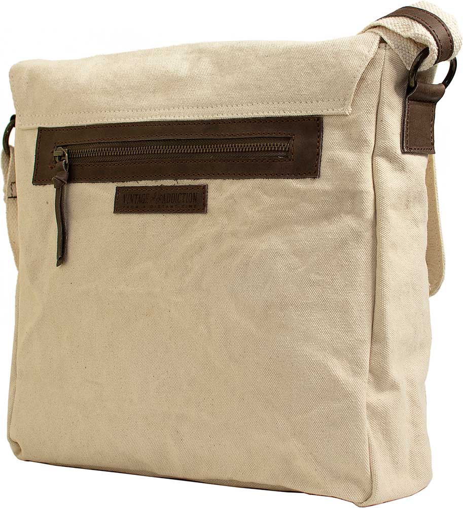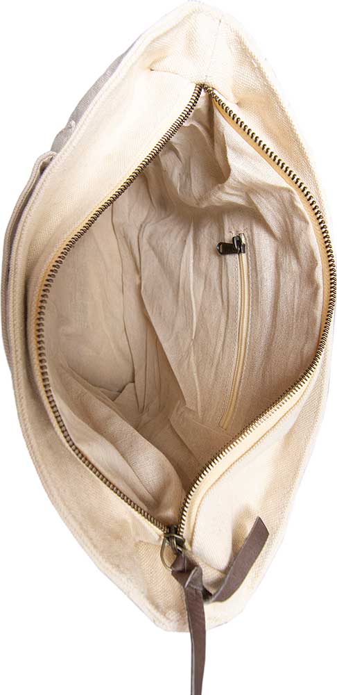 Handcrafted with canvas, features leather trim, 1 exterior front pocket, 1 exterior back zip pocket, main zipper with top over flap, adjustable shoulder strap, and 1 interior zip pocket. Fully lined.