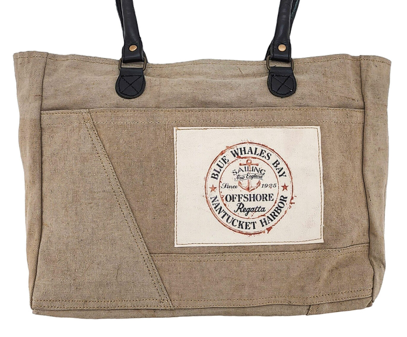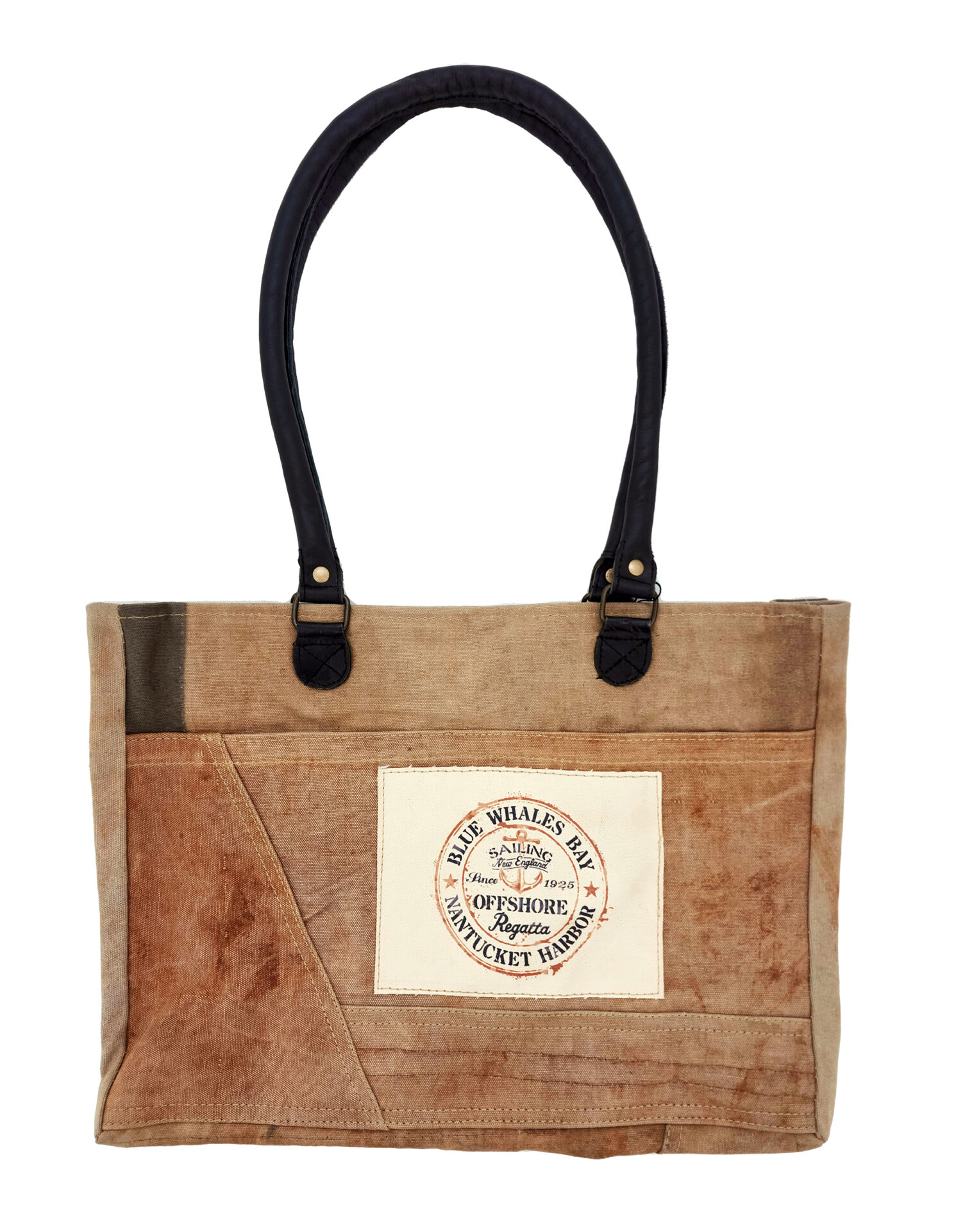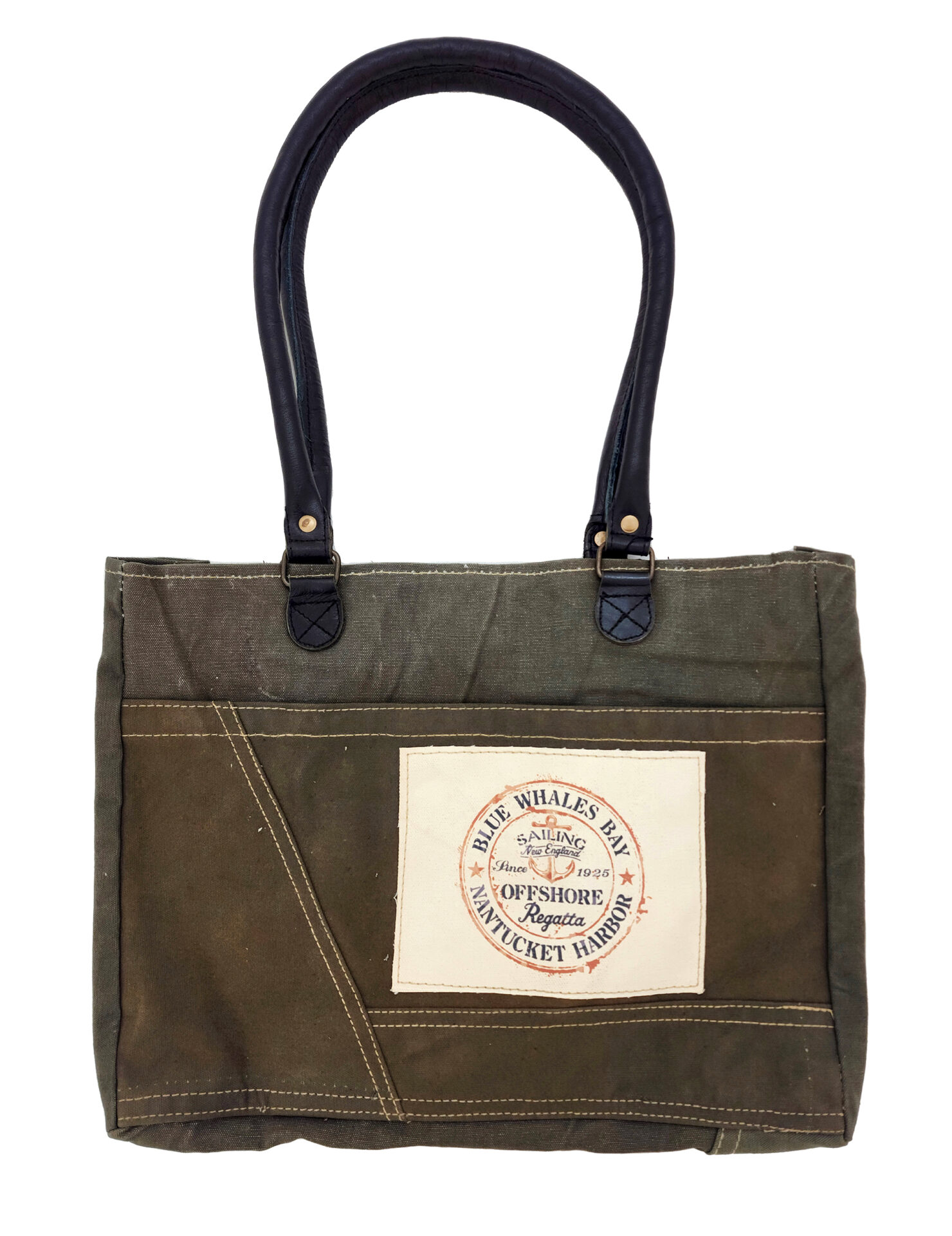 Our unique shoulder bag is handcrafted with authentic recycled military tent with a zipper top, 1 interior pocket,1 large exterior pocket, is fully lined, and has leather handles. Each is adorned with vintage print patches.