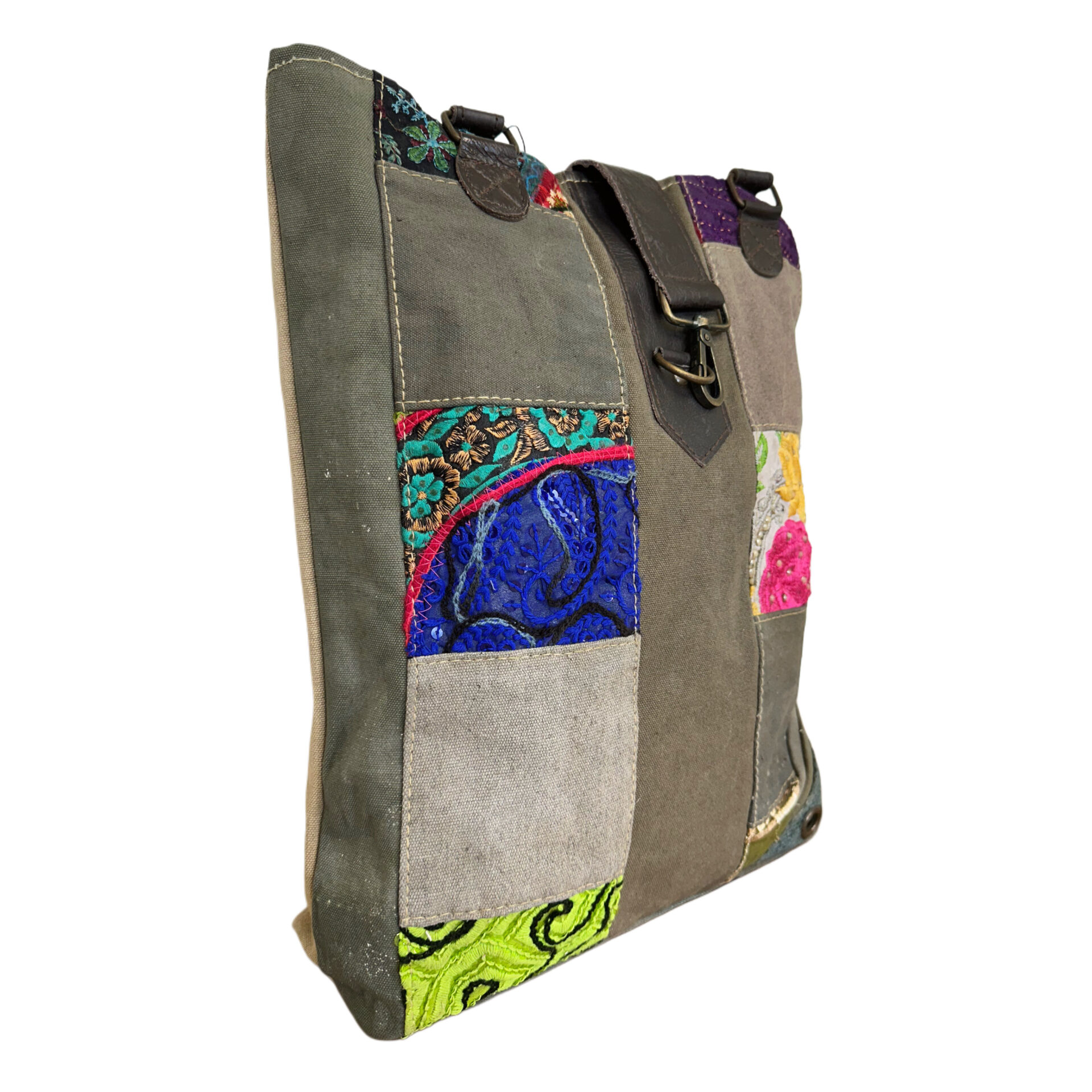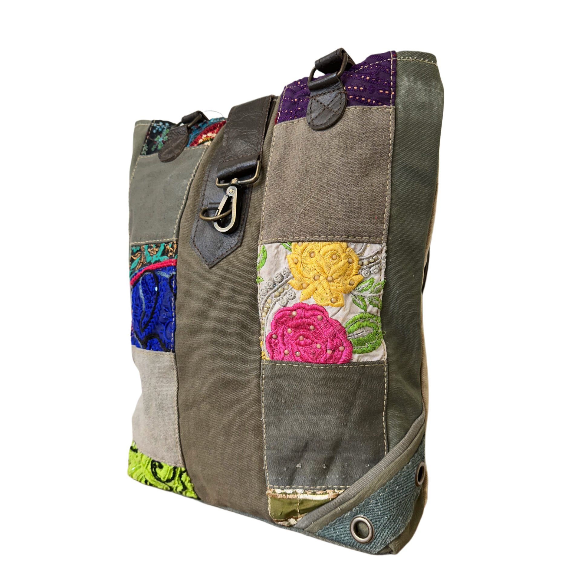 This hand selected recycled military tent tote bag is fully lined with an interior pocket. It is adorned with a patchwork and vintage fabric design on the front and has durable leather handles and trim. Dimensions: 14.5″W x 4″D x 15.5″H /Shoulder Drop 12″