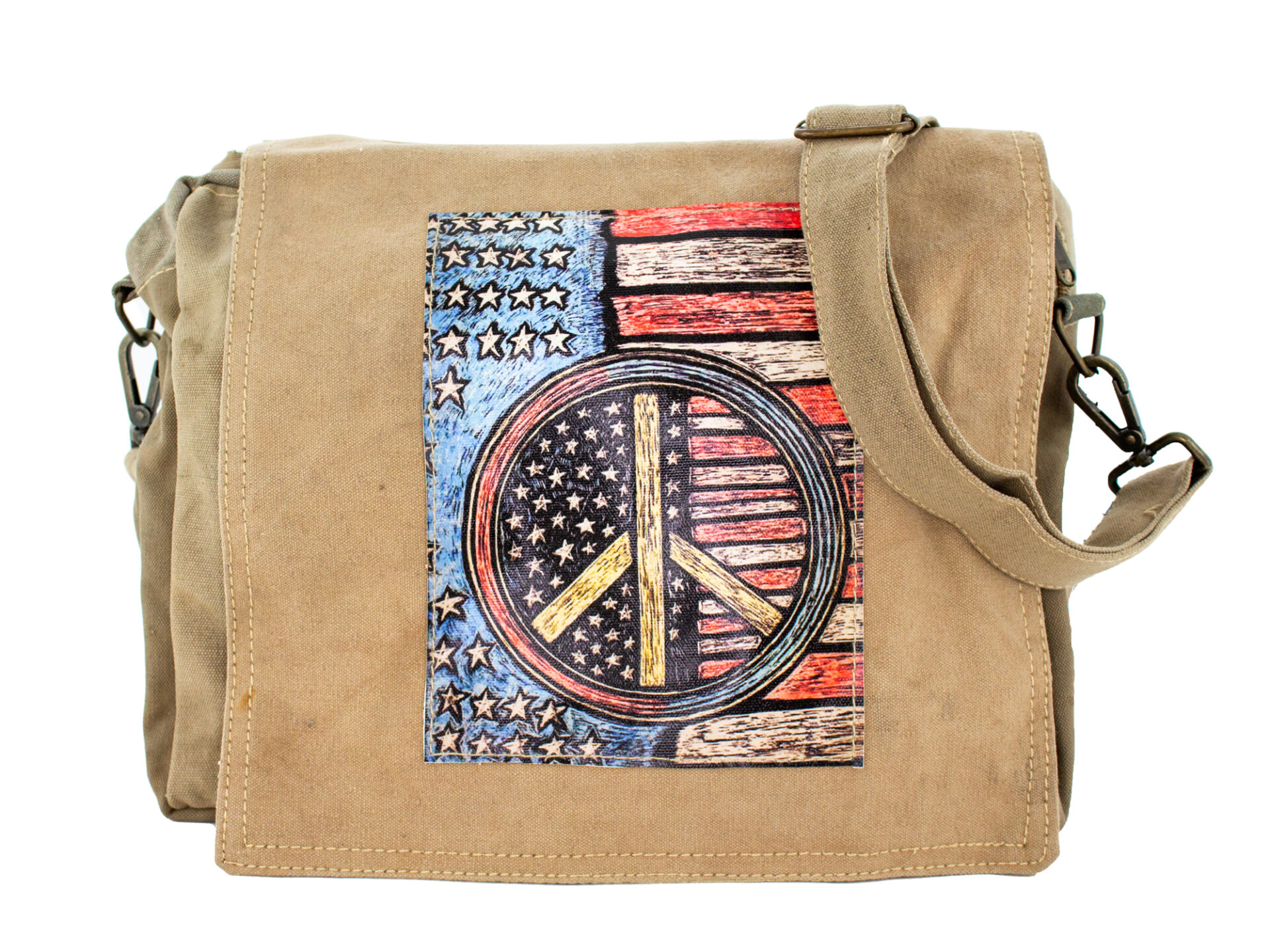 Our recycled military tent cross body features a print patch on the front flap. Top Zipper, 1 interior zipped pocket, fully lined.