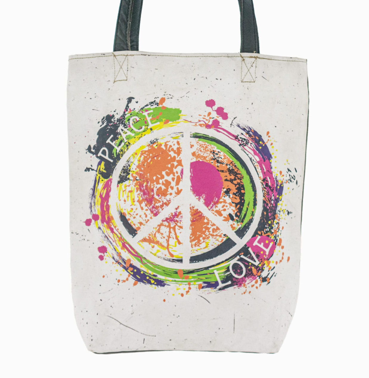 Our recycled military tent tote features leather handles and an open top with magnetic snap closure, 1 interior pocket, a vintage-style print on the front and is fully lined.