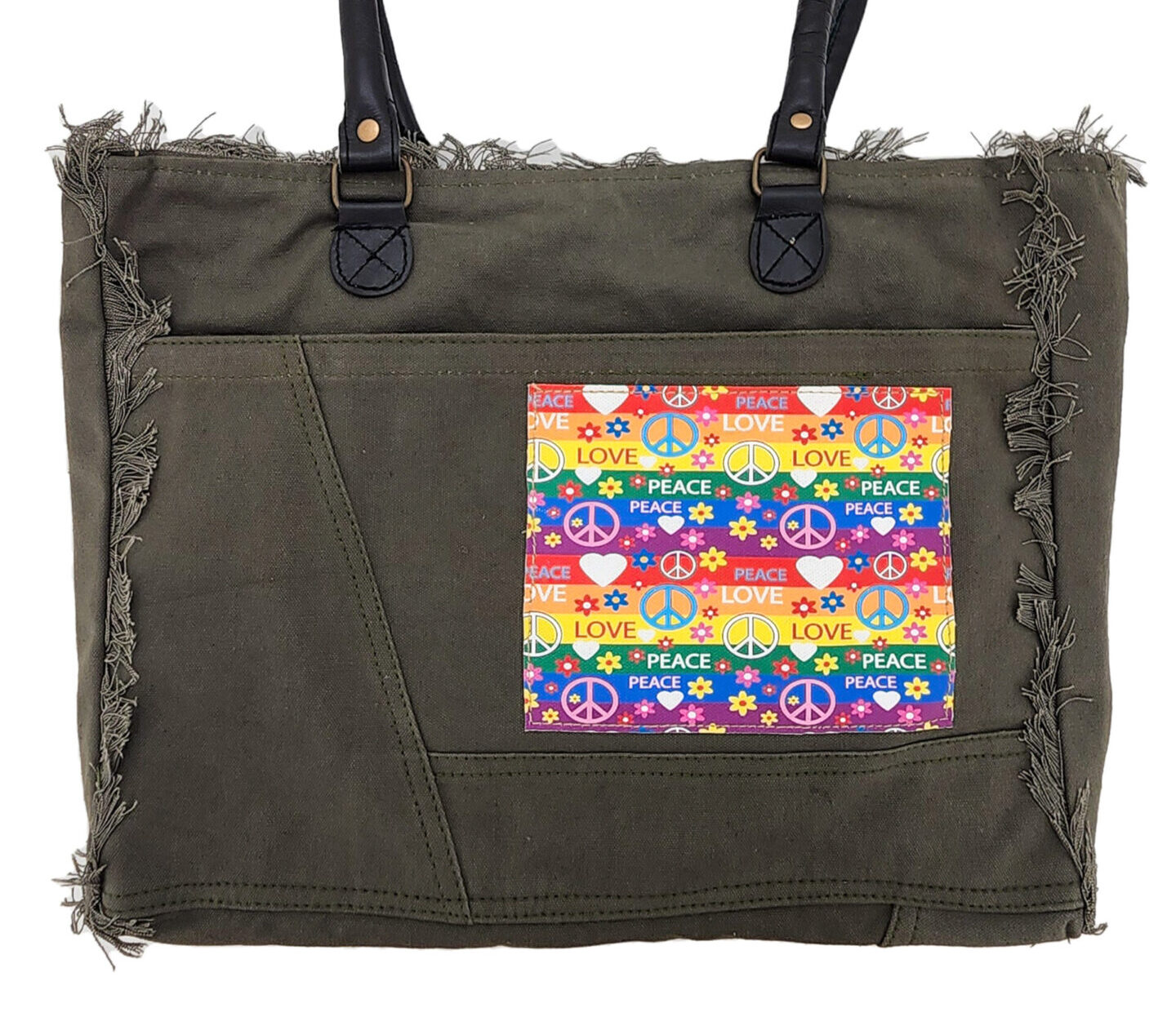 Our gorgeous canvas tote with fringe is handcrafted and features a vintage print patch. It has a zipper top closure, 1 interior pocket,1 large exterior pocket, is fully lined, and has leather handles. NOTE: Due to the treatment applied to the fabric, there will be variations in fabric color.