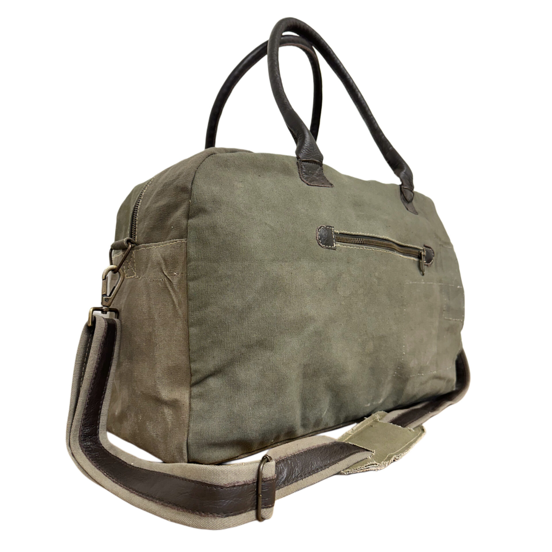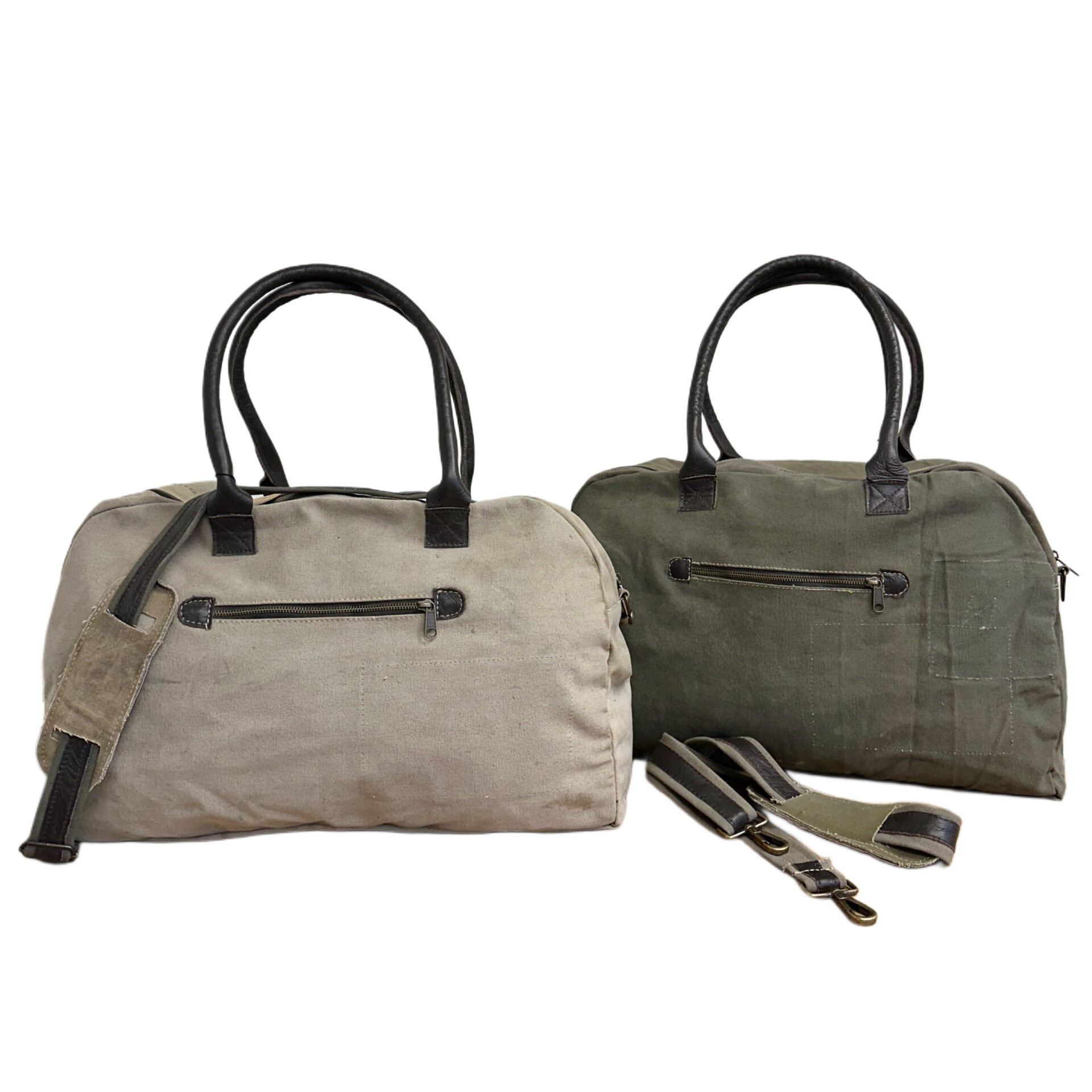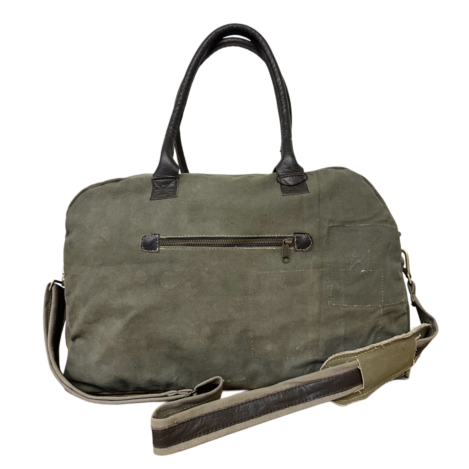 Our eco-friendly duffle bag is handcrafted from recycled military tents making each bag slightly unique. Bag is fully lined, features a generous zippered compartment on the back exterior and a zipper pocket on the front exterior. The interior has two pockets, one zipped and one open pocket. Each has durable genuine leather handles and an adjustable shoulder strap.