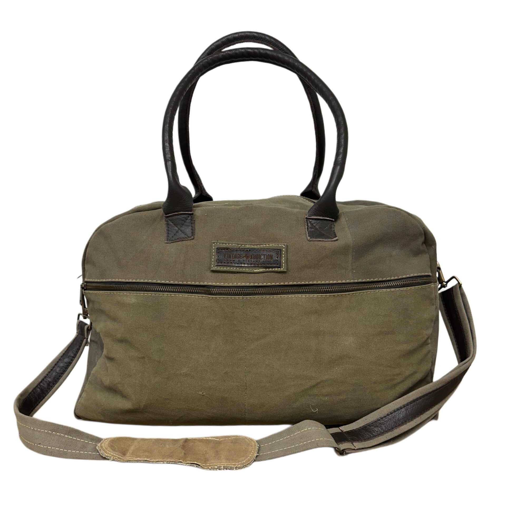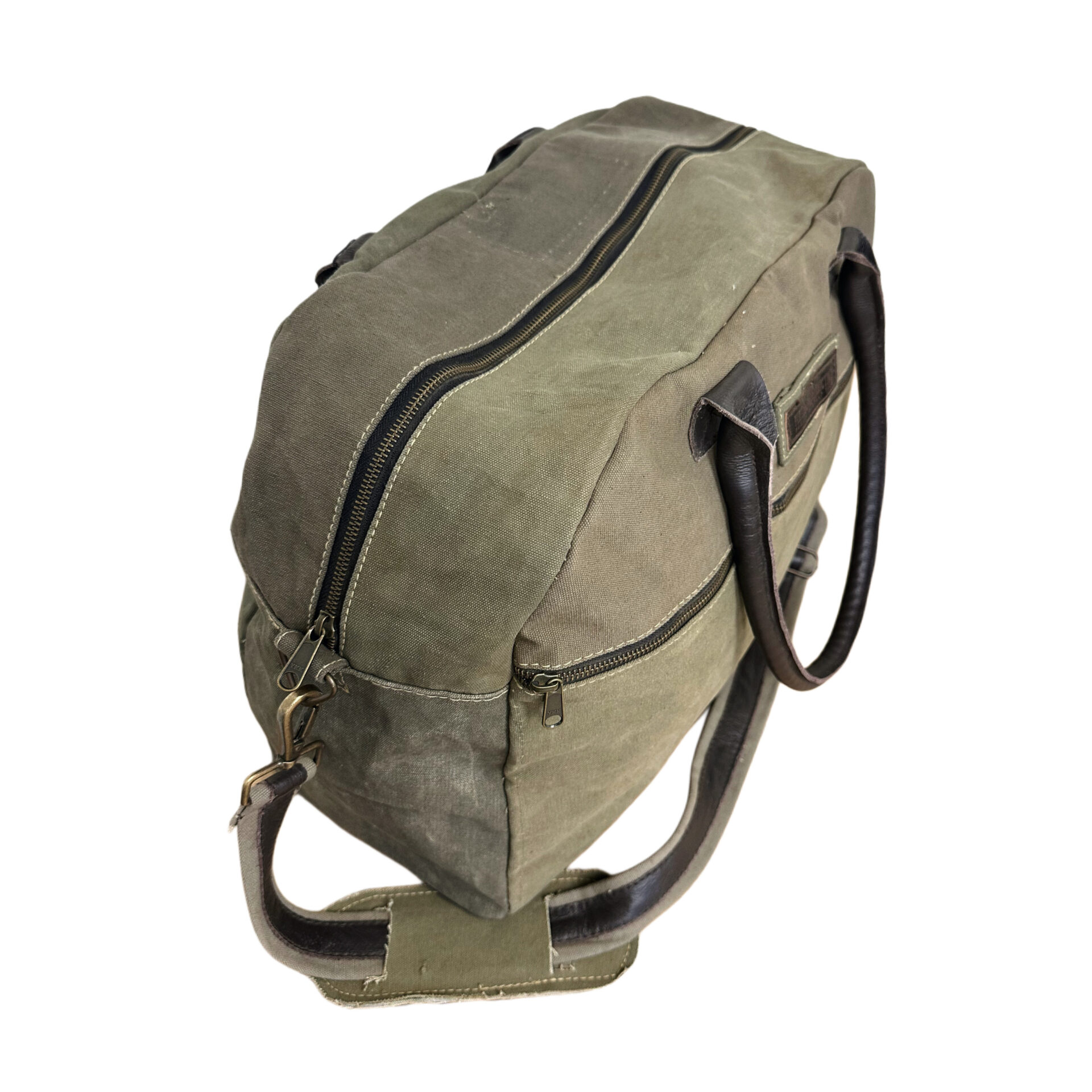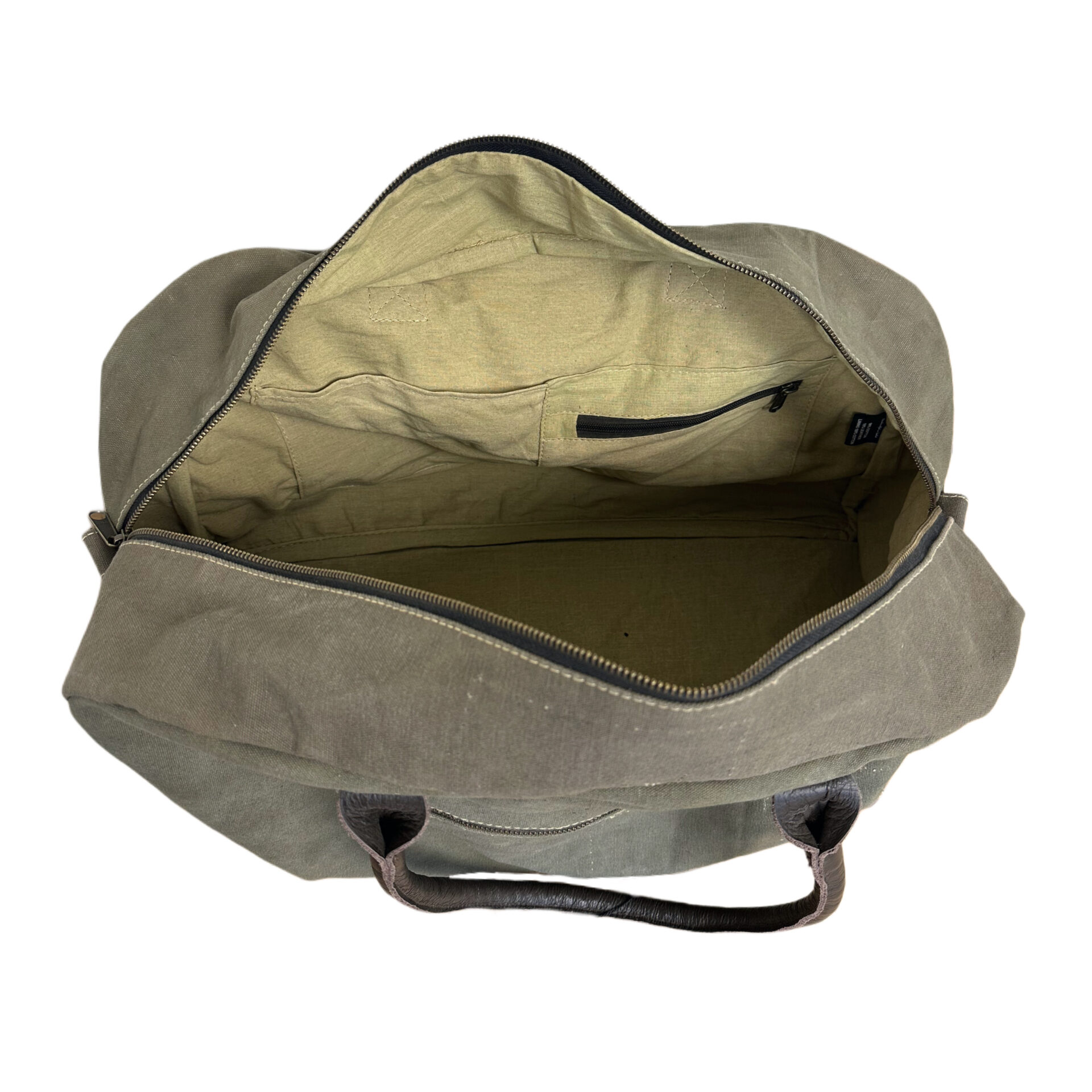 Our eco-friendly duffle bag is handcrafted from recycled military tents making each bag slightly unique. Bag is fully lined, features a generous zippered compartment on the back exterior and a zipper pocket on the front exterior. The interior has two pockets, one zipped and one open pocket. Each has durable genuine leather handles and an adjustable shoulder strap.