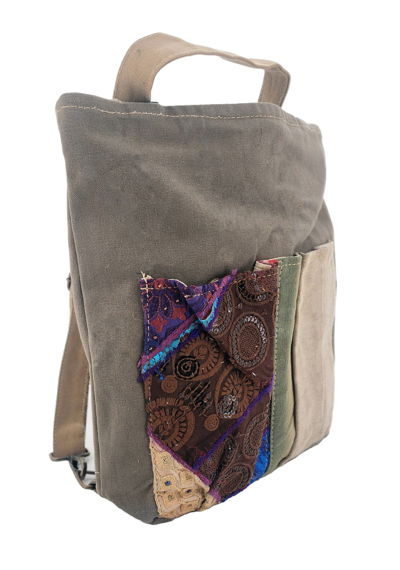 Our fully-lined recycled military tent bag accented with unique vintage fabric and textile pieces features long backpack-style carrying straps, a top main zipper, 2 front exterior large open pockets and 1 interior zip pocket.