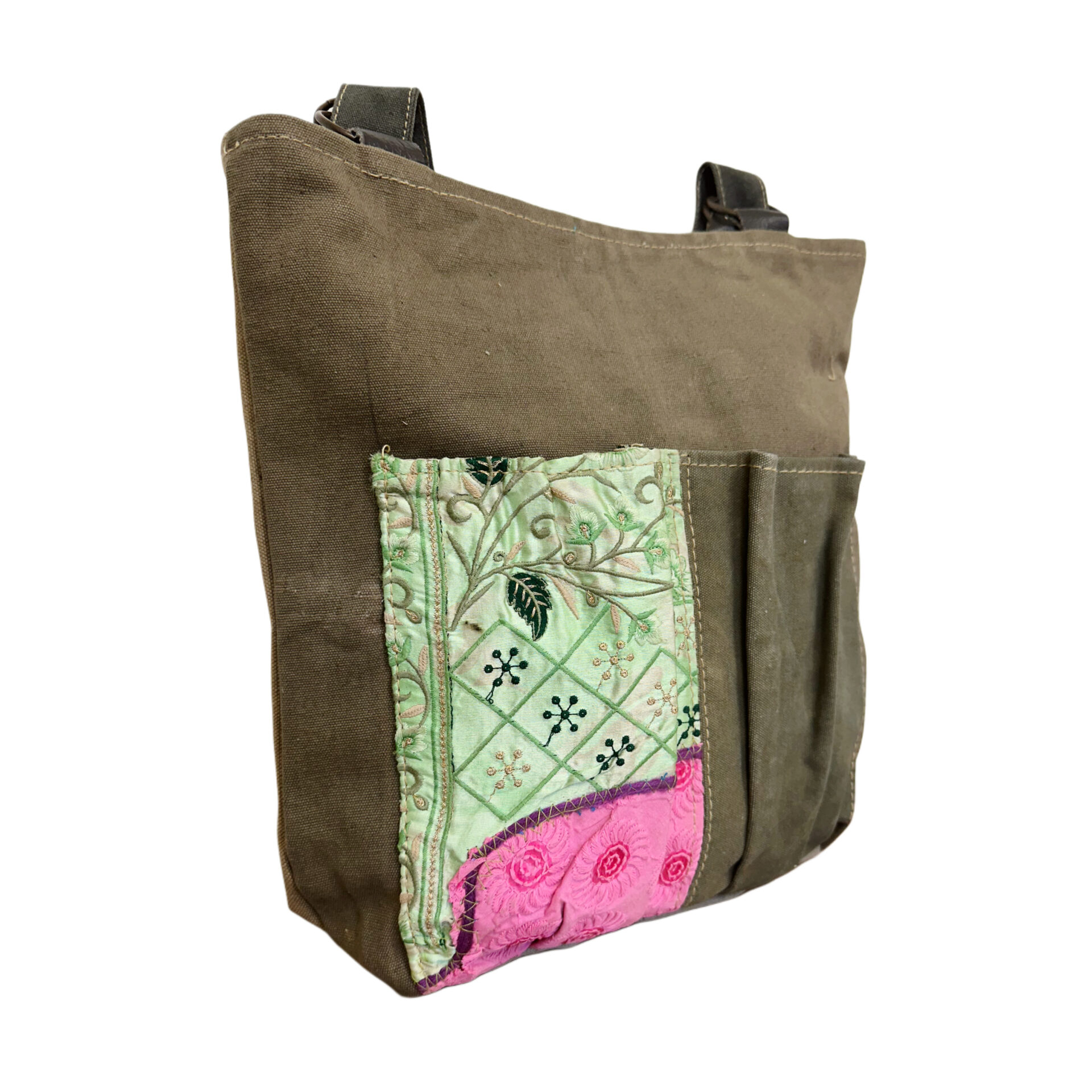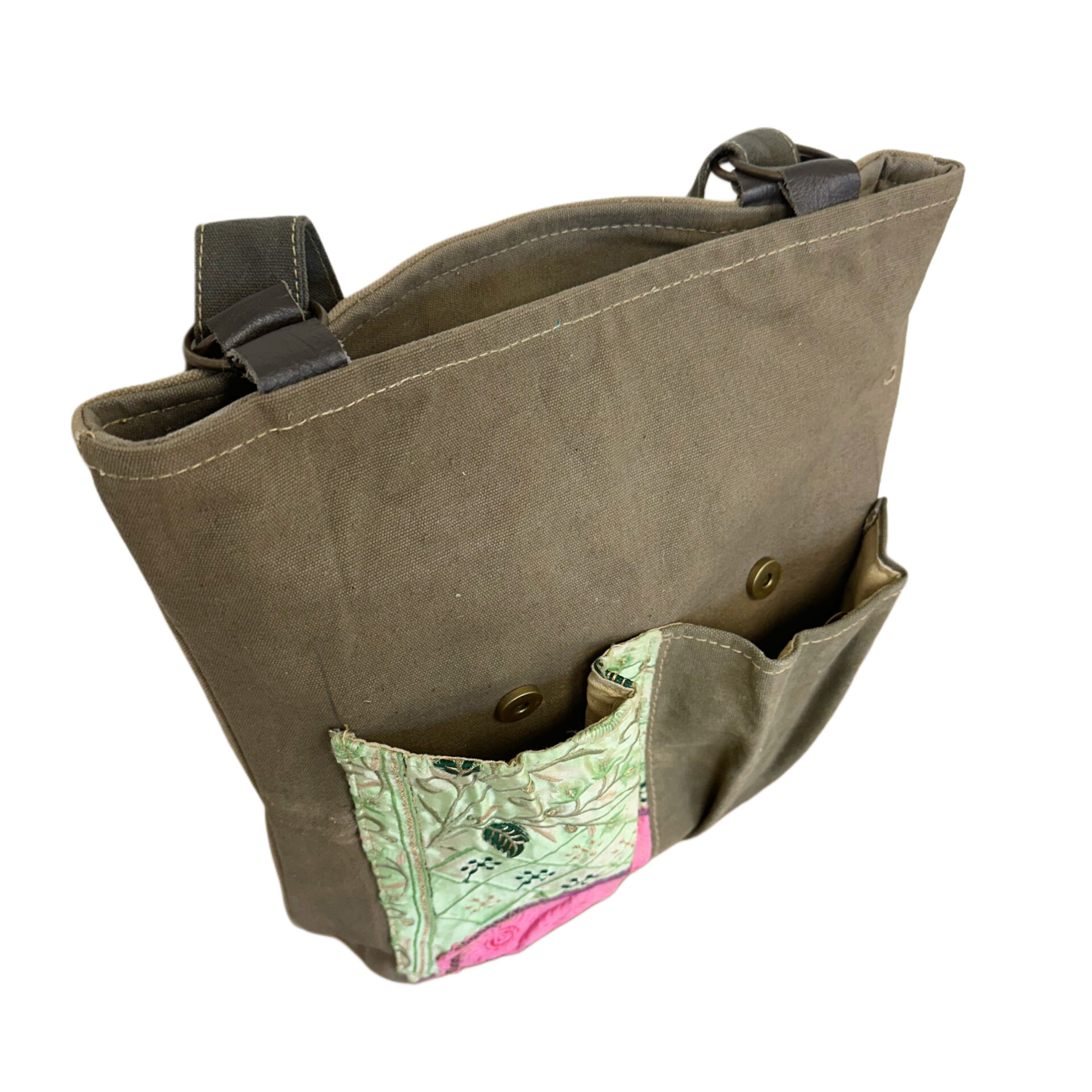 DISCLAIMER: Our recycled military tent bags are a tribute to and a reminder of the sacrifices and contributions of military veterans. Please know that these bags are made from authentic used military tents and are not brand new canvas packaged as recycled tents or tarps. THESE ARE THE REAL DEAL!! As a result, the tent material will show signs of worn-like imperfections which add to its character. Each bag has differences in genuine imperfections, stains, and colors. Your bag will be as unique as each soldier’s experience when seeking shelter in these tents whether in the training field or in a combat zone. Also note, that the vintage textiles and fabrics used to embellish this style will vary in color and design from bag to bag. Vintage fabrics will vary from photo to photo- no two are the same. Each one is truly “One of a kind”. (You will receive this photographed bag).