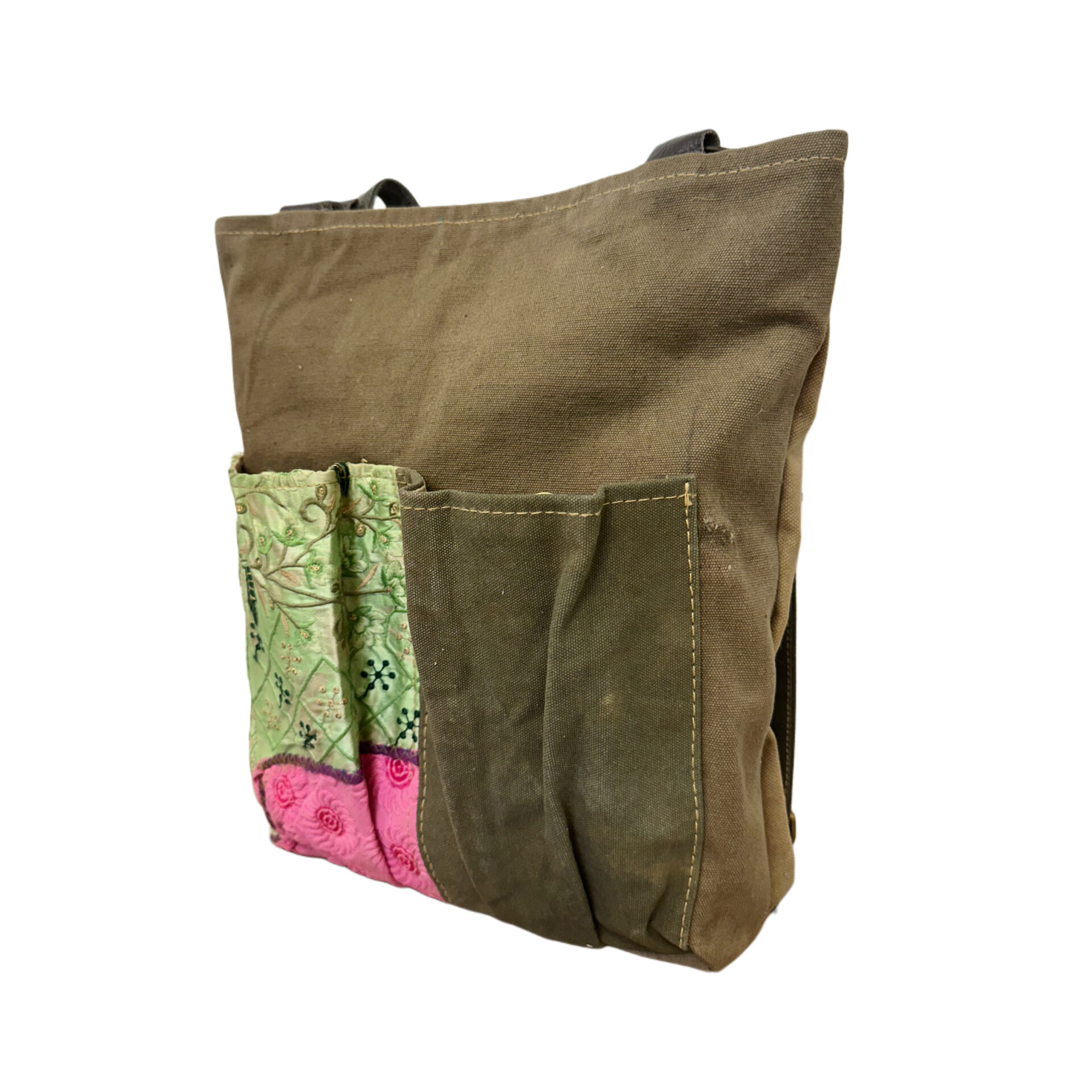 This hand selected fully-lined recycled military tent bag is accented with unique vintage fabric and textile pieces features long backpack-style carrying straps, a top main zipper, 2 front exterior large open pockets and 1 interior zip pocket.