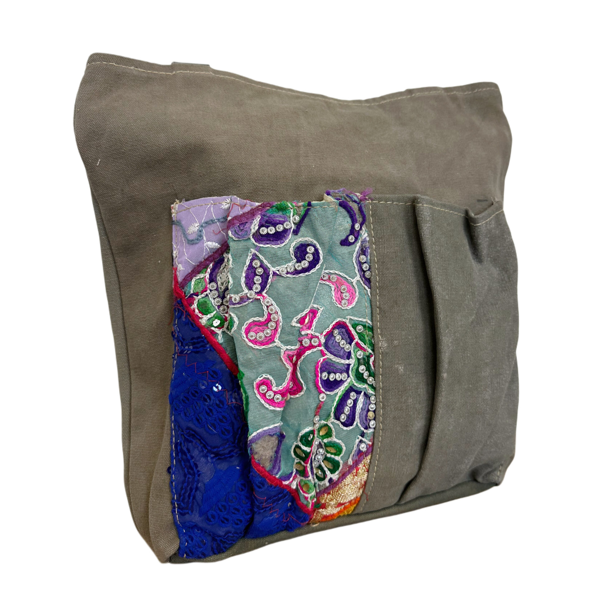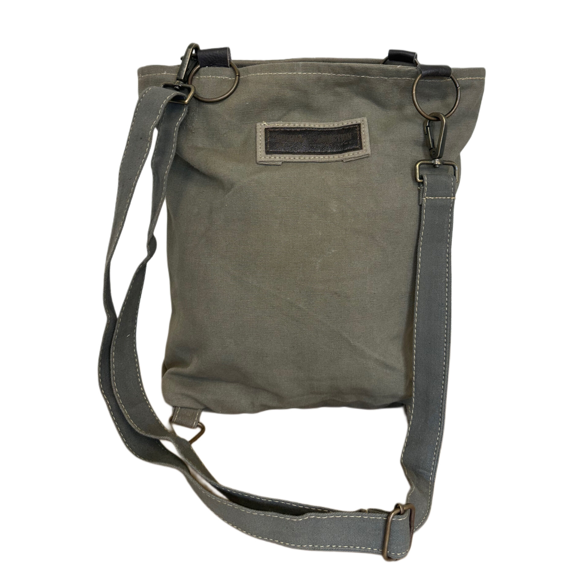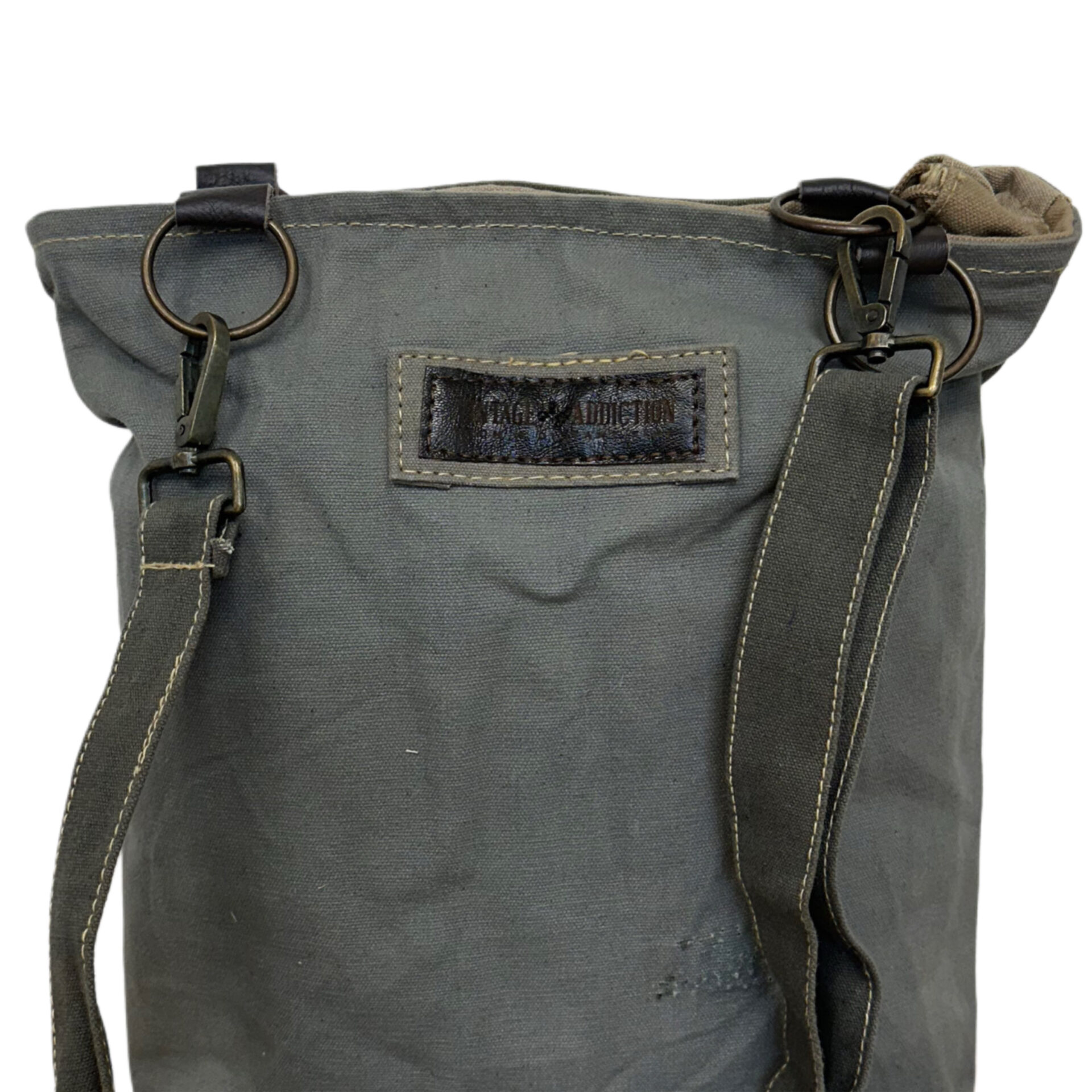 DISCLAIMER: Our recycled military tent bags are a tribute to and a reminder of the sacrifices and contributions of military veterans. Please know that these bags are made from authentic used military tents and are not brand new canvas packaged as recycled tents or tarps. THESE ARE THE REAL DEAL!! As a result, the tent material will show signs of worn-like imperfections which add to its character. Each bag has differences in genuine imperfections, stains, and colors. Your bag will be as unique as each soldier’s experience when seeking shelter in these tents whether in the training field or in a combat zone. Also note, that the vintage textiles and fabrics used to embellish this style will vary in color and design from bag to bag. Vintage fabrics will vary from photo to photo- no two are the same. Each one is truly “One of a kind”. (You will receive this photographed bag).