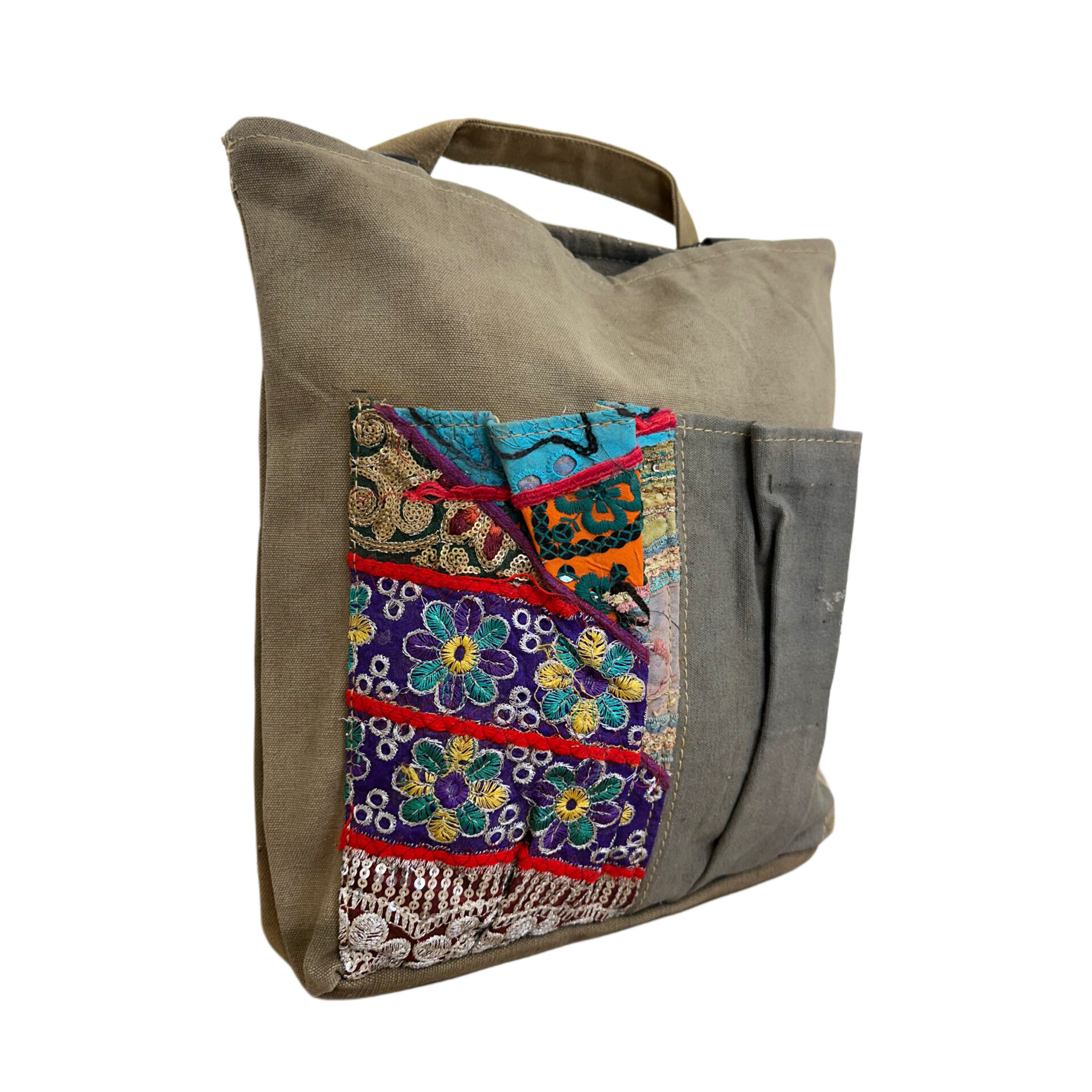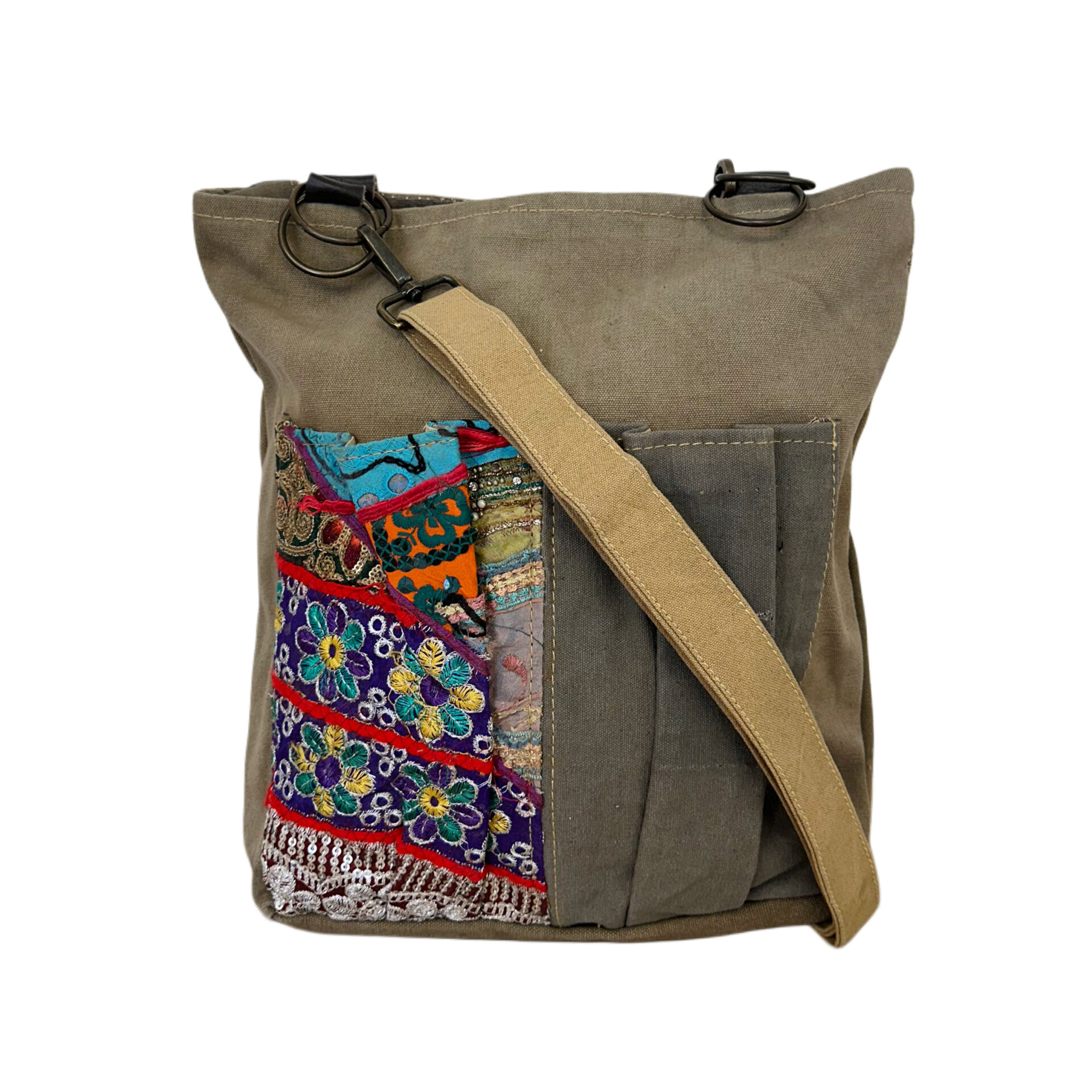 DISCLAIMER: Our recycled military tent bags are a tribute to and a reminder of the sacrifices and contributions of military veterans. Please know that these bags are made from authentic used military tents and are not brand new canvas packaged as recycled tents or tarps. THESE ARE THE REAL DEAL!! As a result, the tent material will show signs of worn-like imperfections which add to its character. Each bag has differences in genuine imperfections, stains, and colors. Your bag will be as unique as each soldier’s experience when seeking shelter in these tents whether in the training field or in a combat zone. Also note, that the vintage textiles and fabrics used to embellish this style will vary in color and design from bag to bag. Vintage fabrics will vary from photo to photo- no two are the same. Each one is truly “One of a kind”. (You will receive this photographed bag).