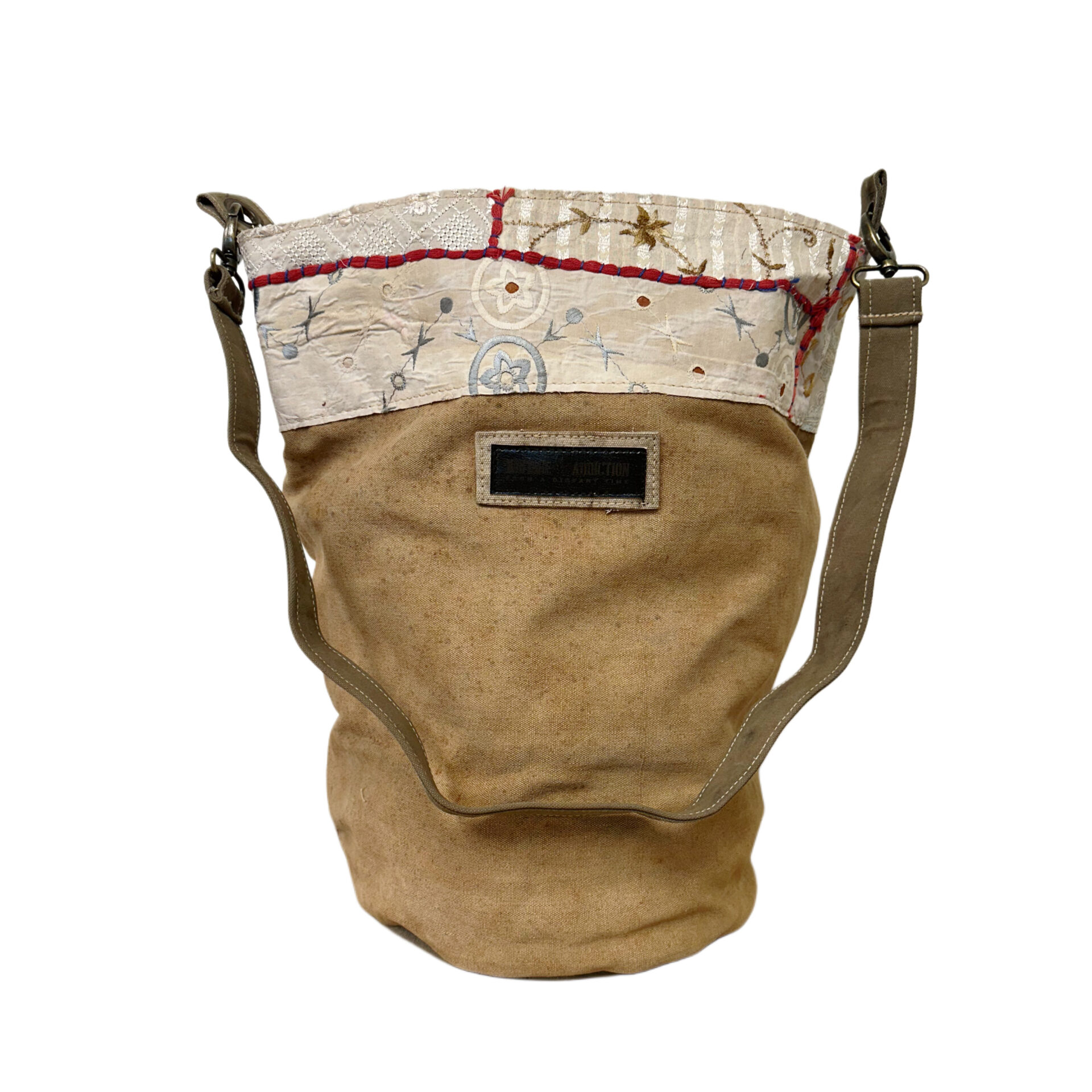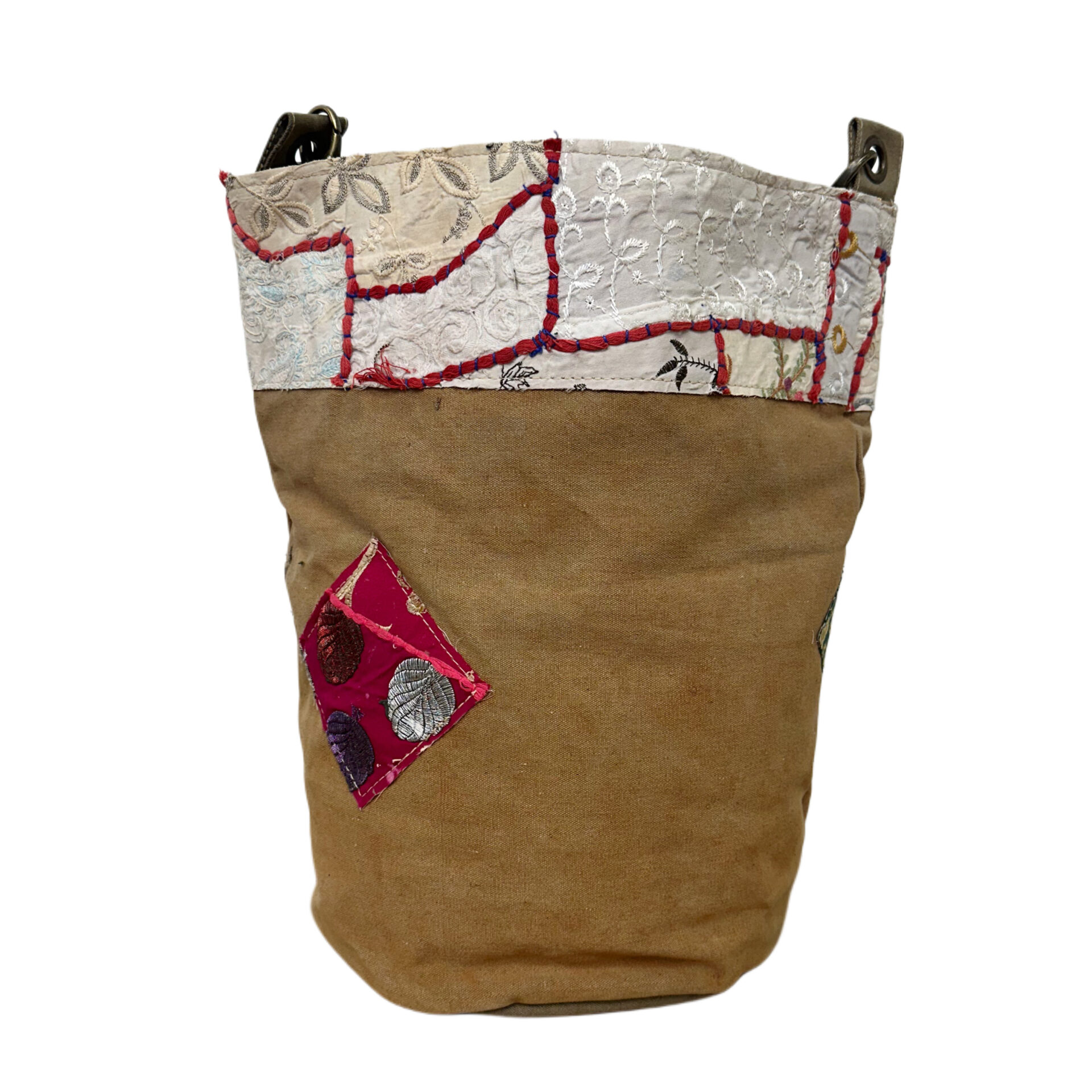 This hand selected recycled military tent bucket-style bag features an open top with patches of vintage fabrics.
