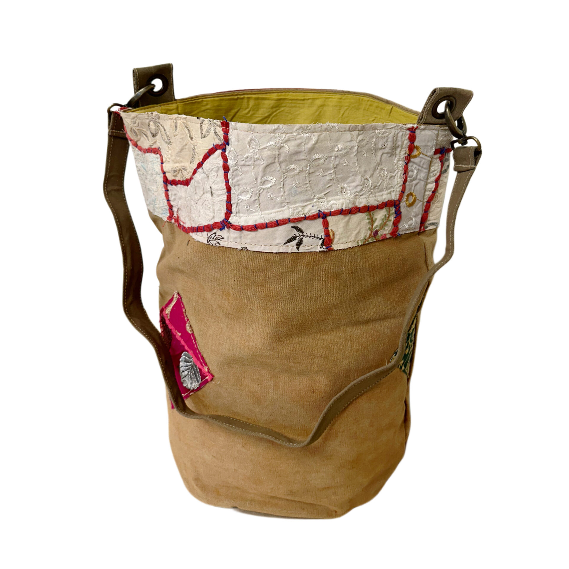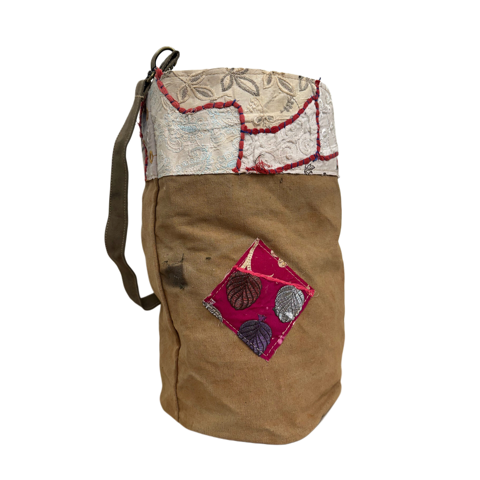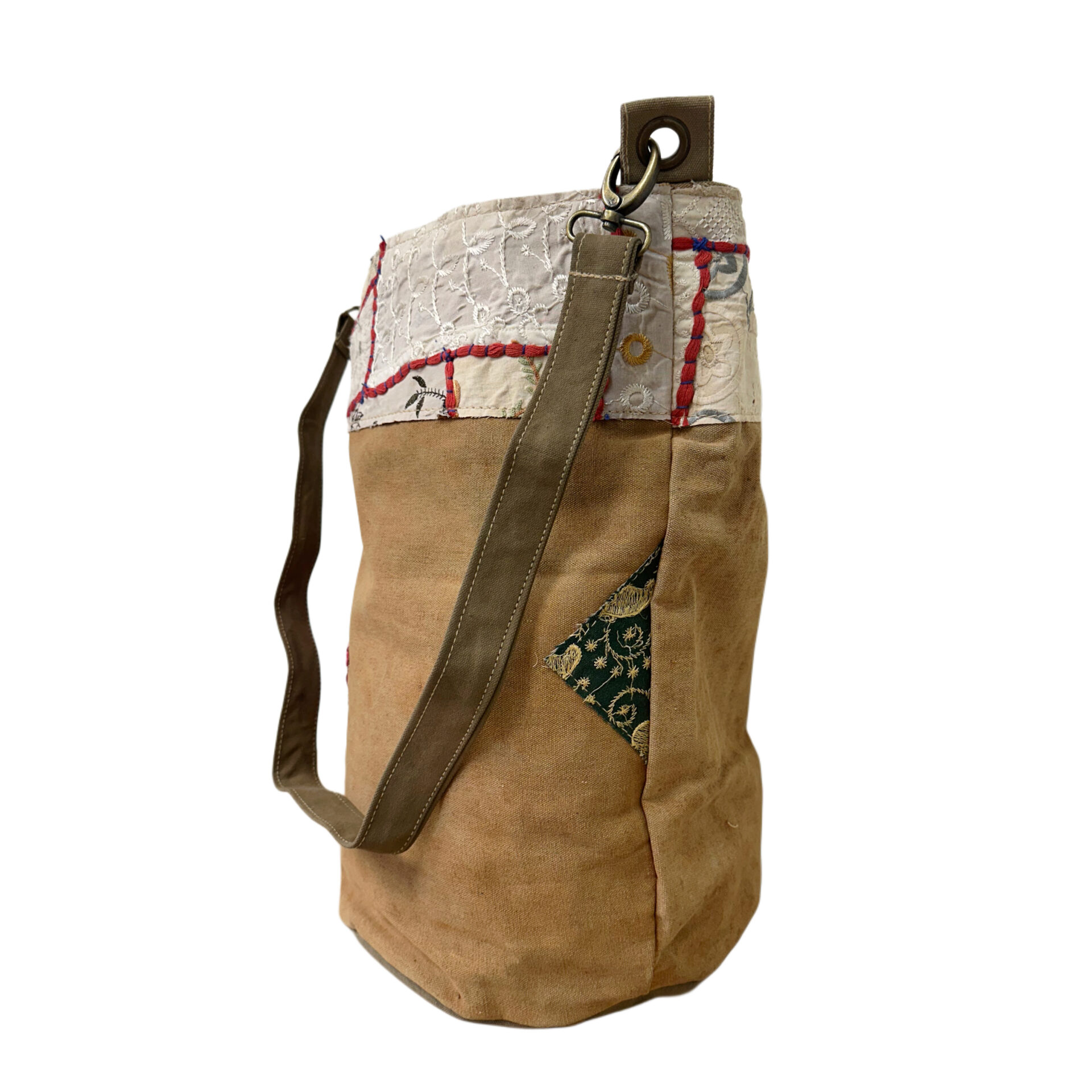 Recycled Military Tent Bucket Bag with Vintage Fabric Patches-07