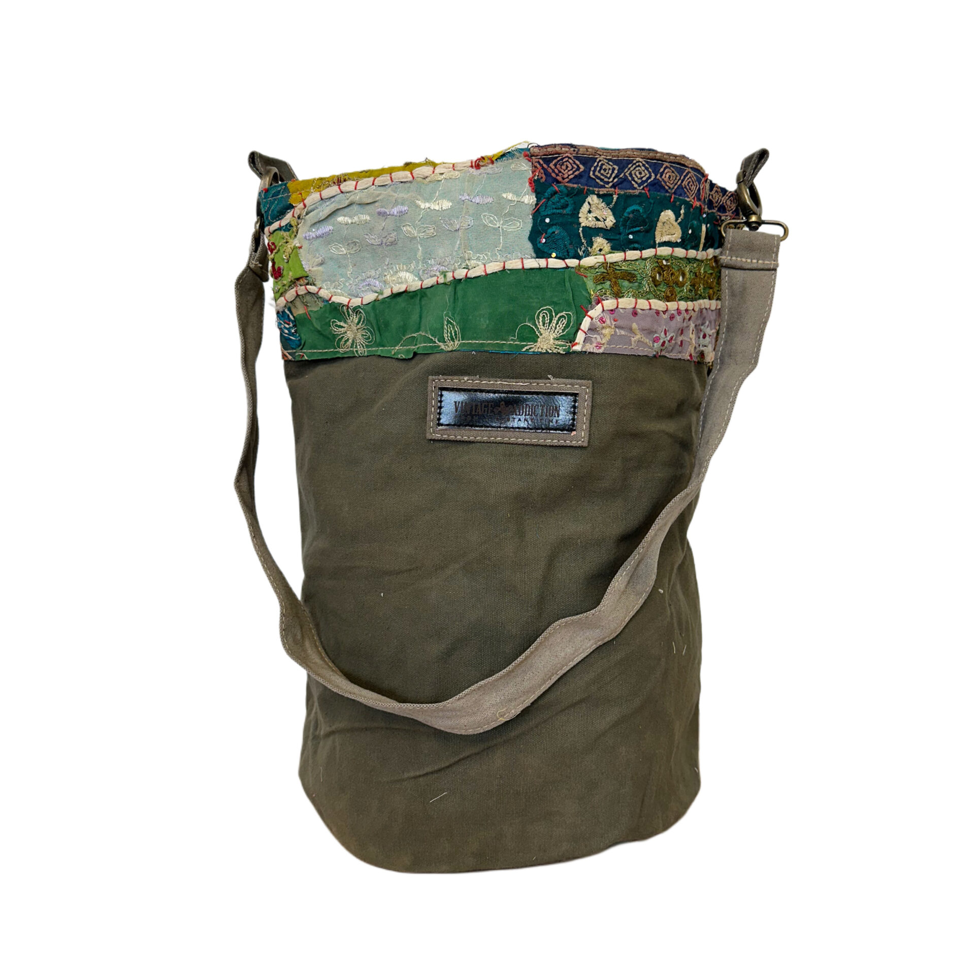 This hand selected recycled military tent bucket-style bag features an open top with patches of vintage fabrics.