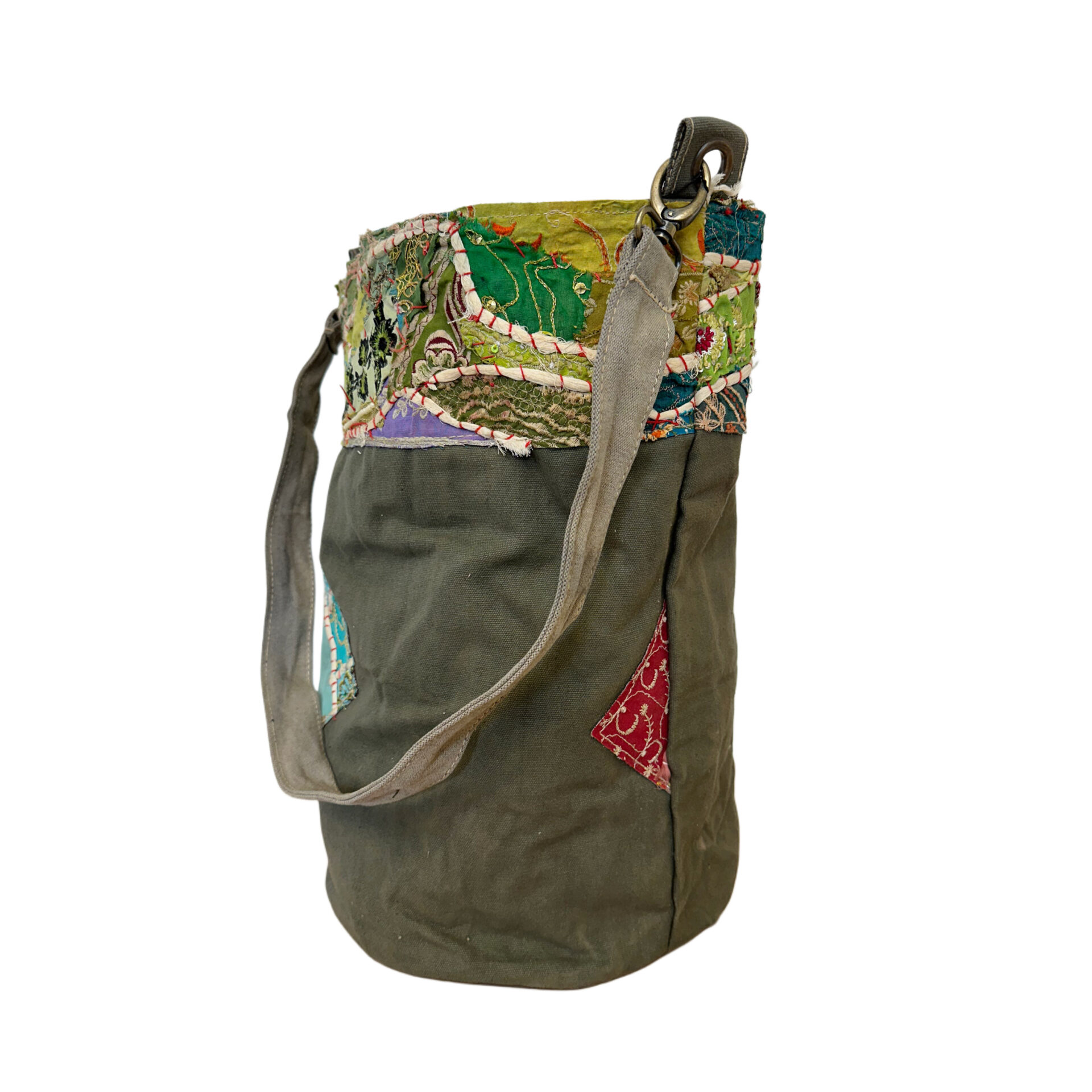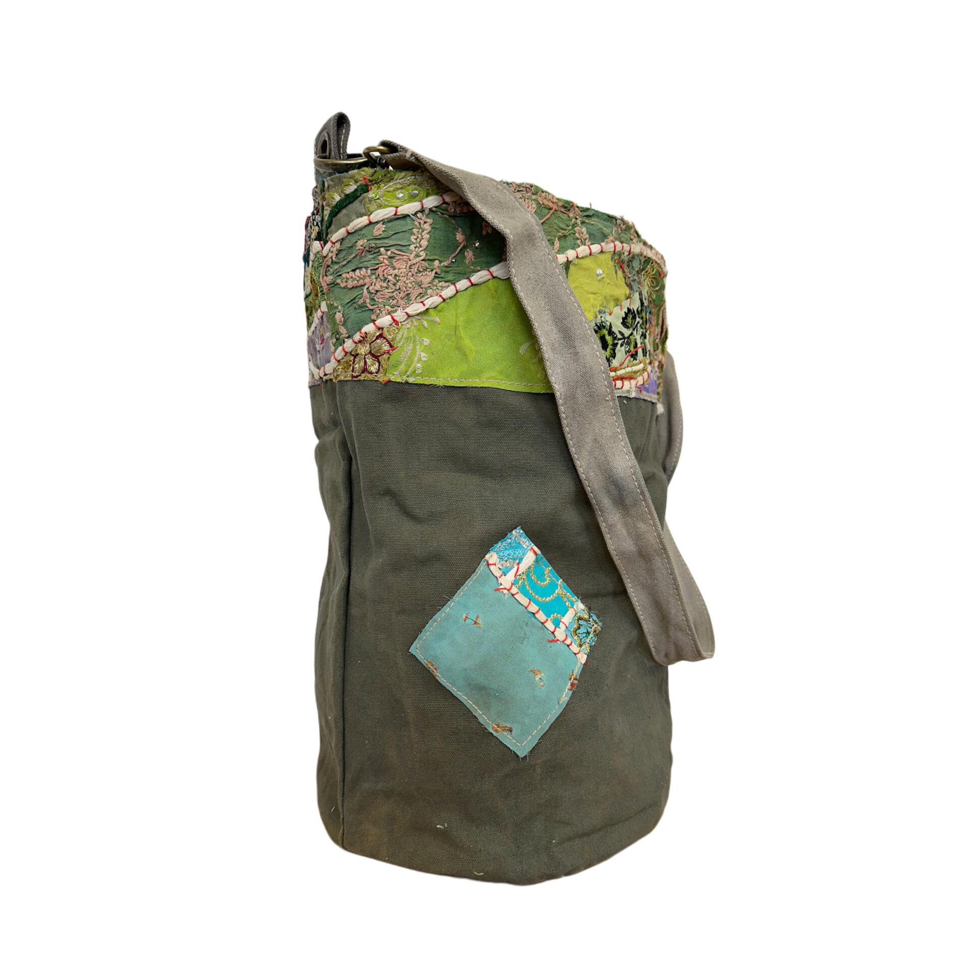 Recycled Military Tent Bucket Bag with Vintage Fabric Patches-09