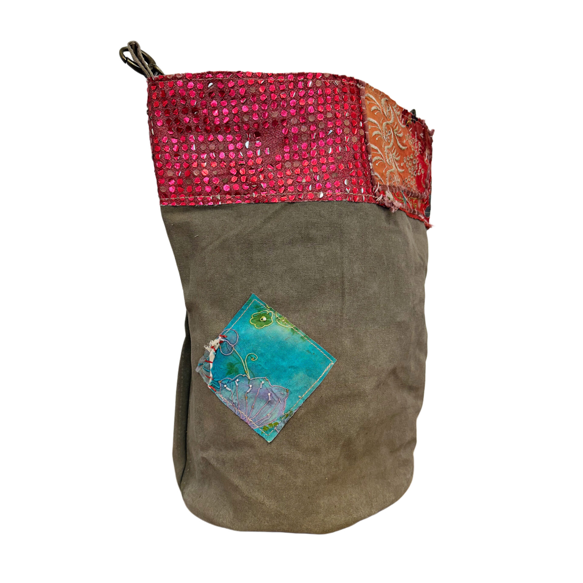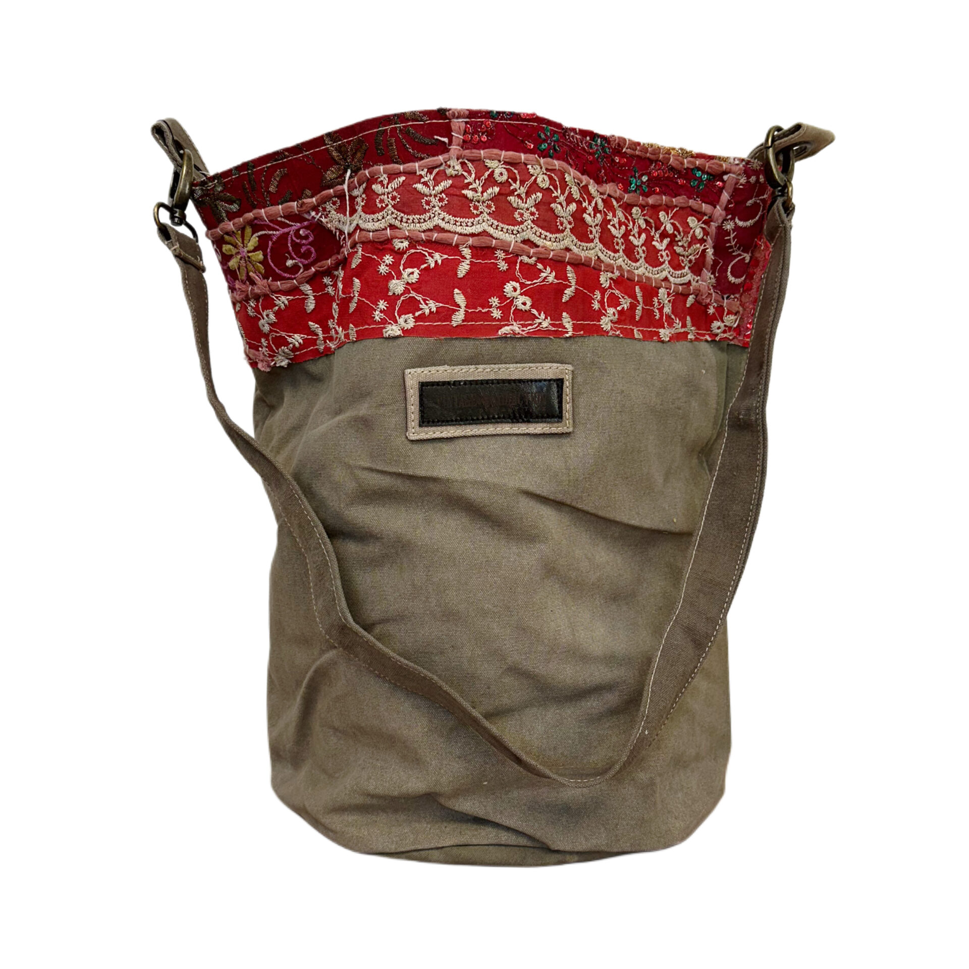 This hand selected recycled military tent bucket-style bag features an open top with patches of vintage fabrics.