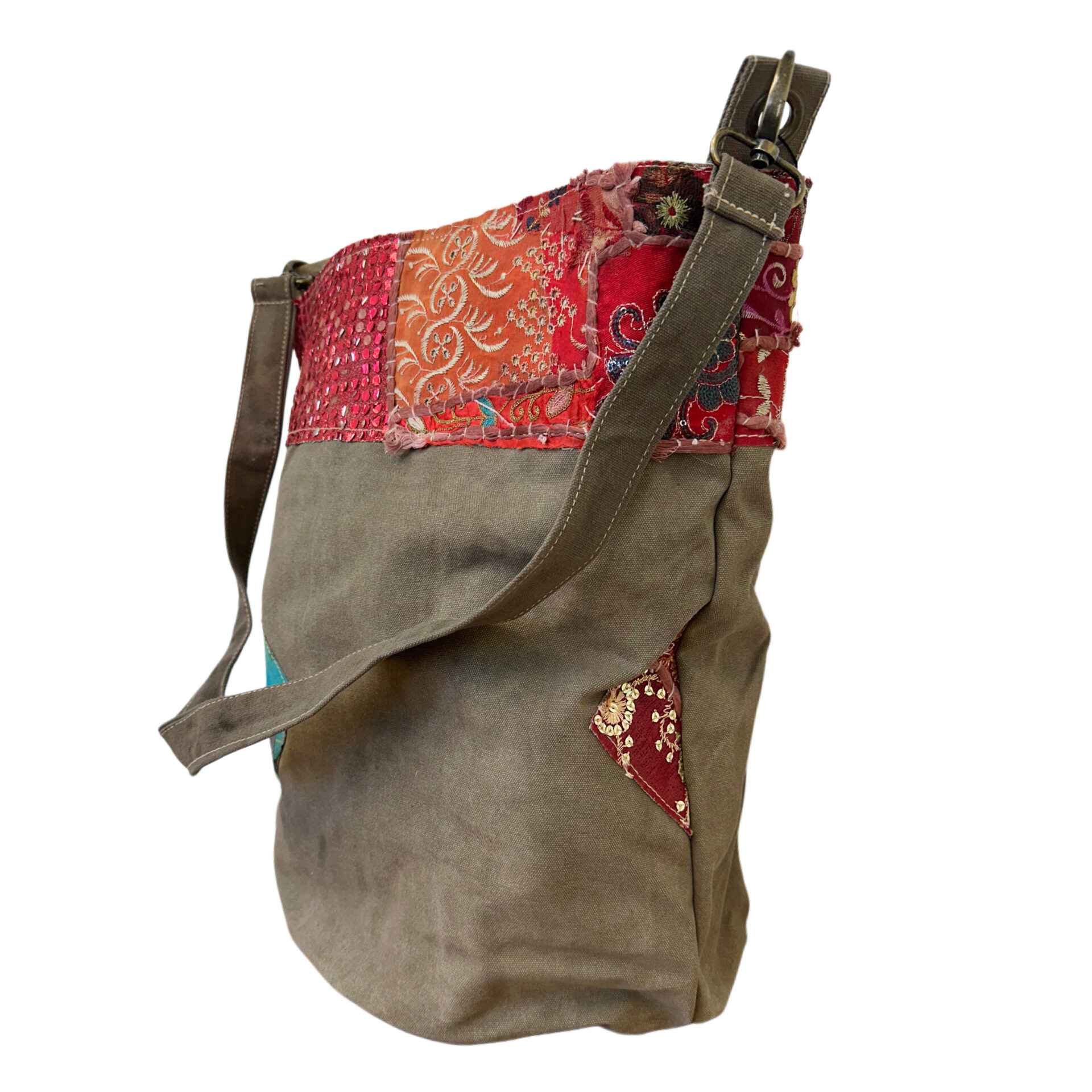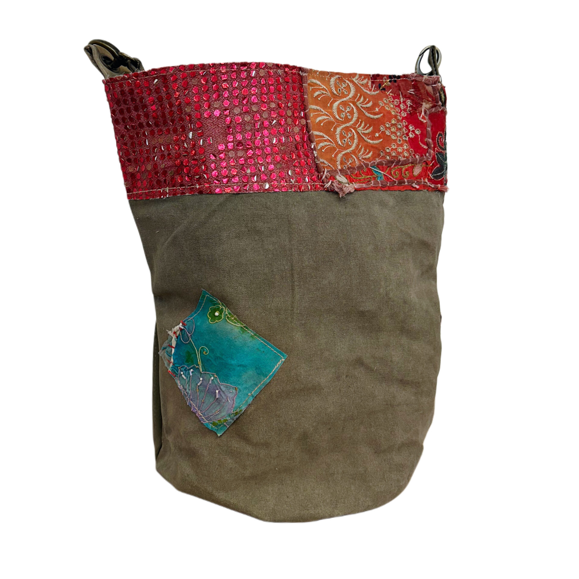 Recycled Military Tent Bucket Bag with Vintage Fabric Patches-11