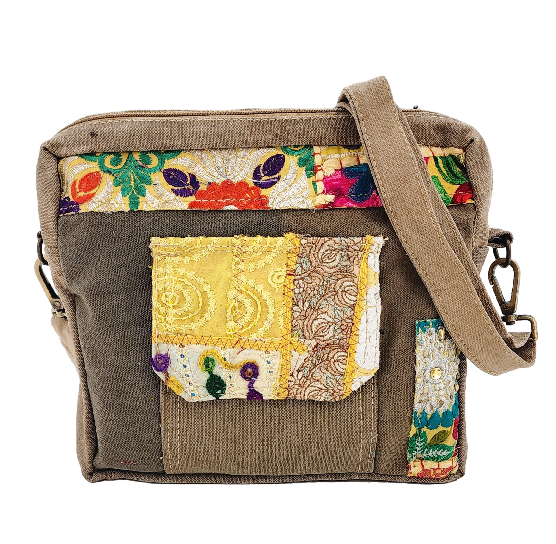 Our medium-sized crossbody is crafted with recycled military tents embellished with unique vintage fabric. Top zipper, 1 exterior pocket with vintage fabric adornment (snap closure). Fully lined with 1 interior pouch..