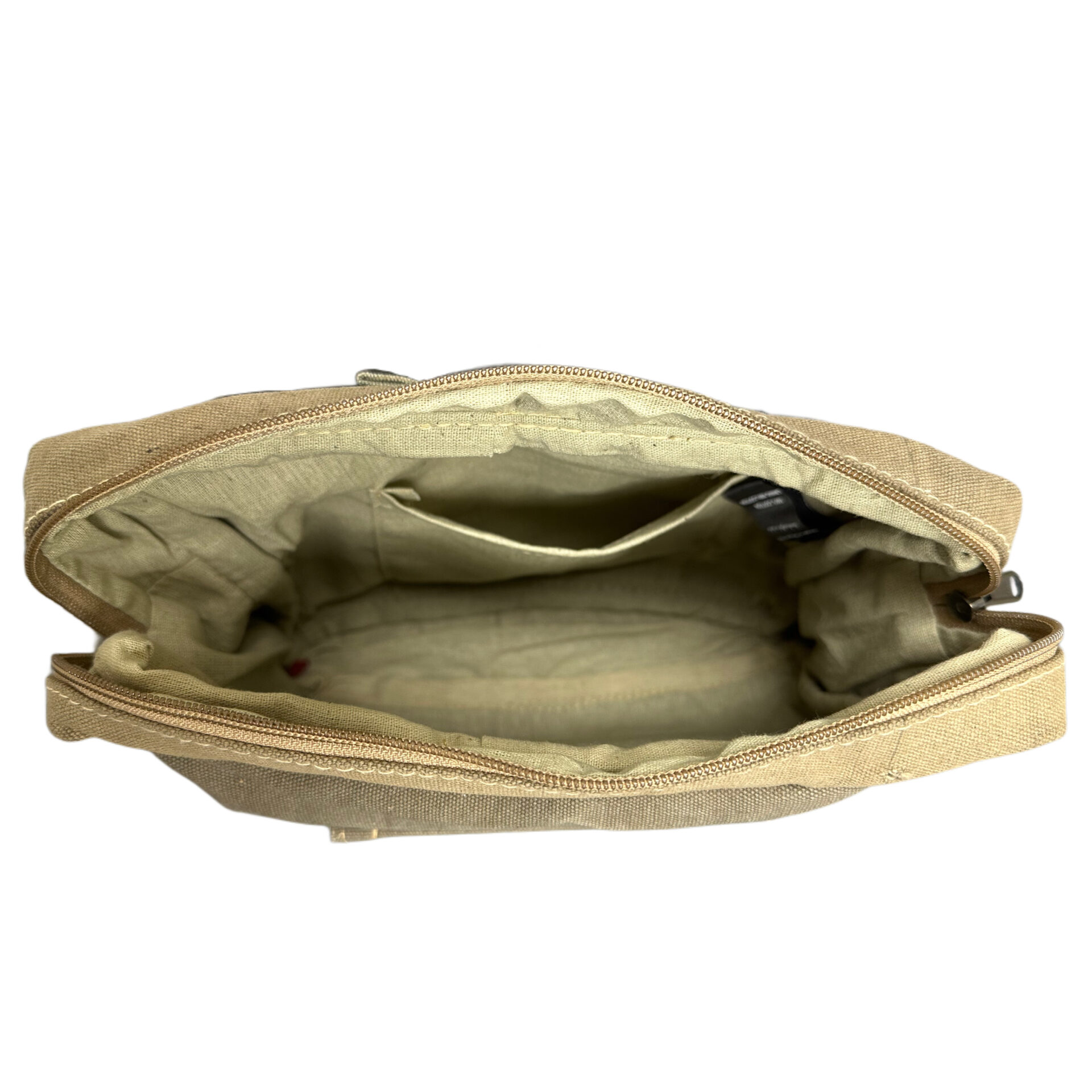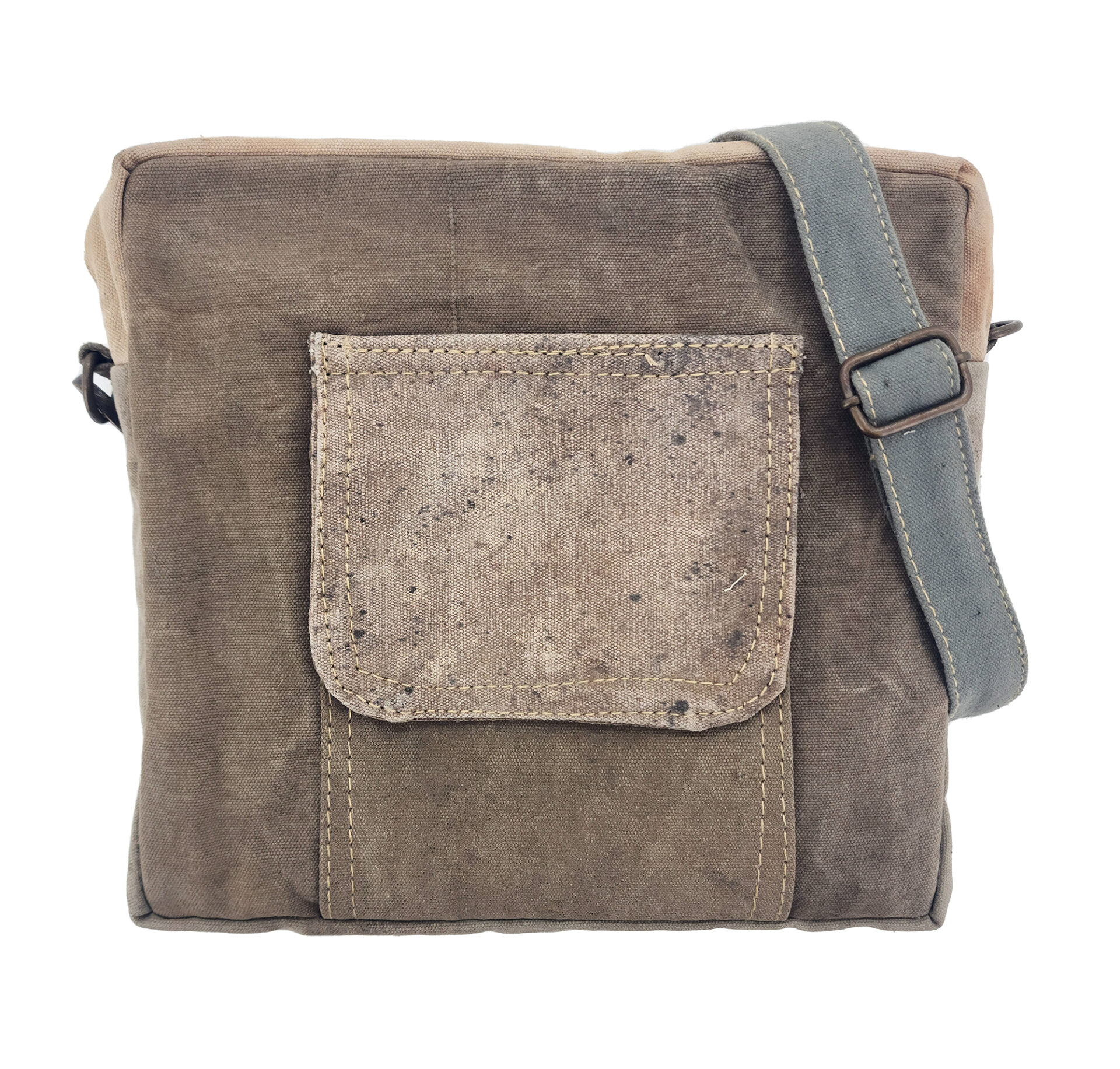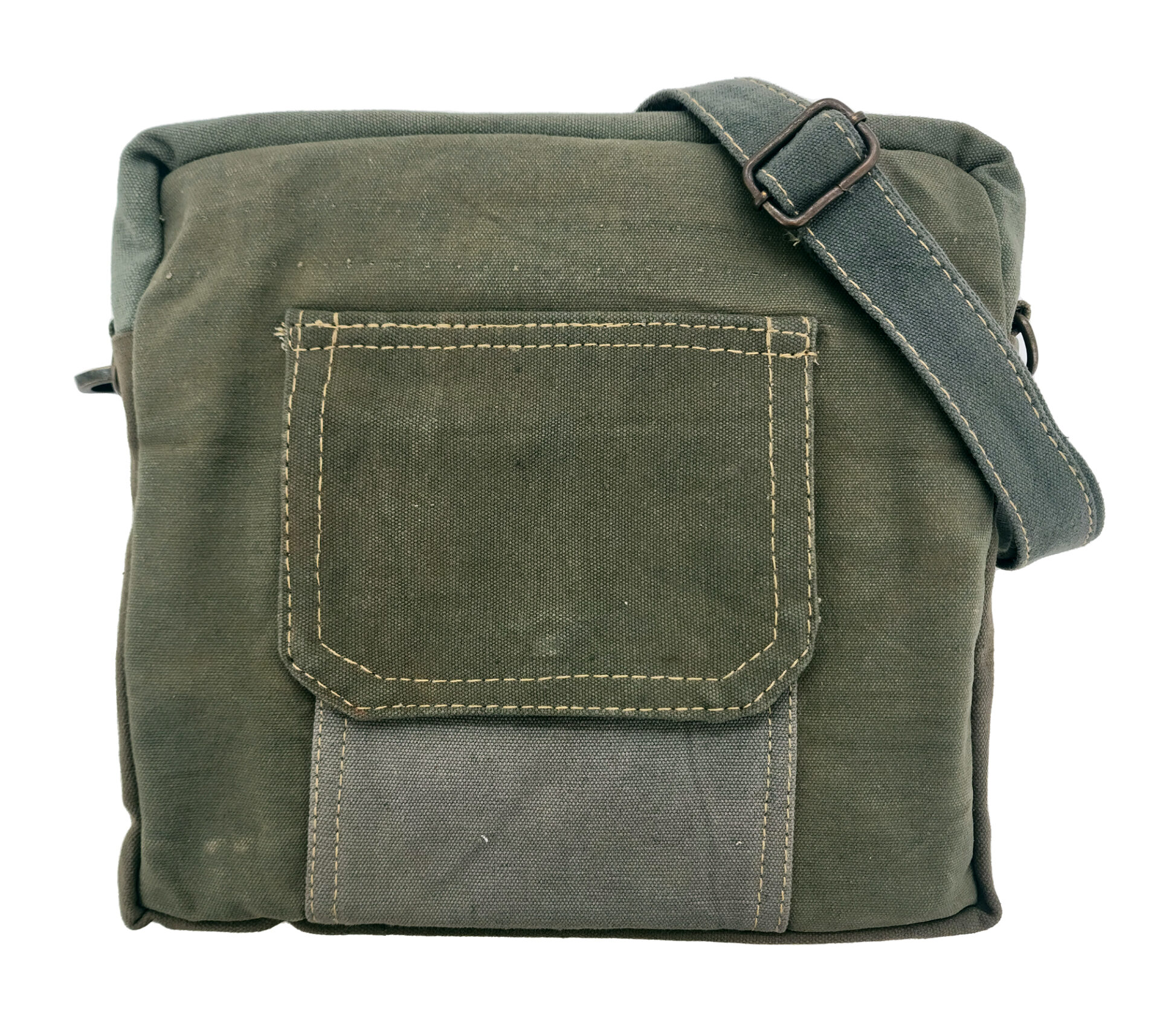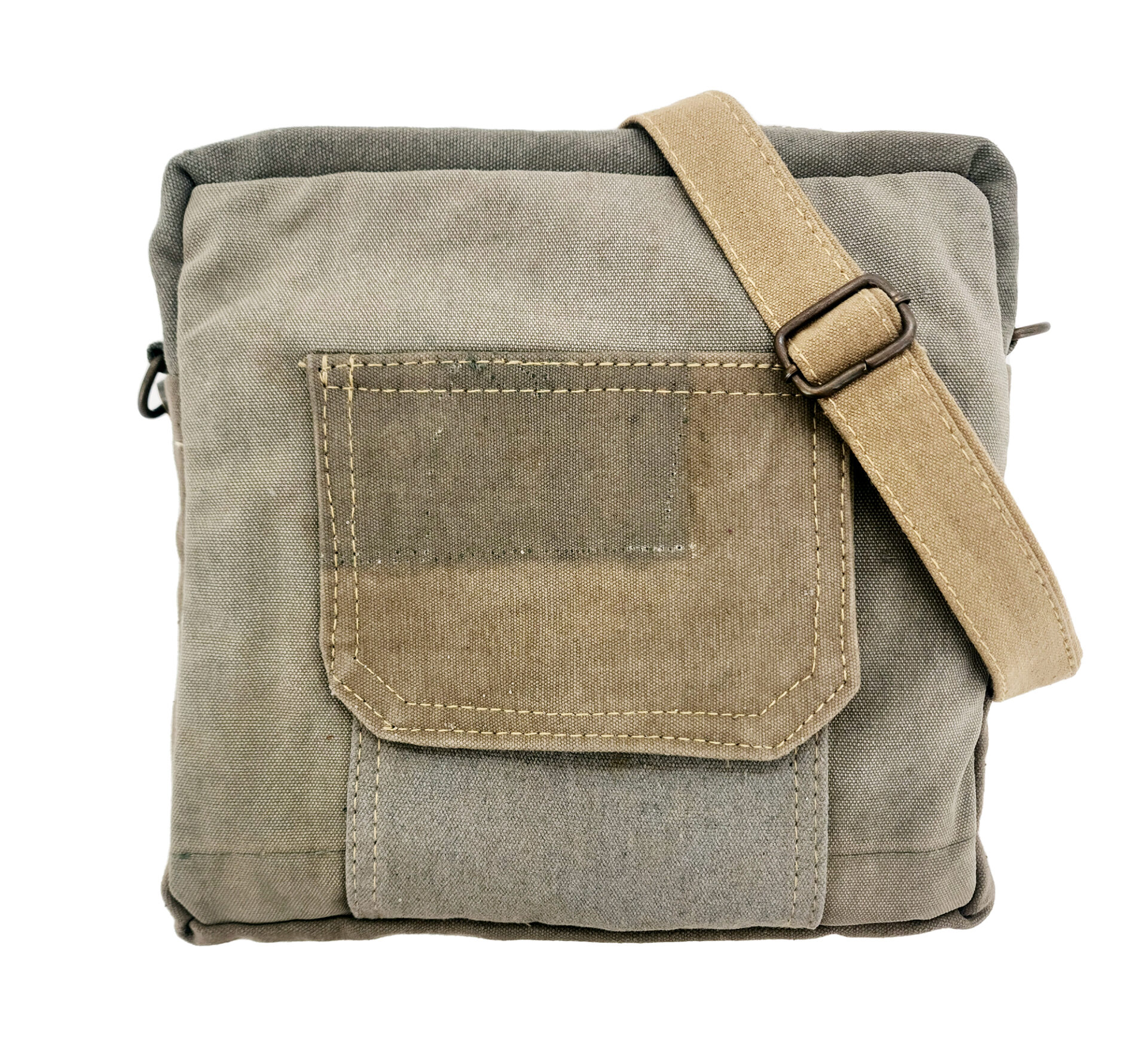 Our medium-sized crossbody is crafted with recycled military tents and features a top zipper, 1 exterior pocket (snap closure). Fully lined with 1 interior pouch..