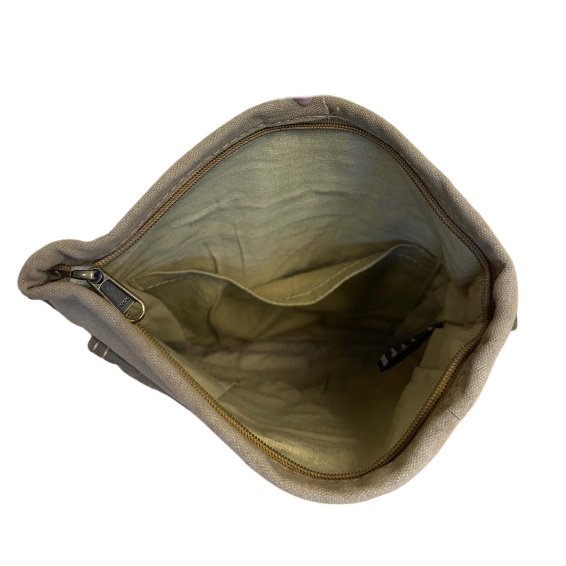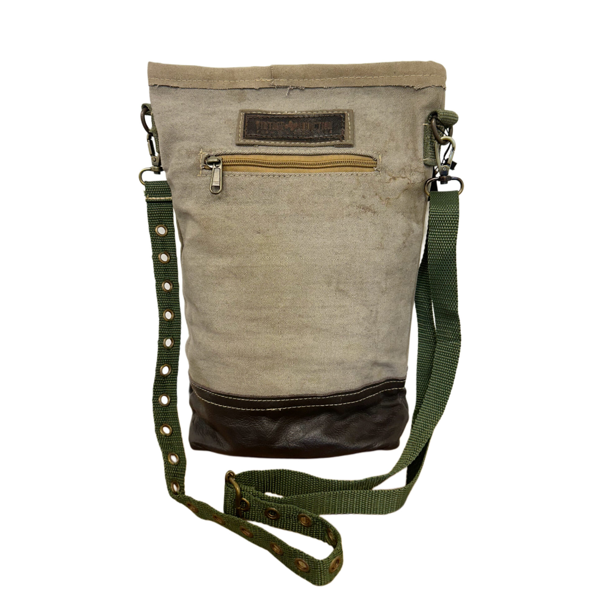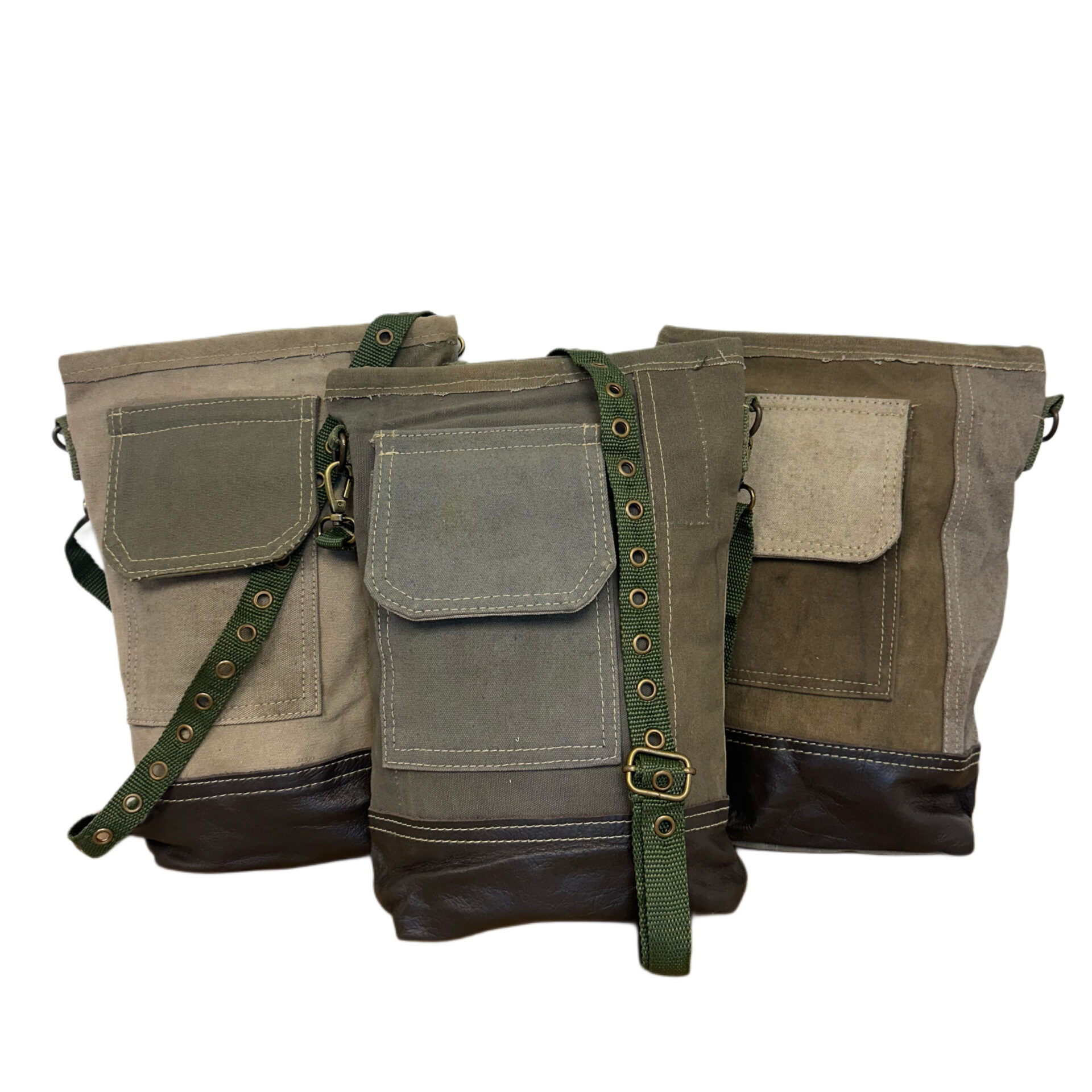 Our medium-sized crossbody is handcrafted using recycled military tents with leather trim around base. This bag has a zipper closure top. Fully lined with 1 interior pocket and one back zipper pocket for additional storage. Bag measures 9″W x 12″H x 3″D and has a fixed 56″ extendable nylon belt strap.