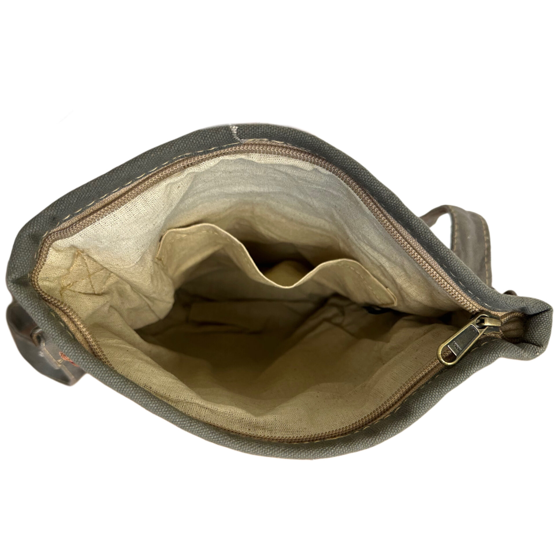 DISCLAIMER: Our recycled military tent bags are a tribute and reminder of the sacrifices and contributions of military veterans. Please know that these bags are made from authentic used military tents not new canvas packaged as recycled tents or tarps. THESE ARE THE REAL DEAL! The tent material will show signs of worn-like imperfections which add to its character. Each bag has differences in genuine imperfections, stains, and colors. Your bag is as unique as each soldier’s experience seeking shelter in the tents whether in the training field or in a combat zone. Vintage fabrics are not repaired, they have distinctive characteristics of worn threads, sequins or beadwork. You will receive this bag.