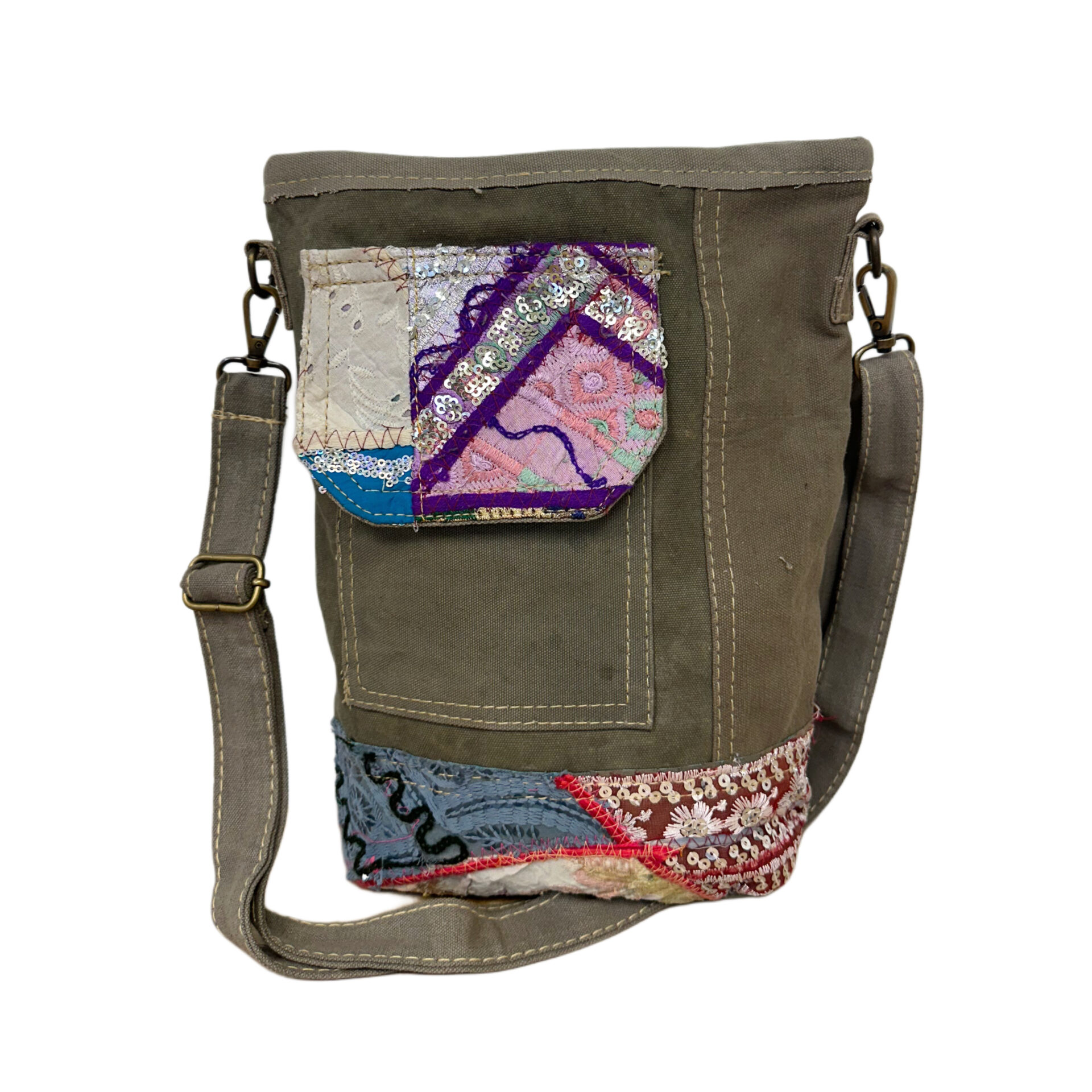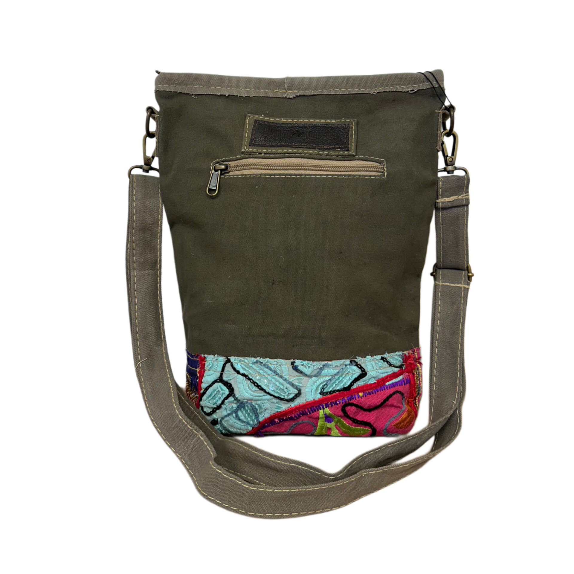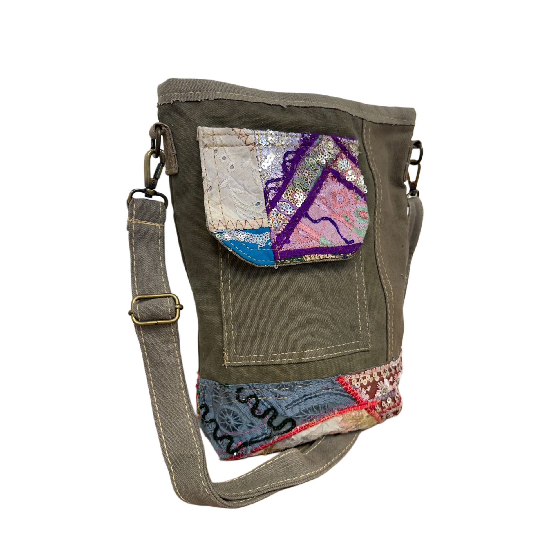 Recycled Military Tent Crossbody with Vintage Fabric Accent & Front Pocket-26