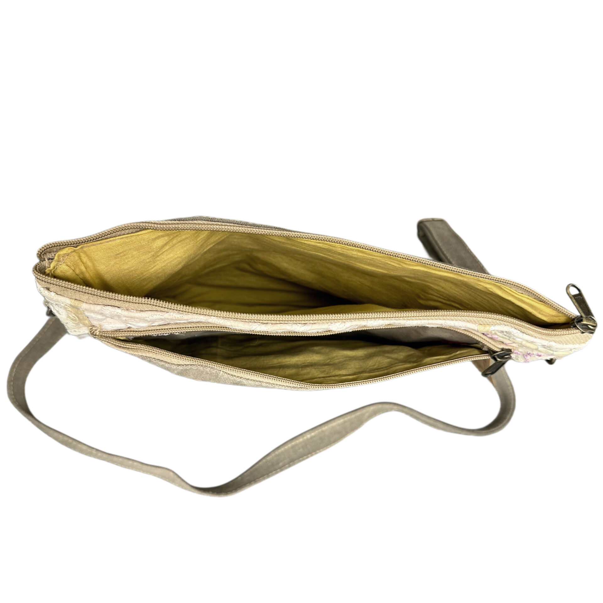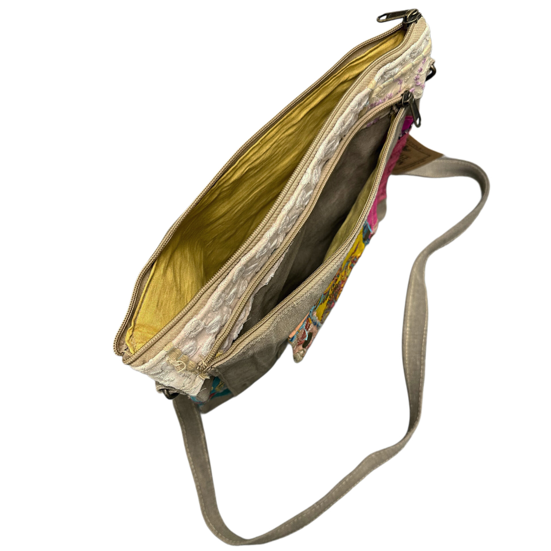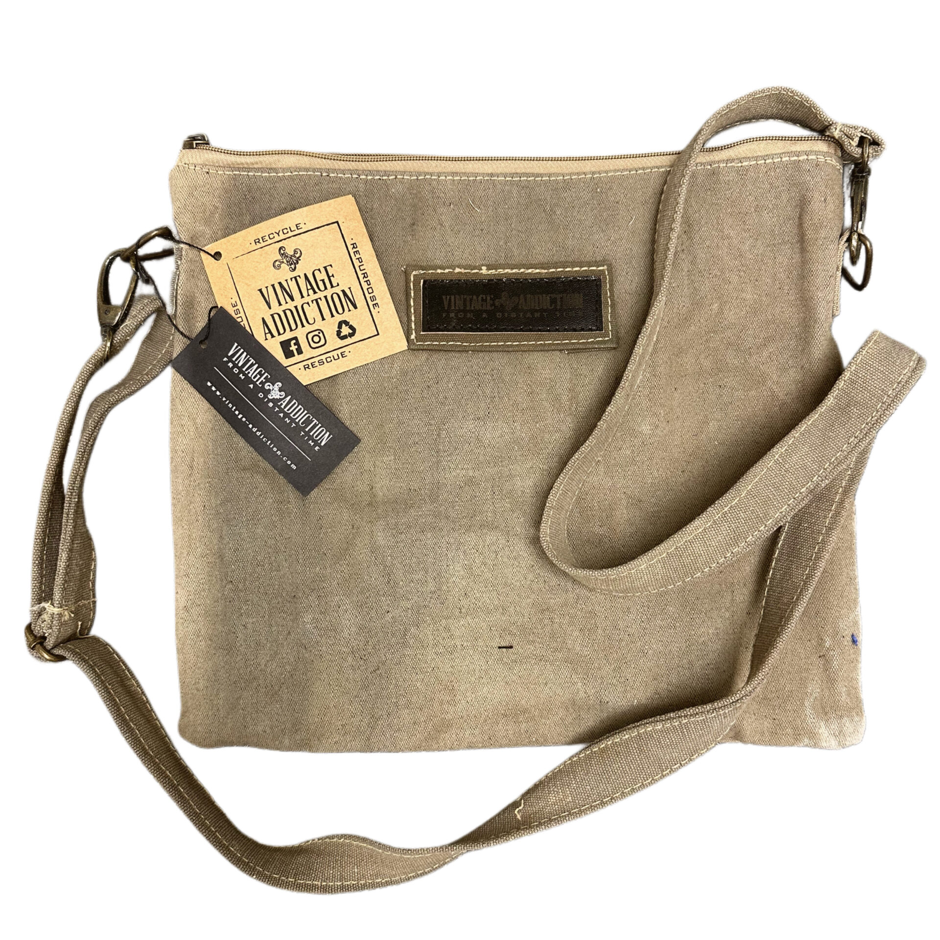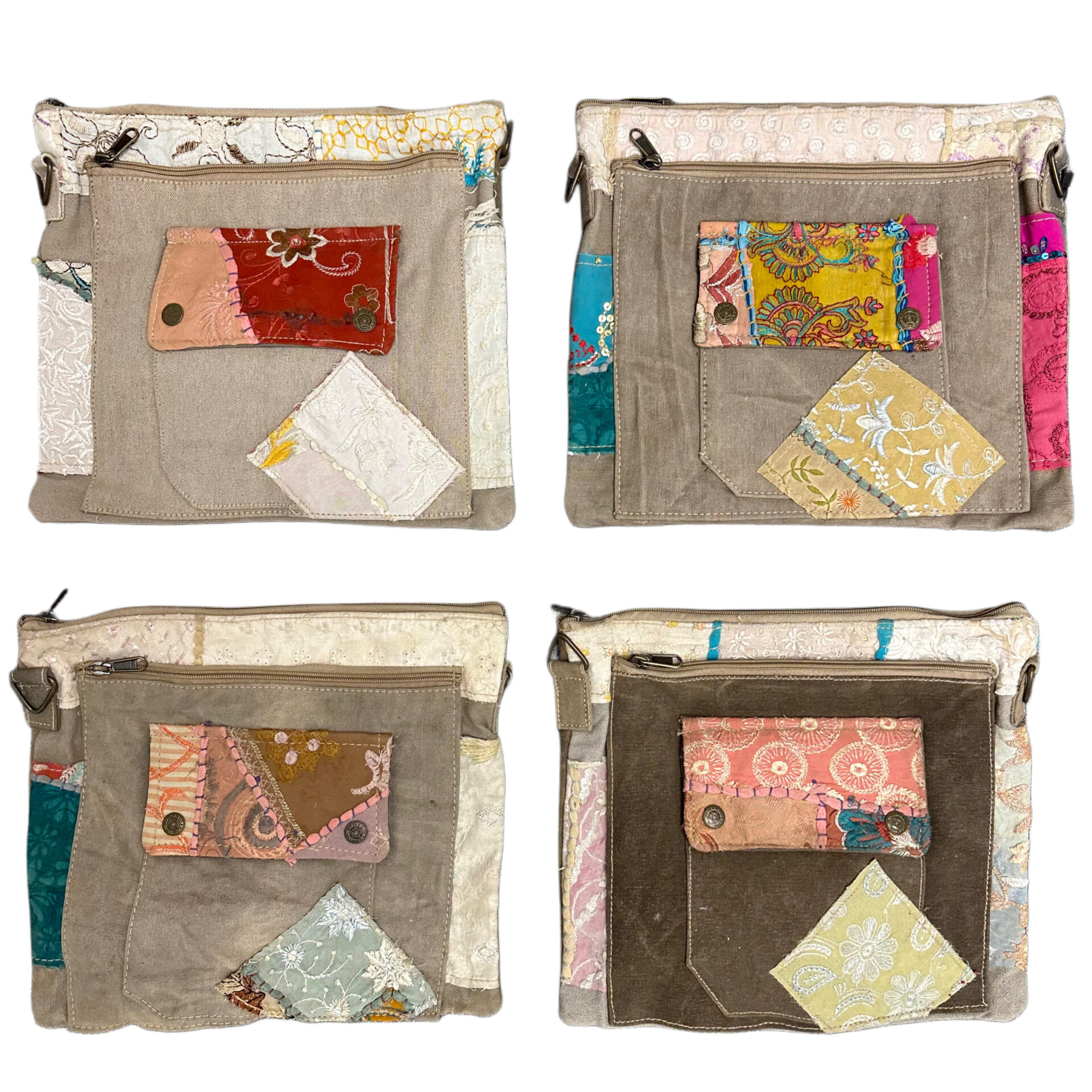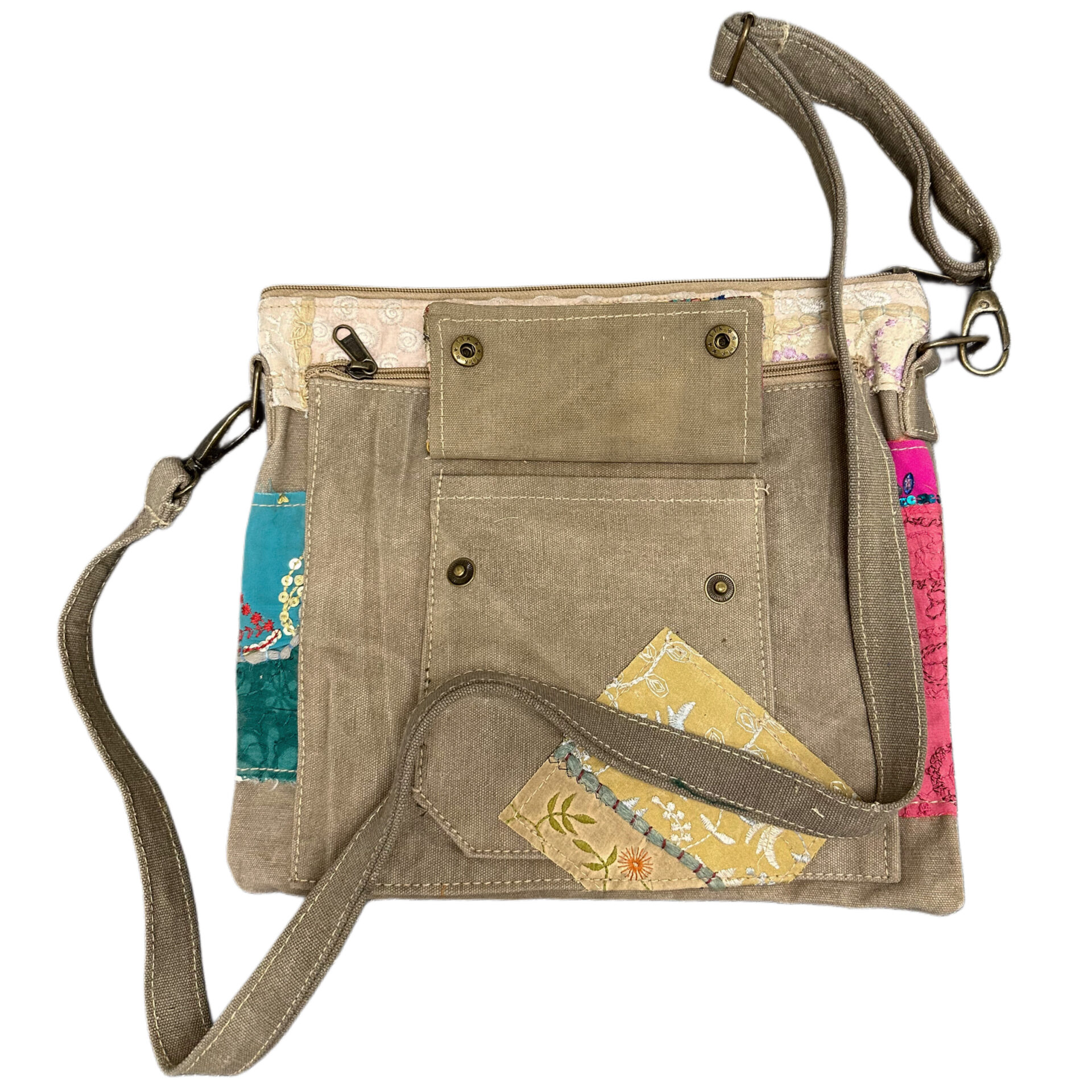 Our recycled military tent crossbody features decorative vintage fabric patchwork trim, a zipped top, 1 exterior front pocket with snap closure, an adjustable shoulder strap.
