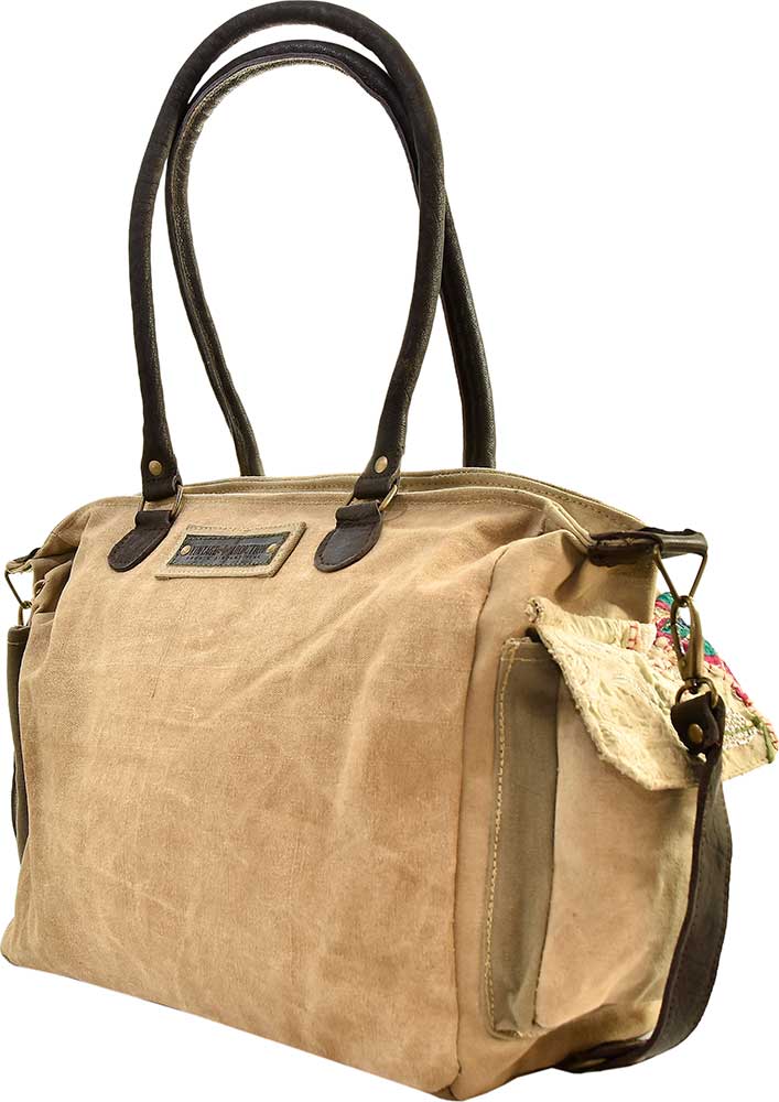 Our recycled military tent shoulder bag features a top main zipper, 2 front and 2 side exterior pockets with magnetic snap closure, 1 open interior pocket, decorative-only side straps, leather handles, and is fully lined.