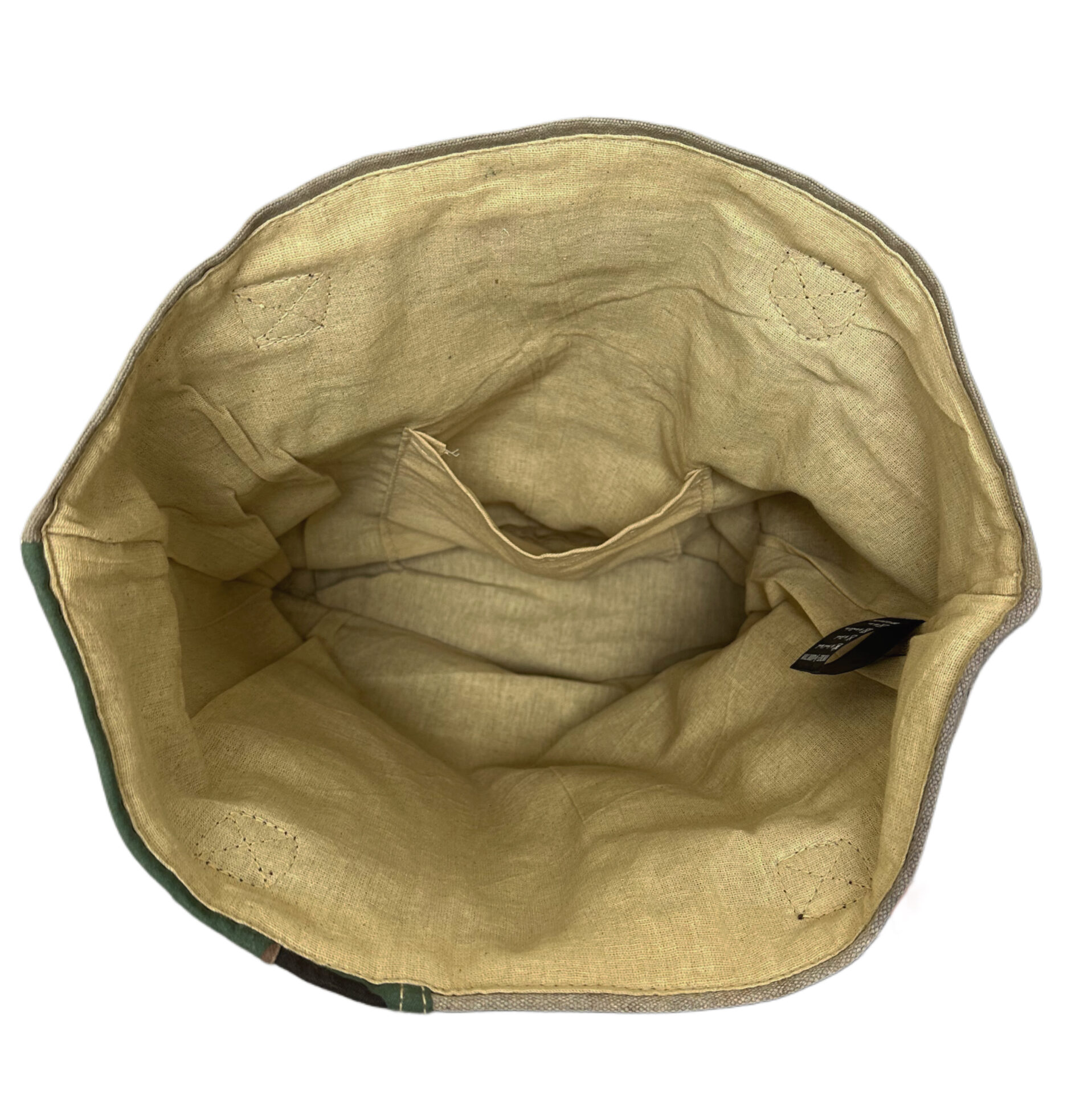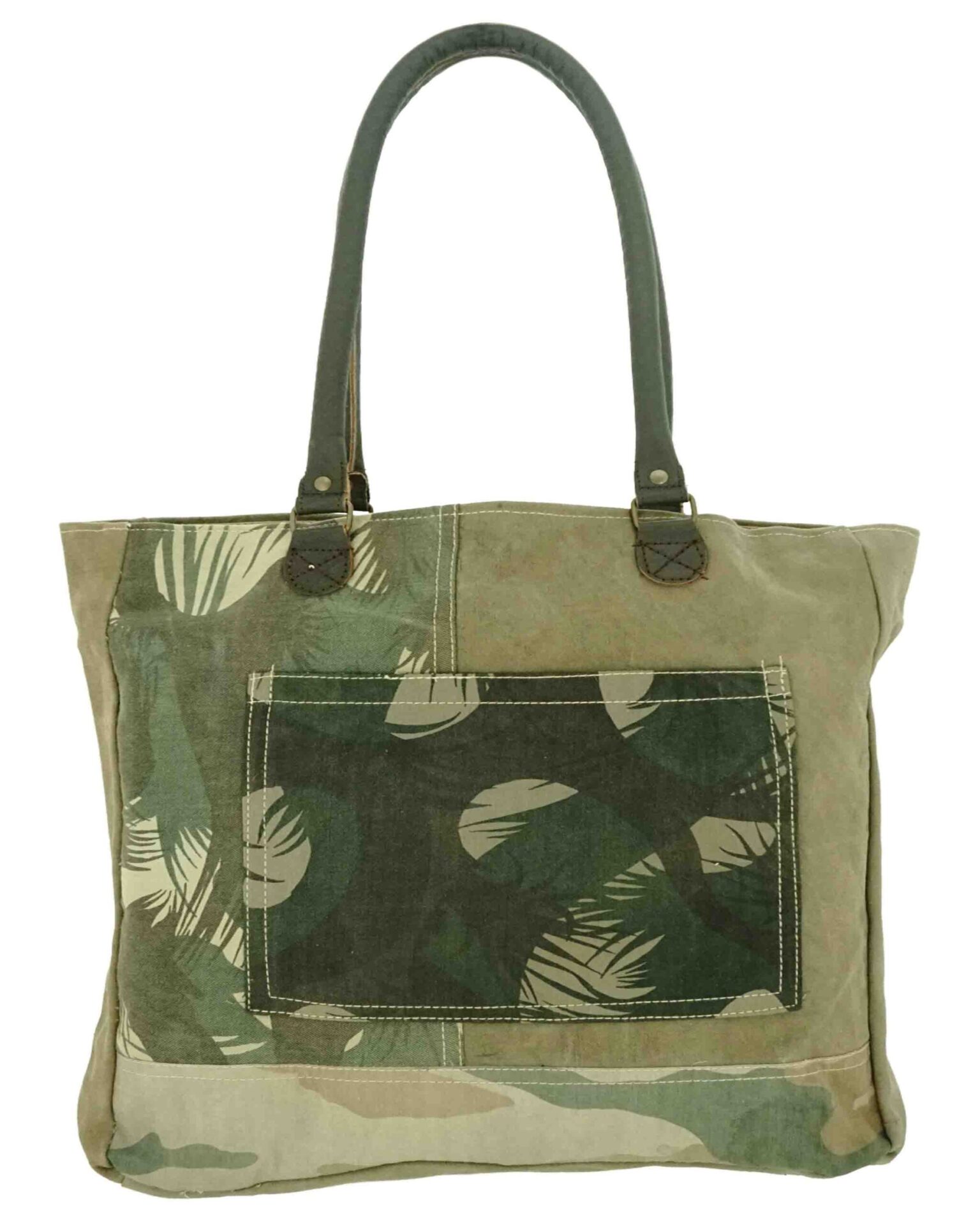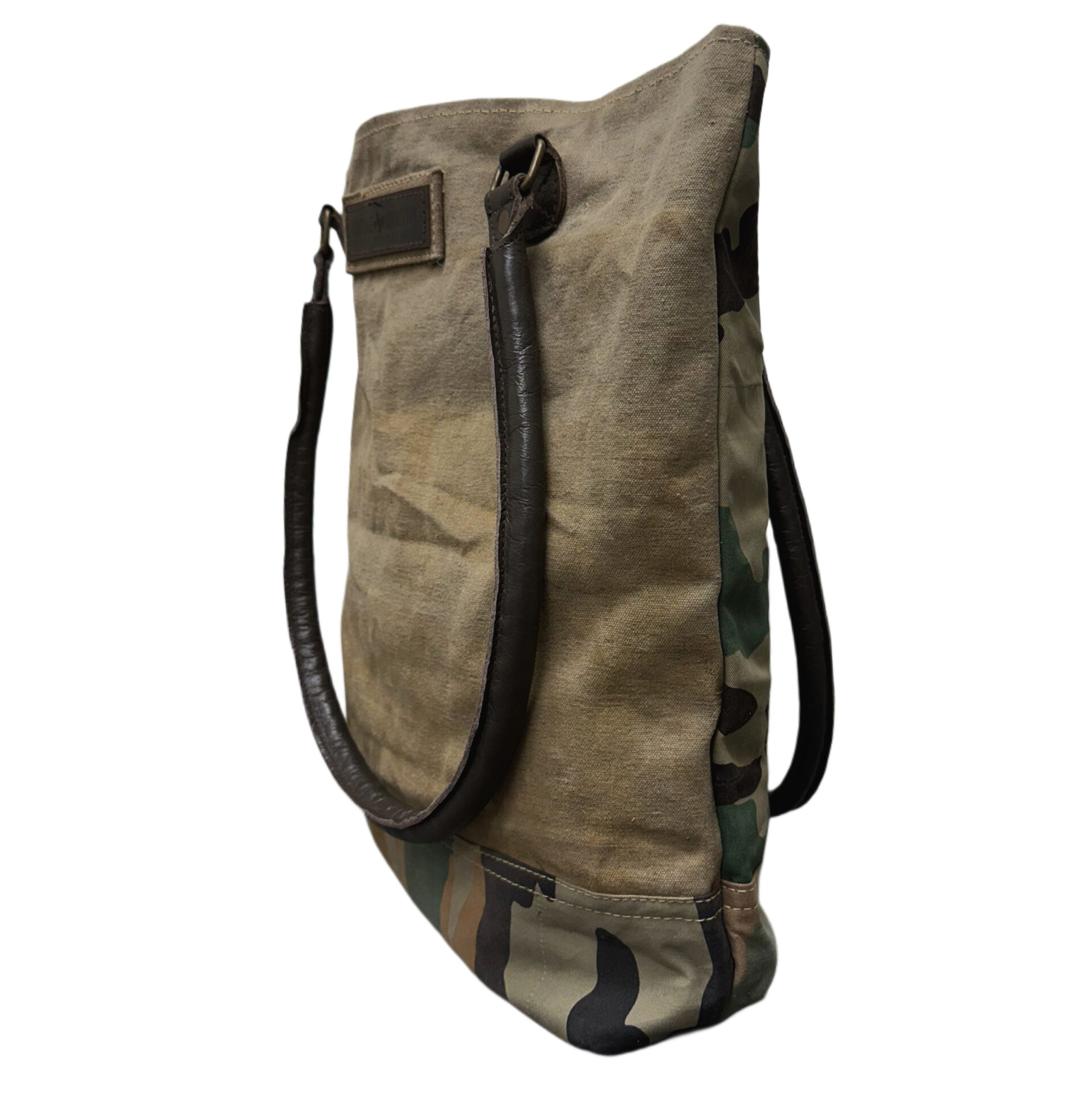 Our tent tote is handcrafted with recycled military tent fabric and accented with repurposed camouflage with leather handles. It has an open top, an an oversized open camo pocket on front with 1 interior open pocket, and is fully lined.