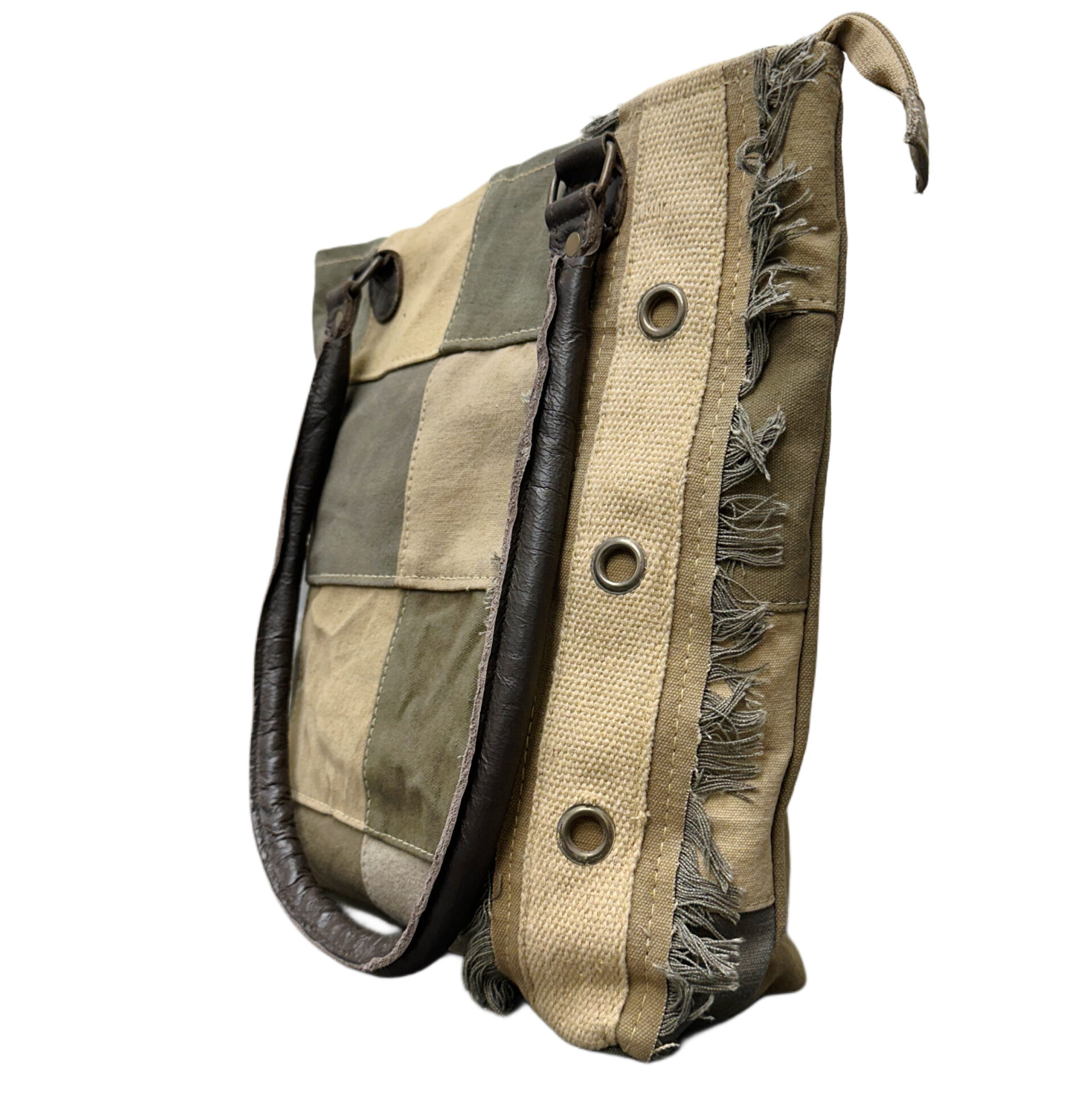 DISCLAIMER: Our recycled military tent bags are a tribute to and a reminder of the sacrifices and contributions of military veterans. Please know that these bags are made from authentic used military tents and are not brand new canvas packaged as recycled tents or tarps. THESE ARE THE REAL DEAL!! As a result, the tent material will show signs of worn-like imperfections which add to its character. Each bag has differences in genuine imperfections, stains, and colors. Your bag will be as unique as each soldier’s experience when seeking shelter in these tents whether in the training field or in a combat zone. All Sales are Final.