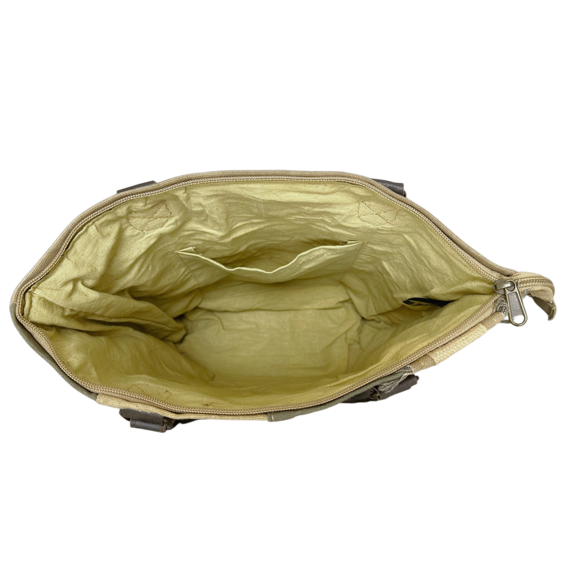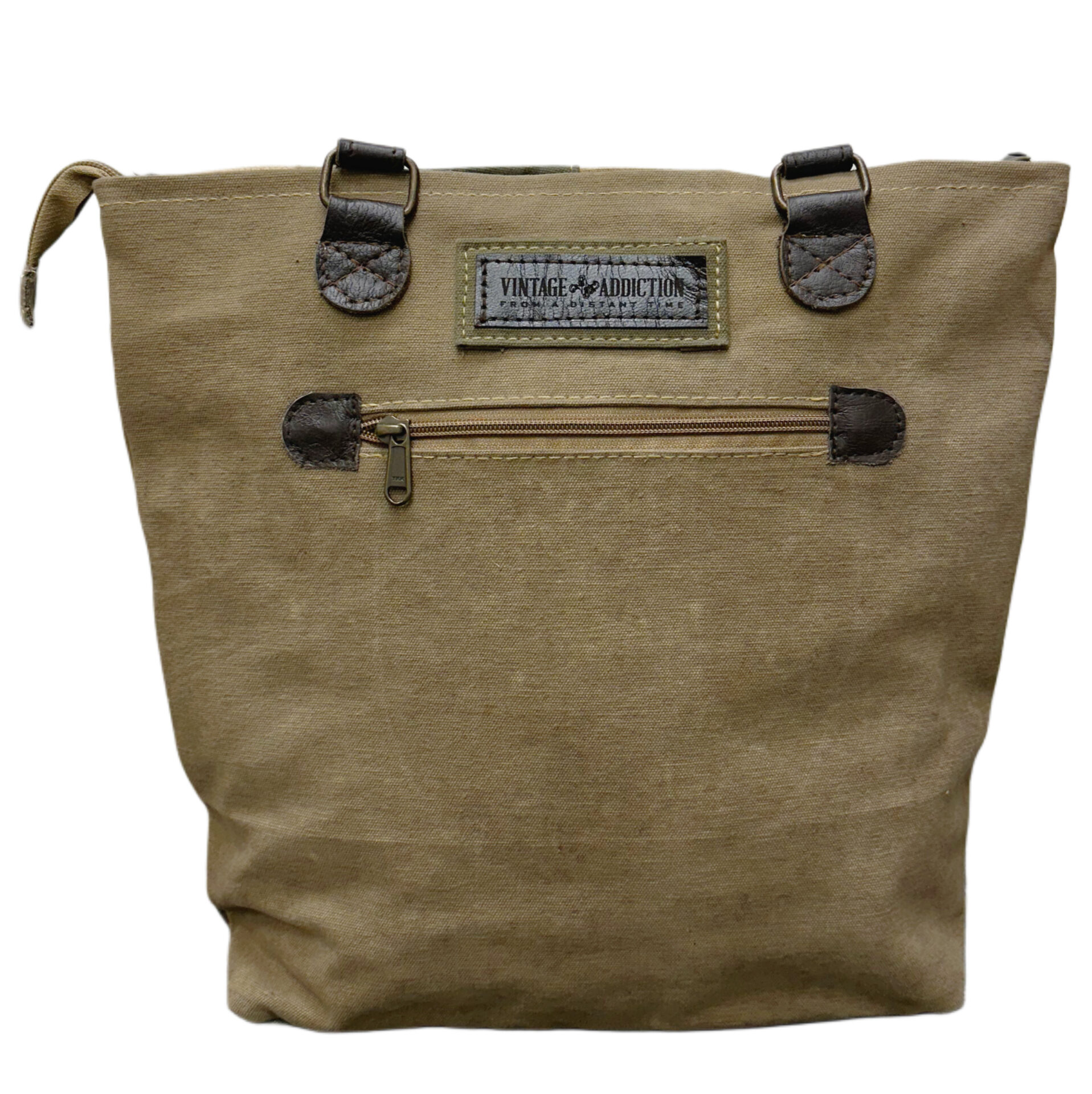 Our tent tote is handcrafted with recycled military tent fabric in a patchwork design on front. It has a zipper top, and 1 zipper compartment in back, 1 interior open pocket, and is fully lined.