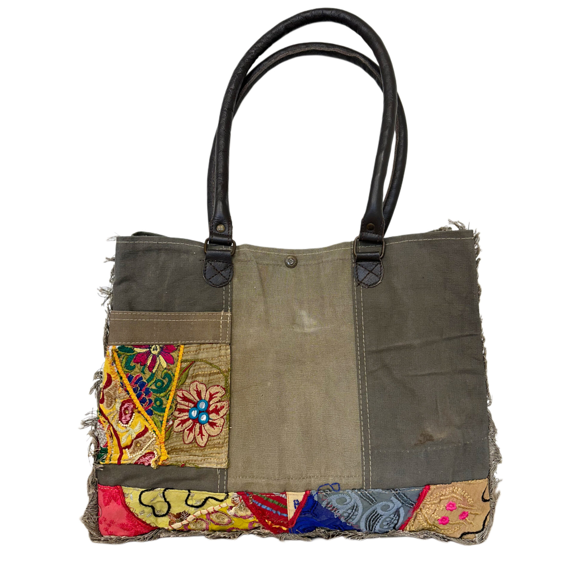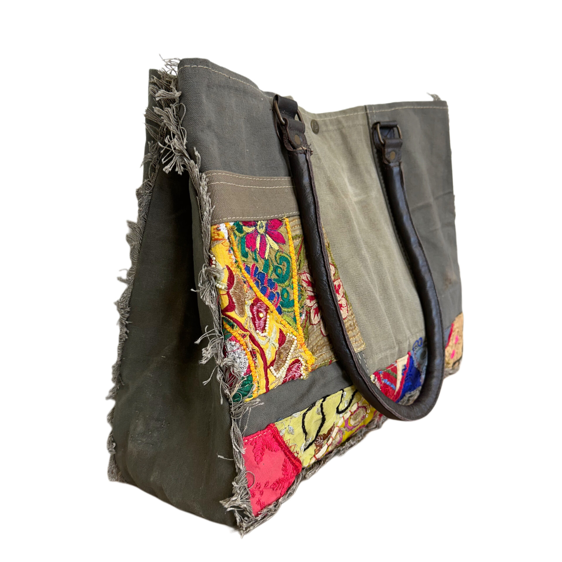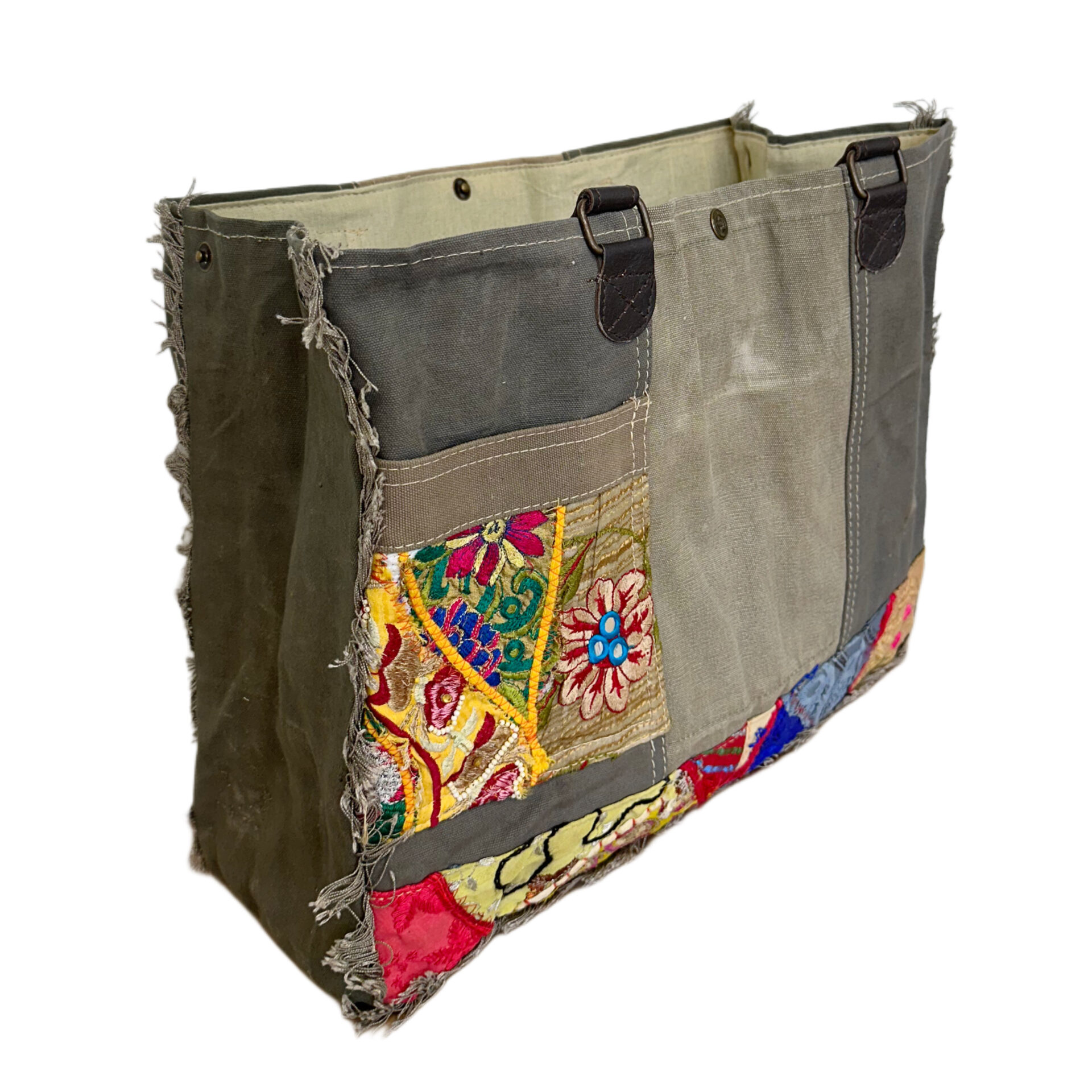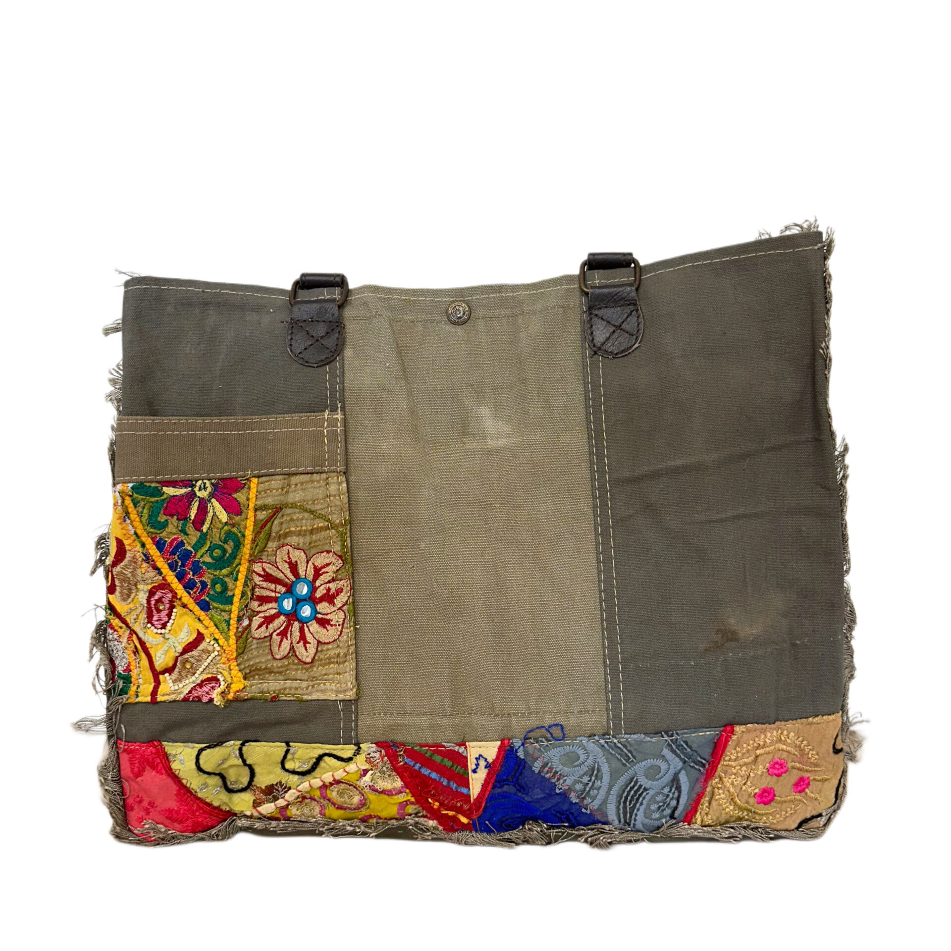 This hand selected eco-conscious handbag combines rugged durability with artisanal flair. Made from recycled military tents adorned with vintage embroidered beaded patchwork. The genuine leather handles offer a comfortable grip. The snap closures keep your essentials secure. Exterior pocket is perfect for easy access. Interior pocket.