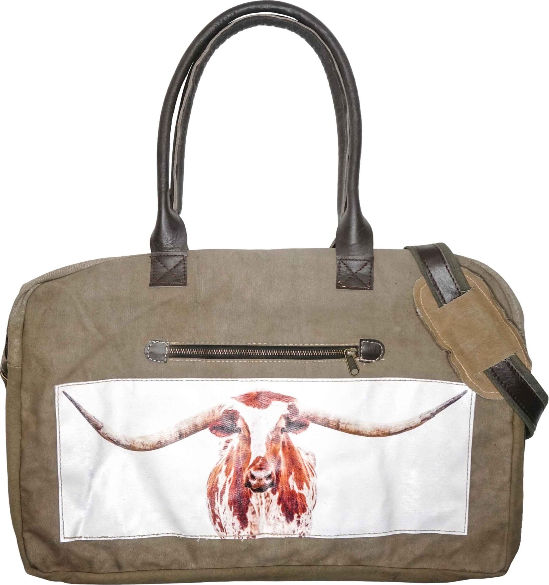 Our eco-friendly duffle bag is handcrafted from recycled military tents making each bag slightly unique. Bag is fully lined, features vintage-inspired prints as well as a generous zippered compartment on the back exterior and a zipper pocket on the front exterior. The interior has two pockets, one zipped and one open pocket. Each has durable genuine leather handles and an adjustable shoulder strap.