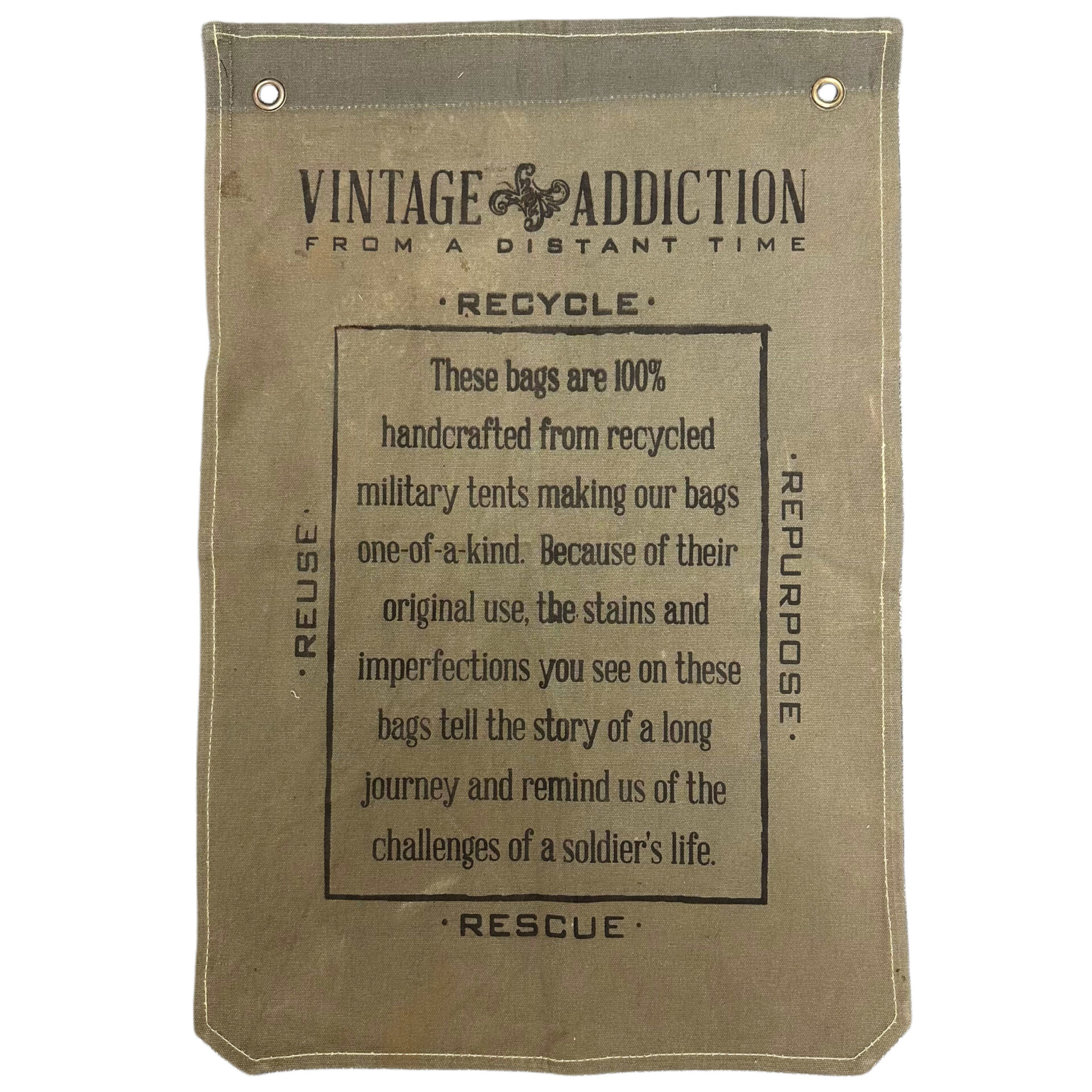 DISCLAIMER: Our recycled military tent bags are a tribute to and a reminder of the sacrifices and contributions of military veterans. Please know that these bags are made from authentic used military tents and are not brand new canvas packaged as recycled tents or tarps. THESE ARE THE REAL DEAL!! As a result, the tent material will show signs of worn-like imperfections which add to its character. Each bag has differences in genuine imperfections, stains, and colors. Your bag will be as unique as each soldier’s experience when seeking shelter in these tents whether in the training field or in a combat zone. All Sales are Final.