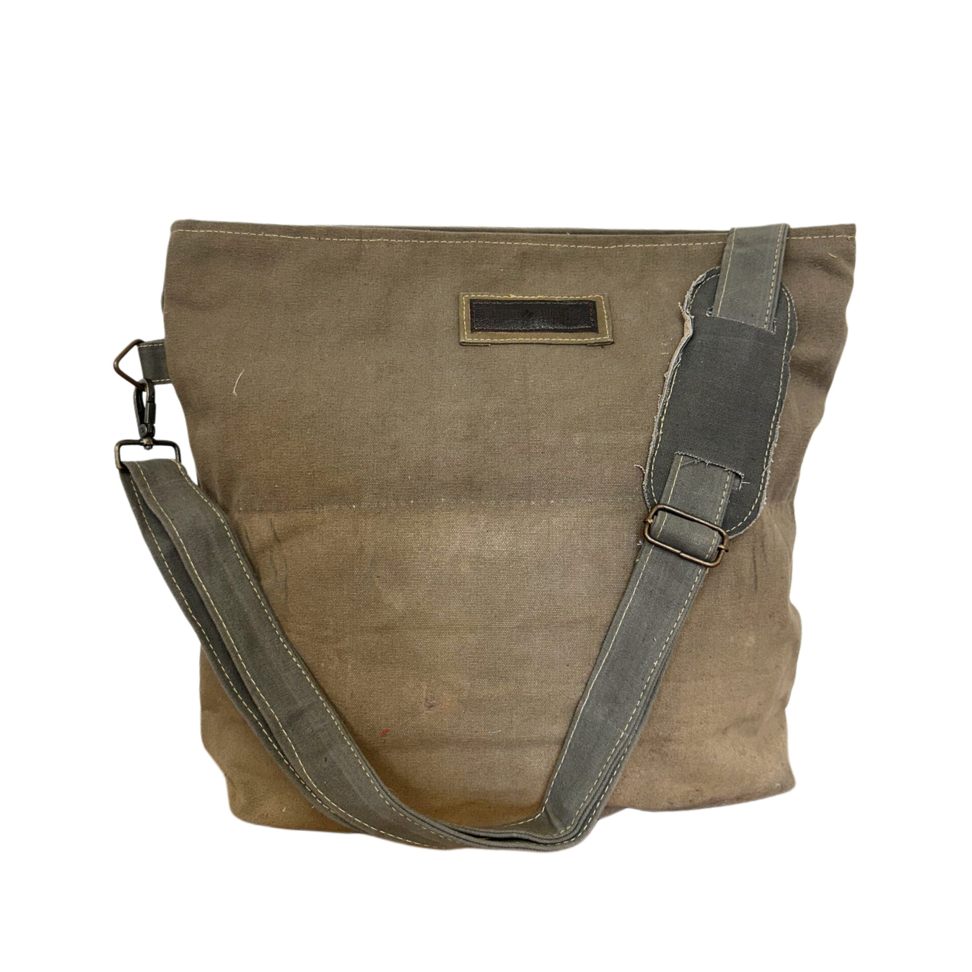 DISCLAIMER: Our recycled military tent bags are a tribute & a reminder of the sacrifices & contributions of military veterans. Please know that these bags are made from authentic used military tents not brand-new canvas packaged as recycled tents or tarps. THESE ARE THE REAL DEAL! The tent material will show signs of worn-like imperfections which add to its character. Each bag has differences in genuine imperfections, stains, and colors. Your bag will be as unique as each soldier’s experience when seeking shelter in these tents whether in the training field or in a combat zone. Vintage fabrics are not repaired, they will have distinctive characteristics of worn threads, sequins or beadwork. You will receive this bag. All Sales Final