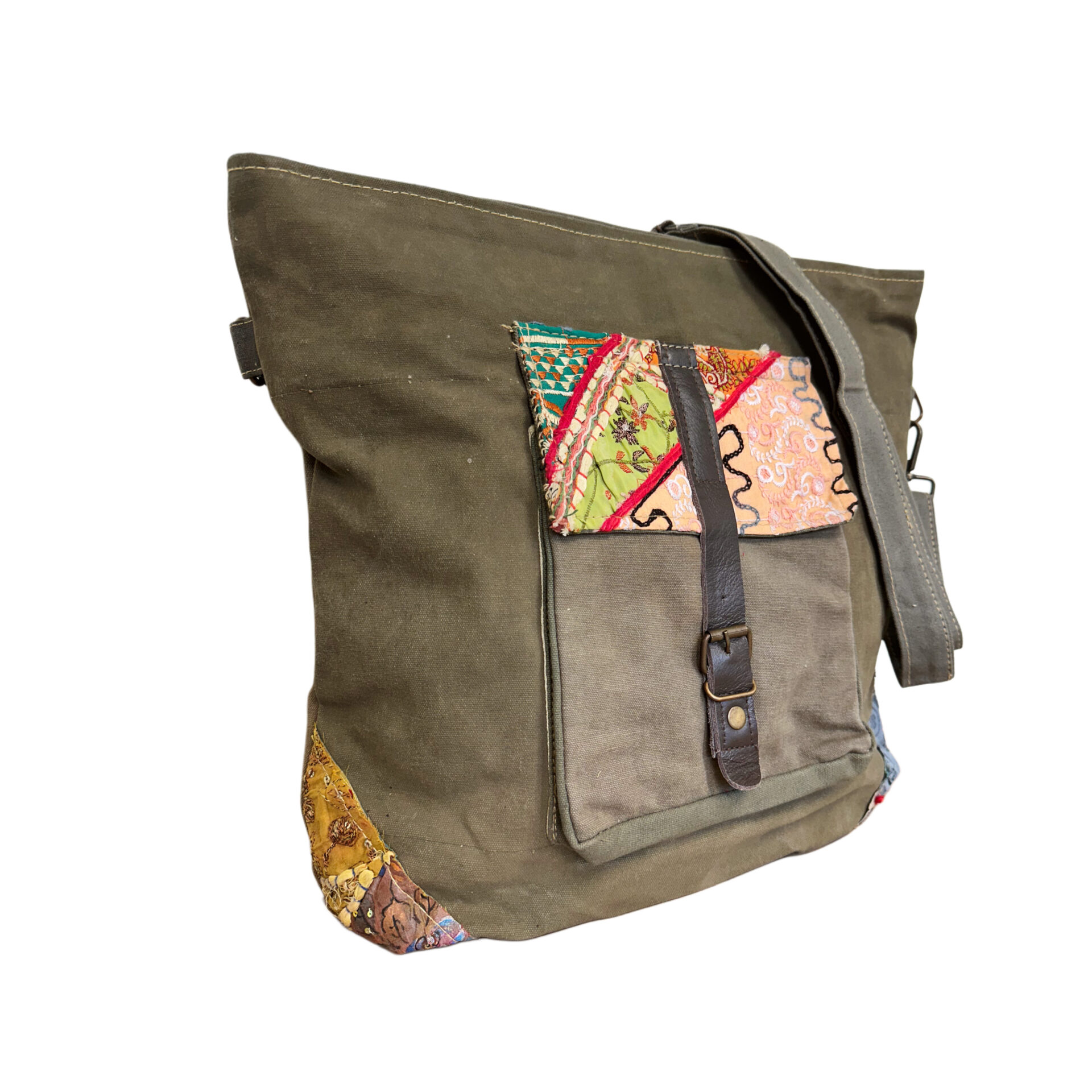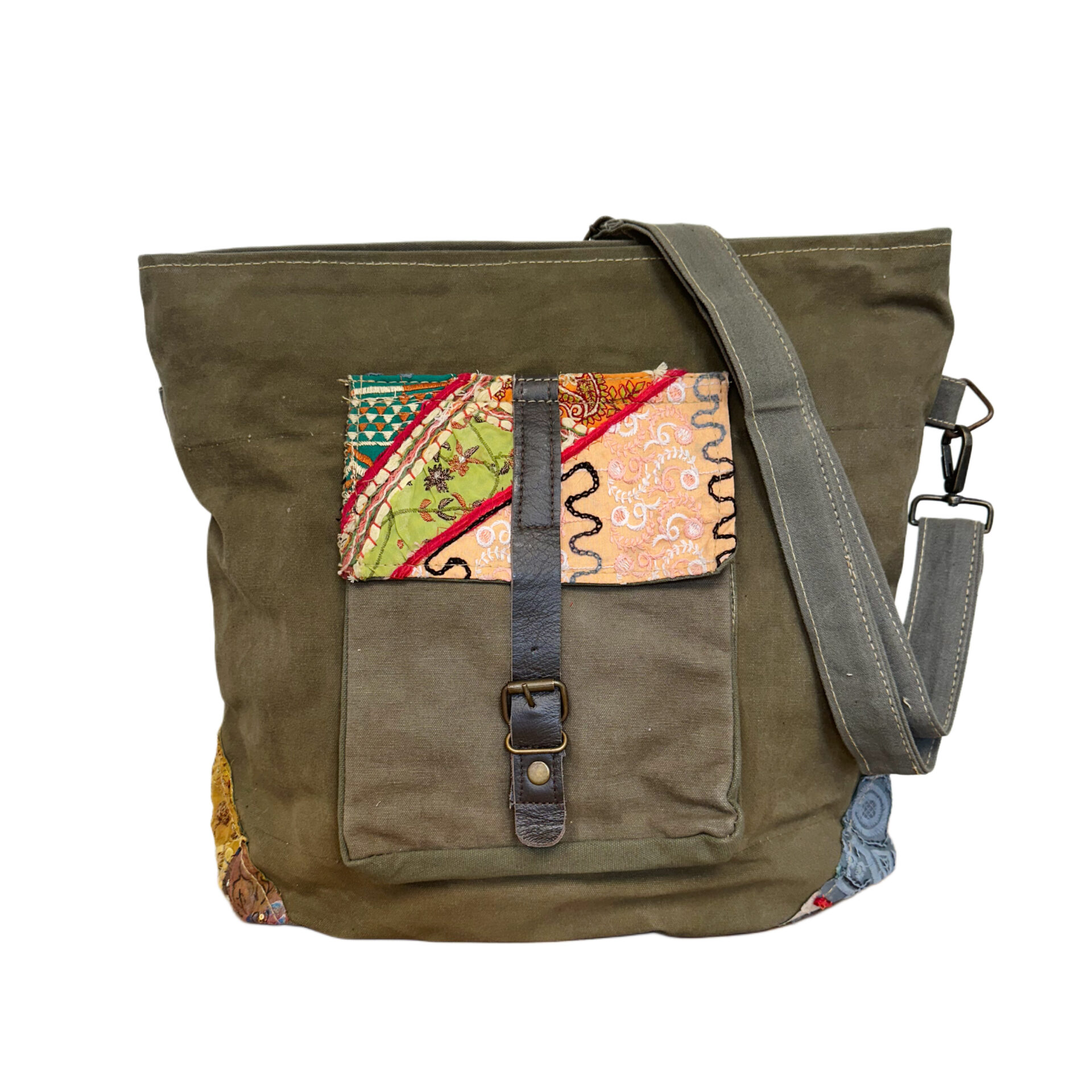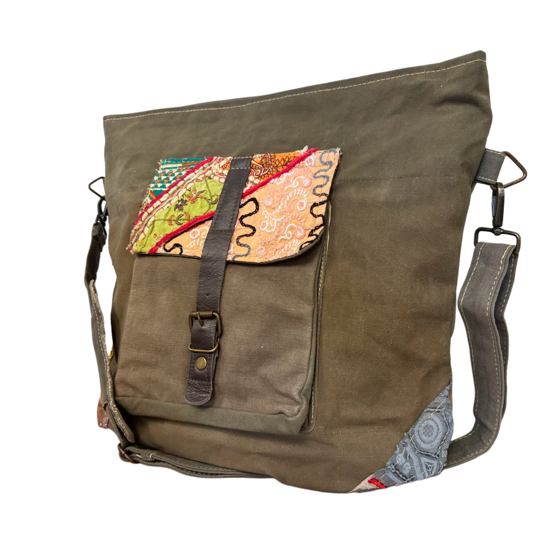 This hand selected large crossbody is perfect for on-the-go. The recycled military tent is accented with vintage fabric, has a zipped top, exterior front pocket with buckle-style closure, 1 interior zipped pocket & a 56″ adjustable strap. 15″W x 4″D x 17″L