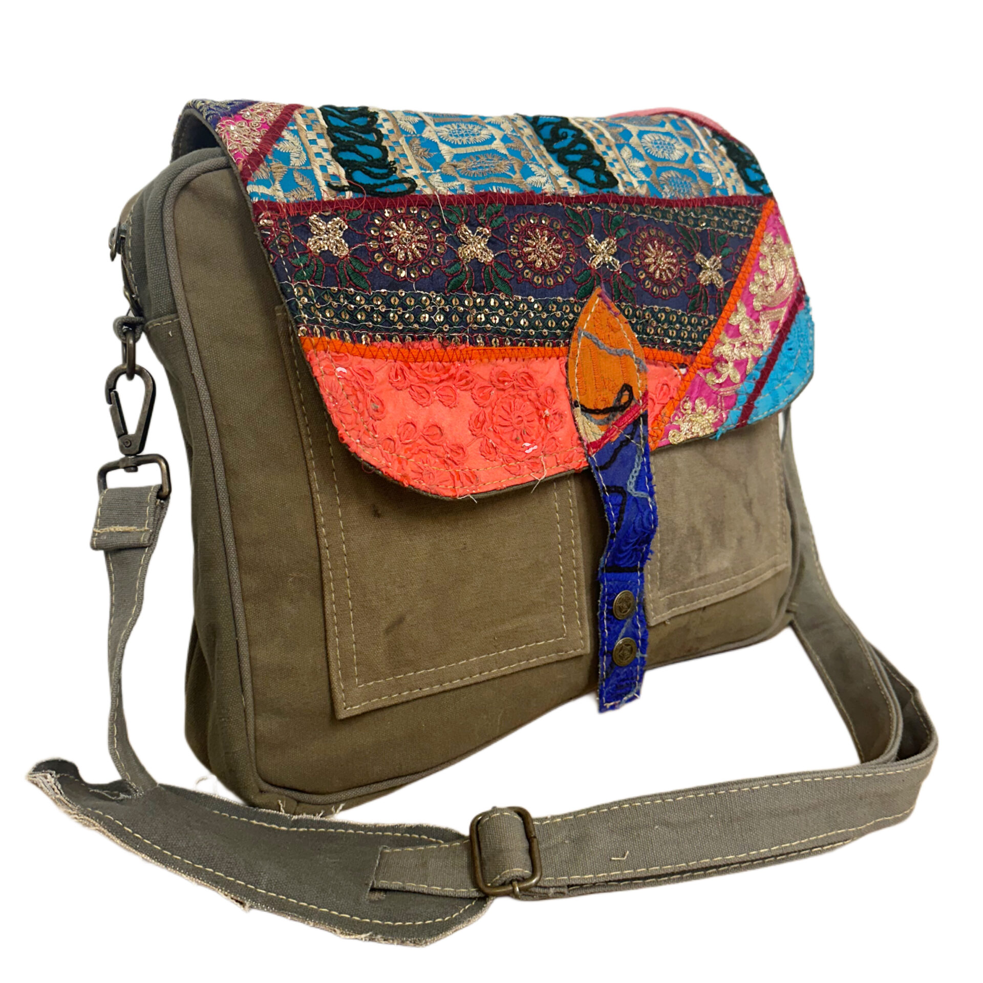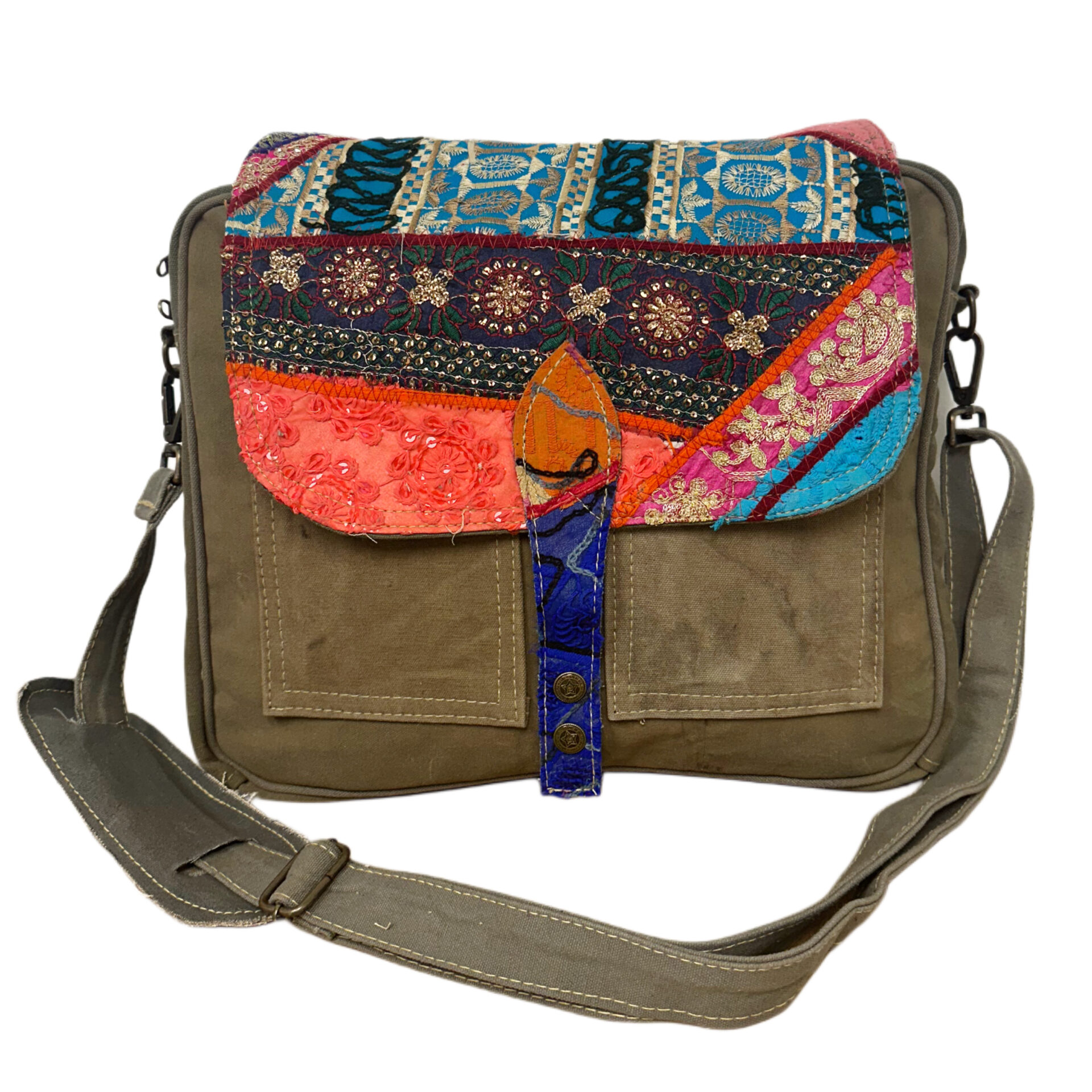 Receive this selected crossbody/messenger bag made with recycled military tent & vintage textiles, fully lined with padded compartment for laptop/tablet. This bag has a vintage fabric embellished flap w/snap closure & a zipper top closure under the flap, 2 open pockets on the front with flap & a zipper pocket on the back the length of the bag. 14″W x 11″H x 3″D/Removable 56″ extendable strap w/shoulder pad.