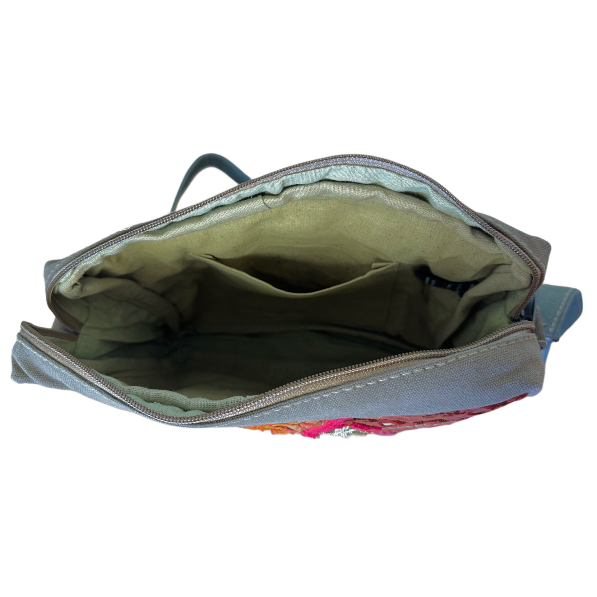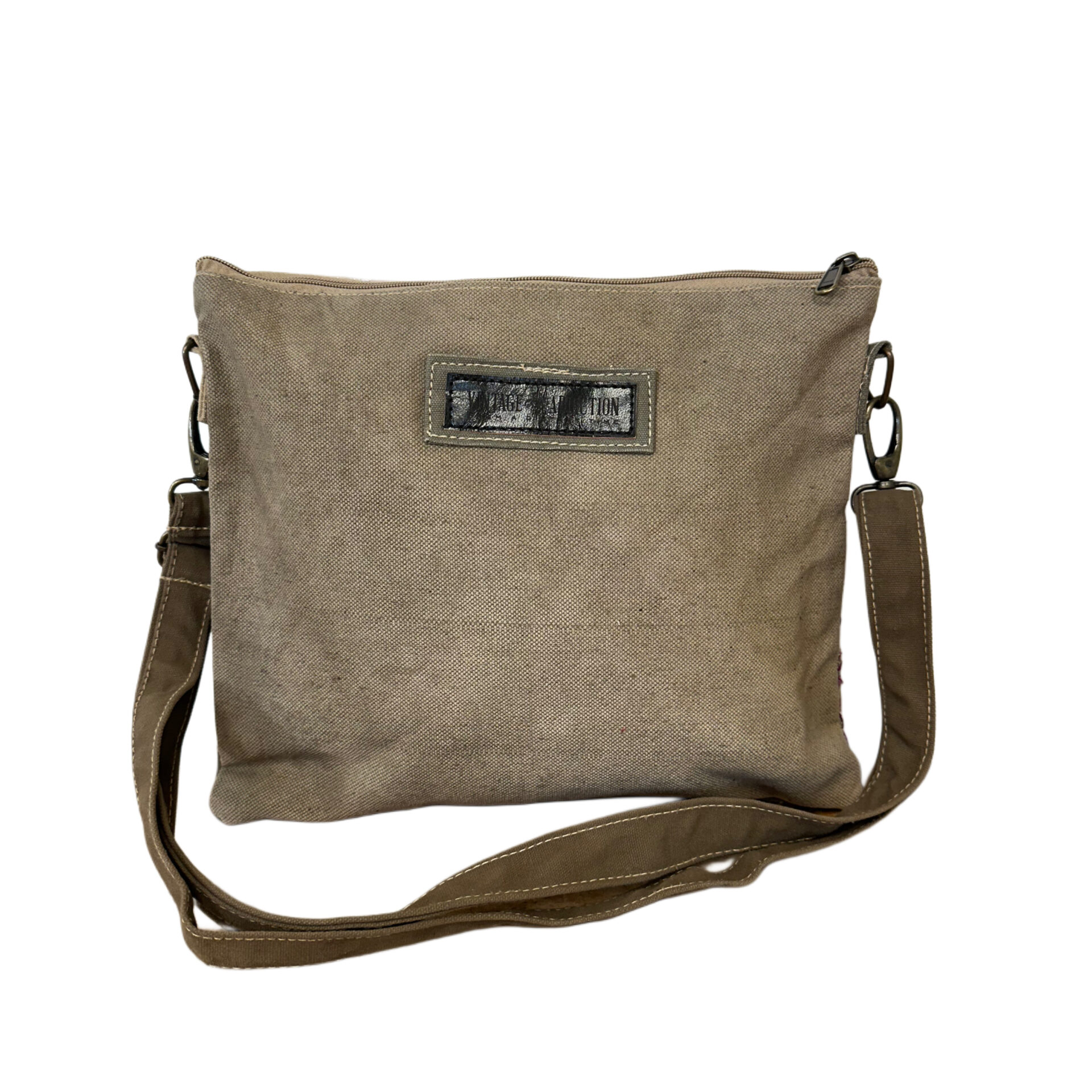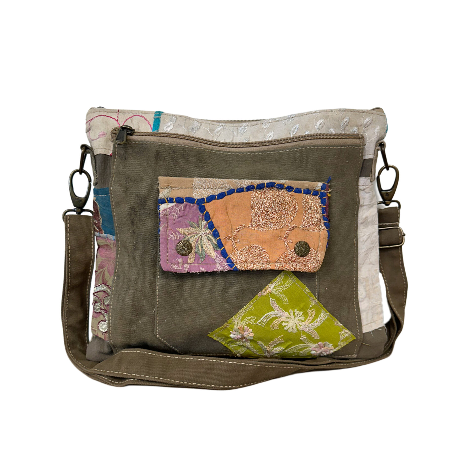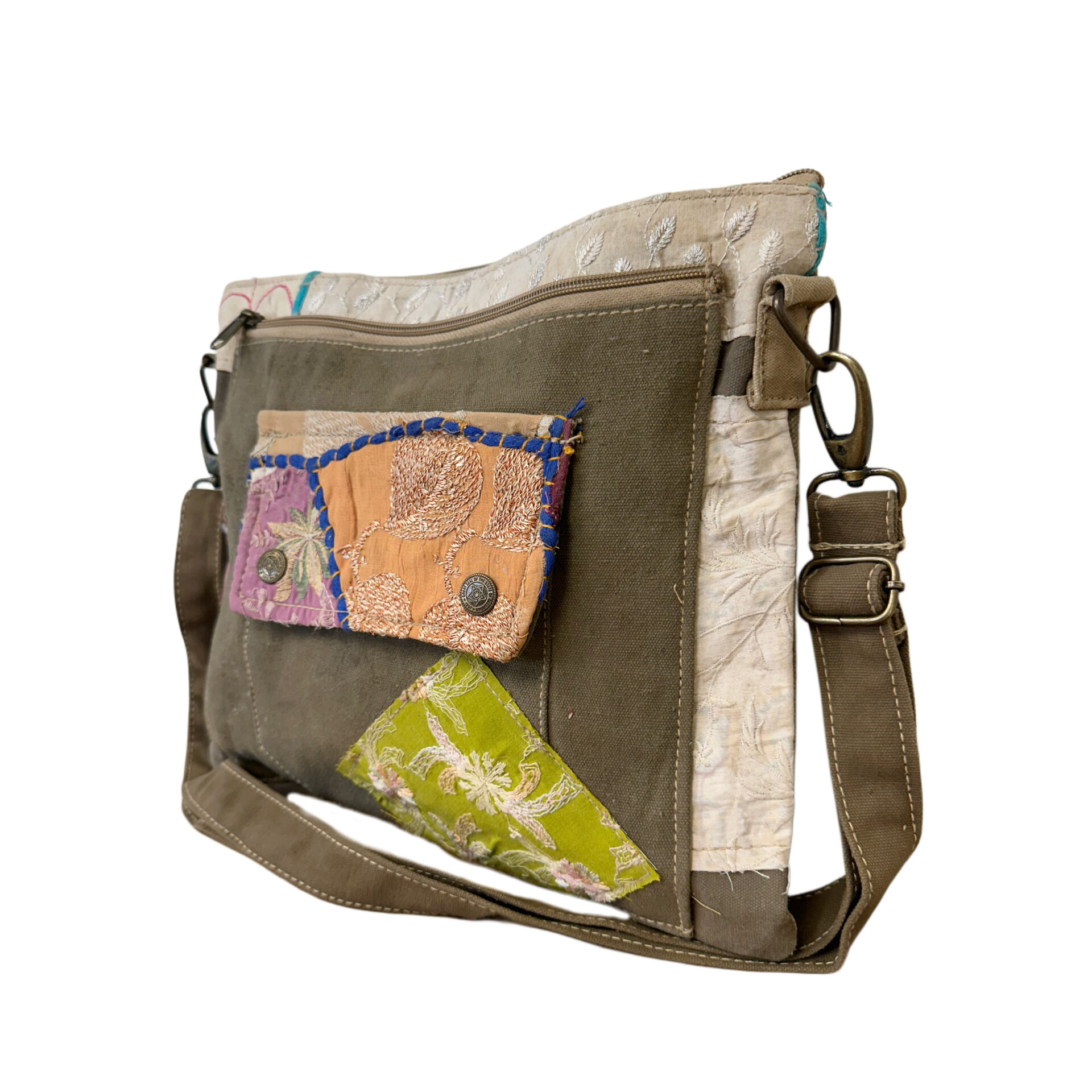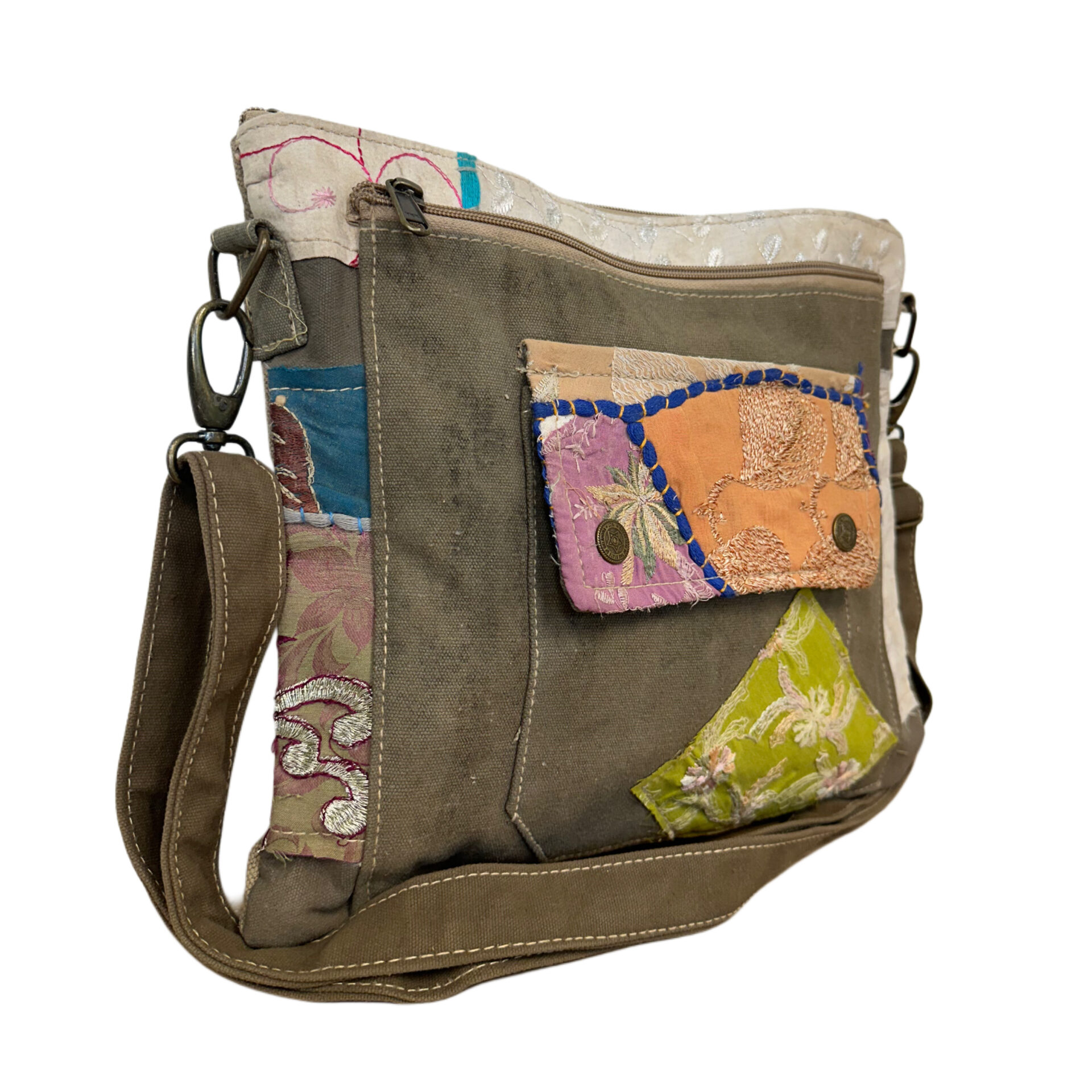 This Hand Chosen recycled military tent crossbody features decorative vintage fabric patchwork trim, a zipped top, 1 exterior front pocket with snap closure, an adjustable shoulder strap.