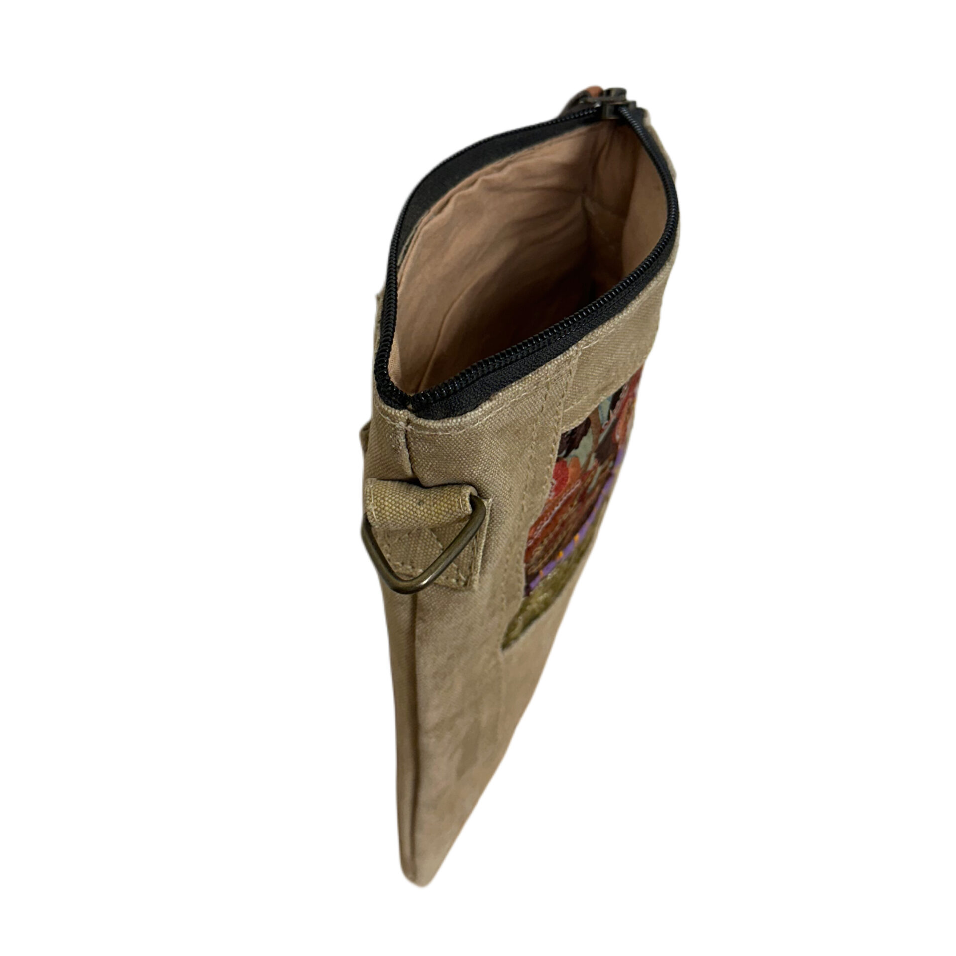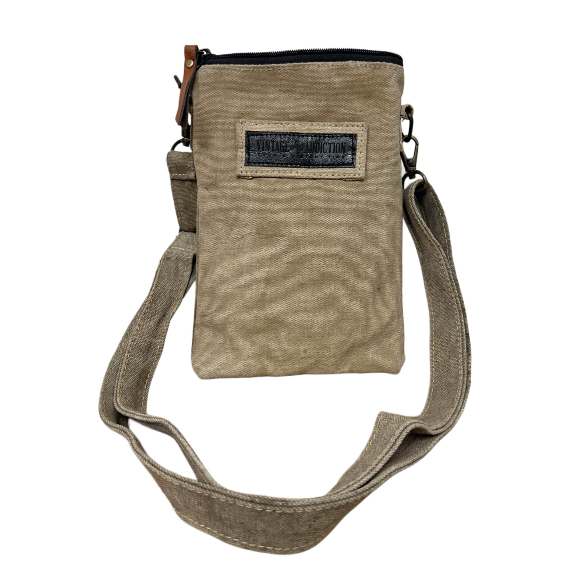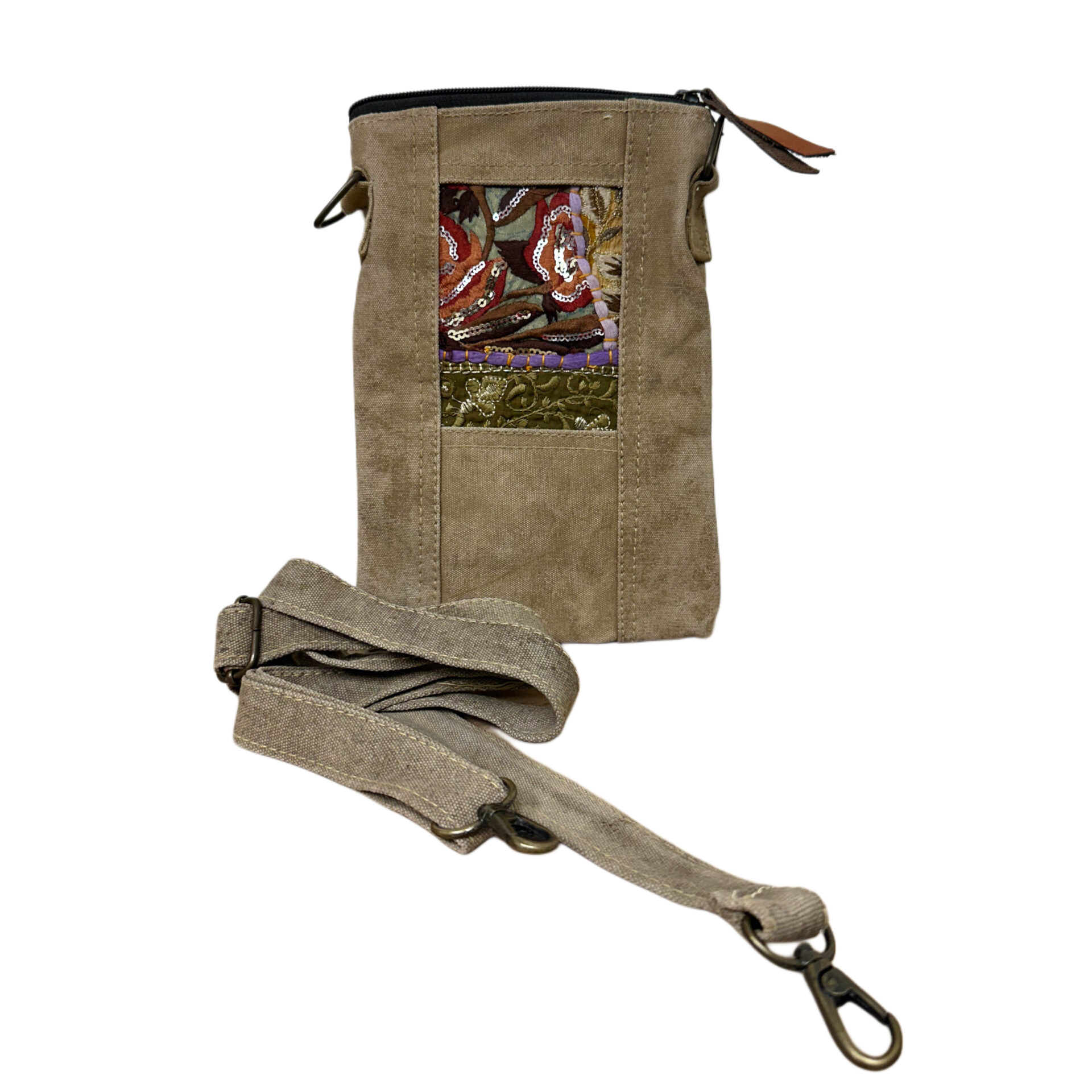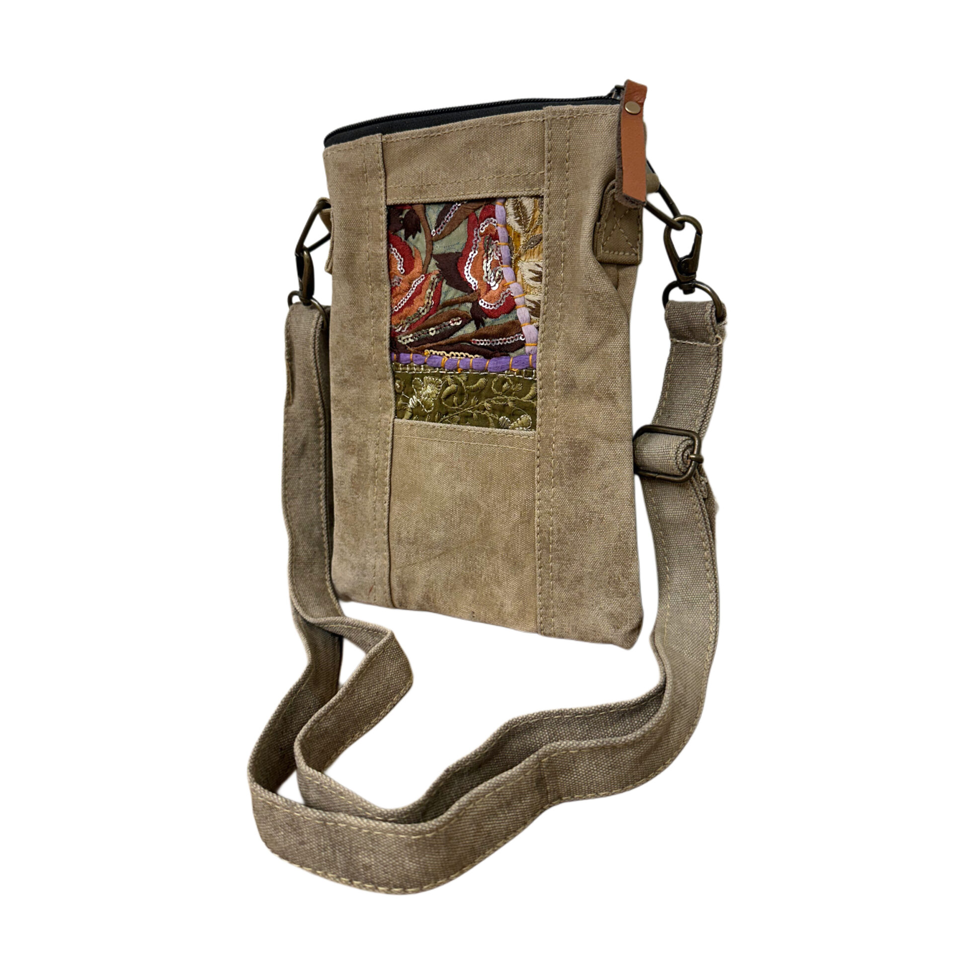 A small but mighty crossbody crafted from authentic recycled military tent canvas and elevated with a vibrant patch of vintage hand-crafted fabric. Each patch is cut from remnant sari textiles—bringing a pop of color, culture, and artistry to this compact everyday bag. Perfect for carrying your essentials while keeping your hands free and your style unique.