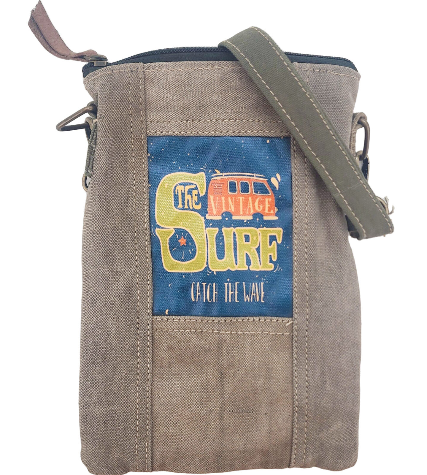 Cute small recycled military tent crossbody adorned with a print patch on the front. Perfect to carry the very basics!