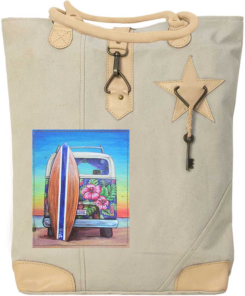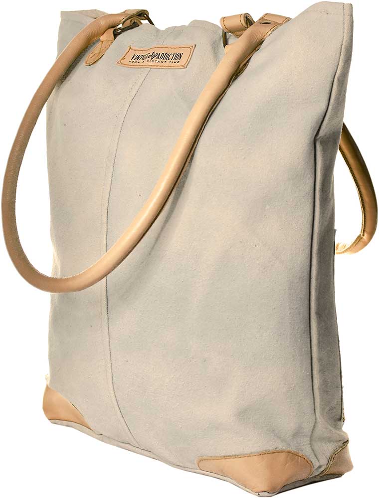 Our recycled-canvas tote bag is fully lined, has an interior pocket, is adorned with appliques and vintage print patches, and has durable leather handles and trim. NOTE: Due to the recycled nature of the fabric, canvas may show signs of worn-like imperfections which add to its character. There will be variations in color.