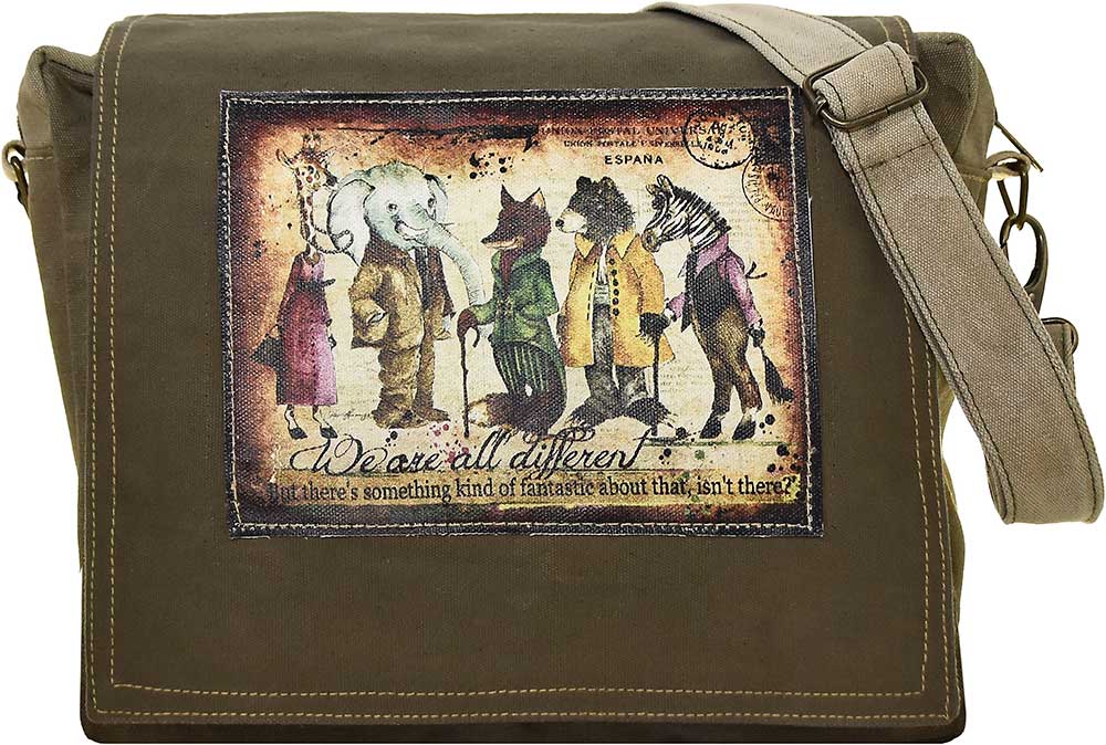 Our recycled military tent cross body features a print patch on the front flap. Top Zipper, 1 interior zipped pocket, fully lined.