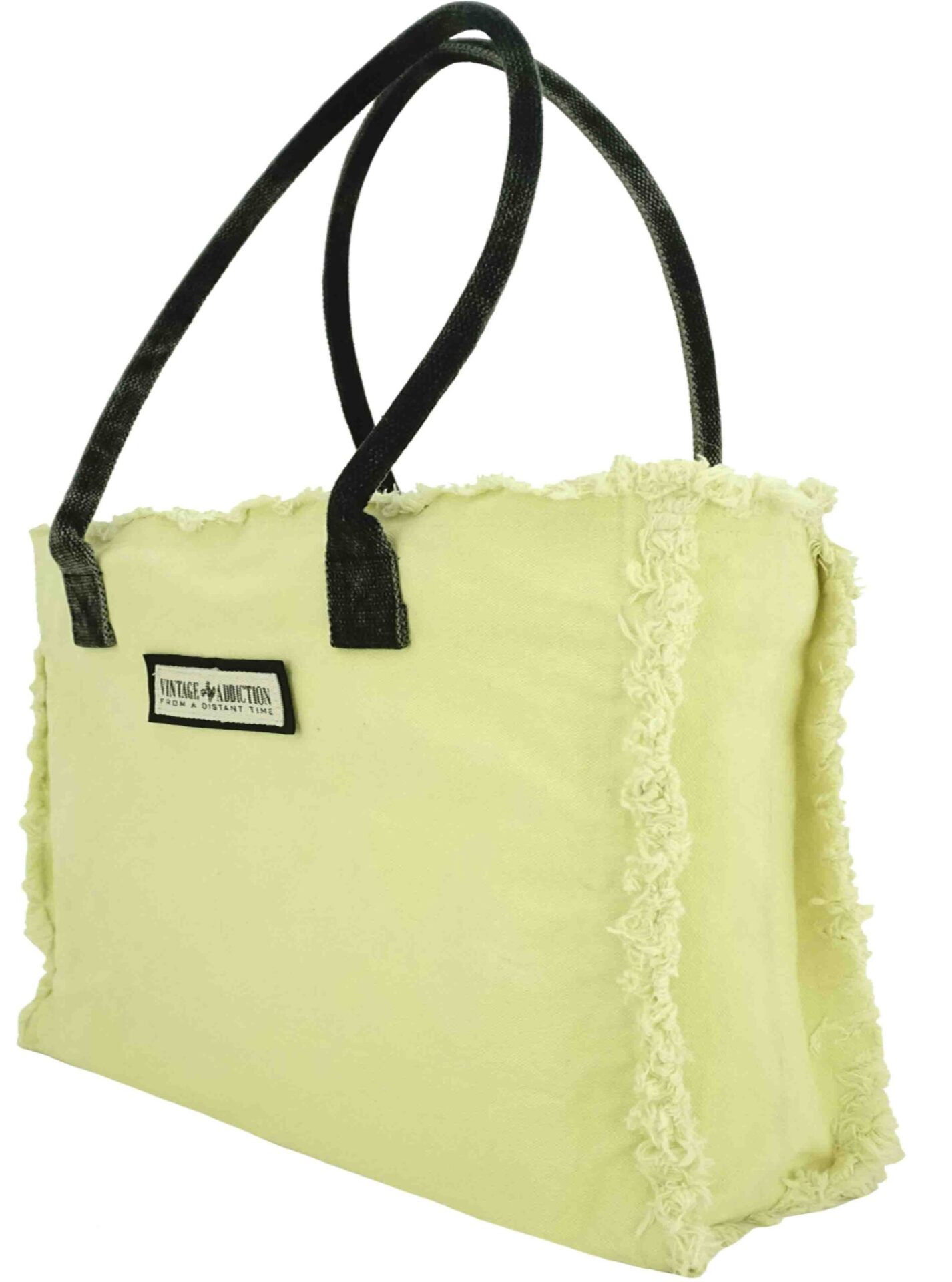 Due to the recycling nature of the fabric, there will be signs of worn-like imperfections and variations in fabric color. Each bag is individually hand-screened therefore printed impressions will vary in color tone.